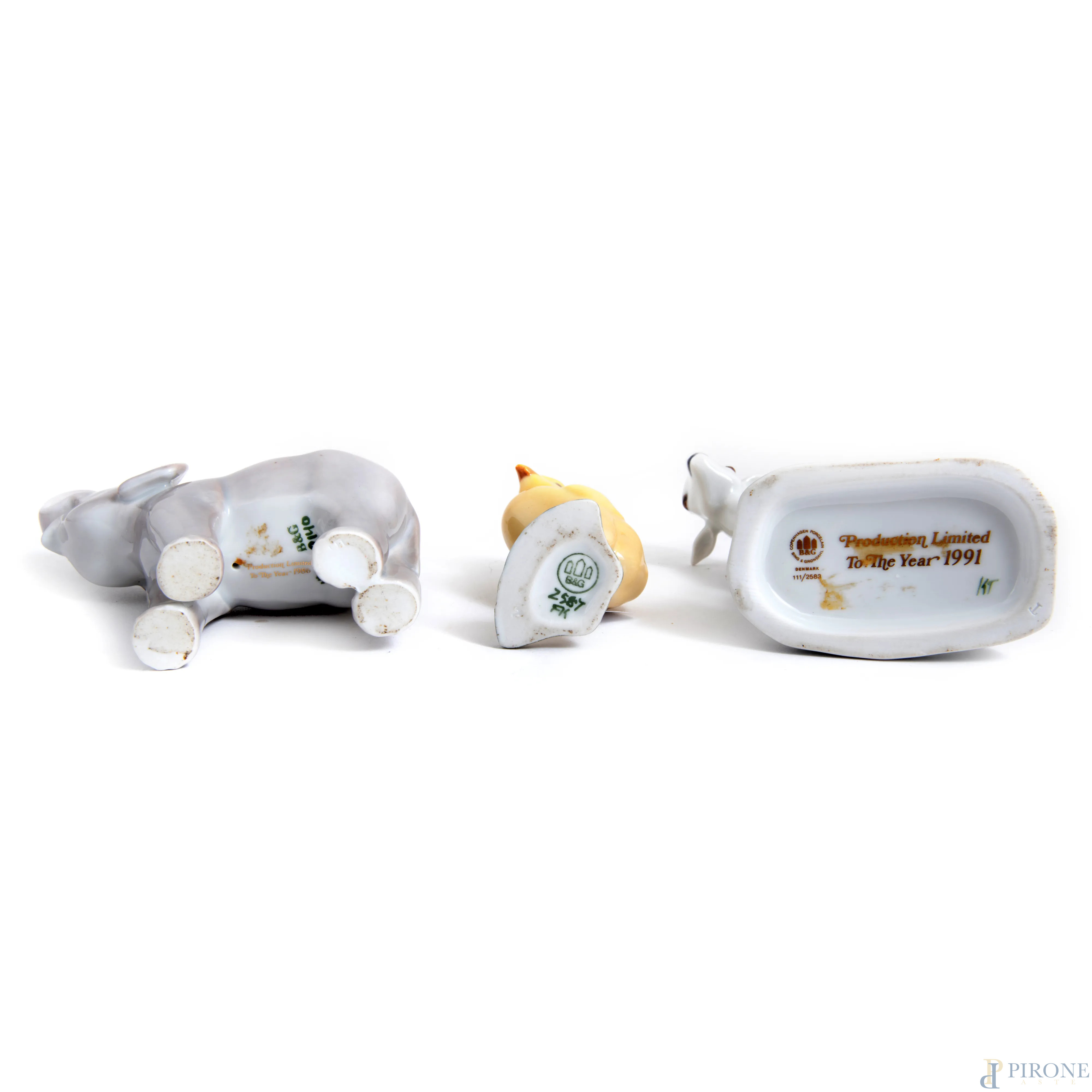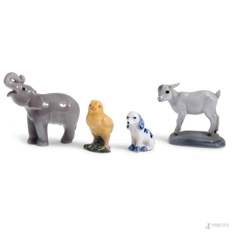 Lotto di quattro sculturine in porcellana raffiguranti animali, XX secolo, misure massime cm 8x10, (segni di usura)