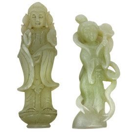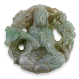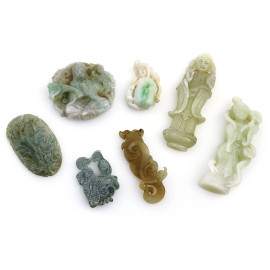 Lotto di sette placchette in giadeite scolpita e cesellata, XX secolo,misure massime cm 9, 30 (rotture, difetti, segni di usura)