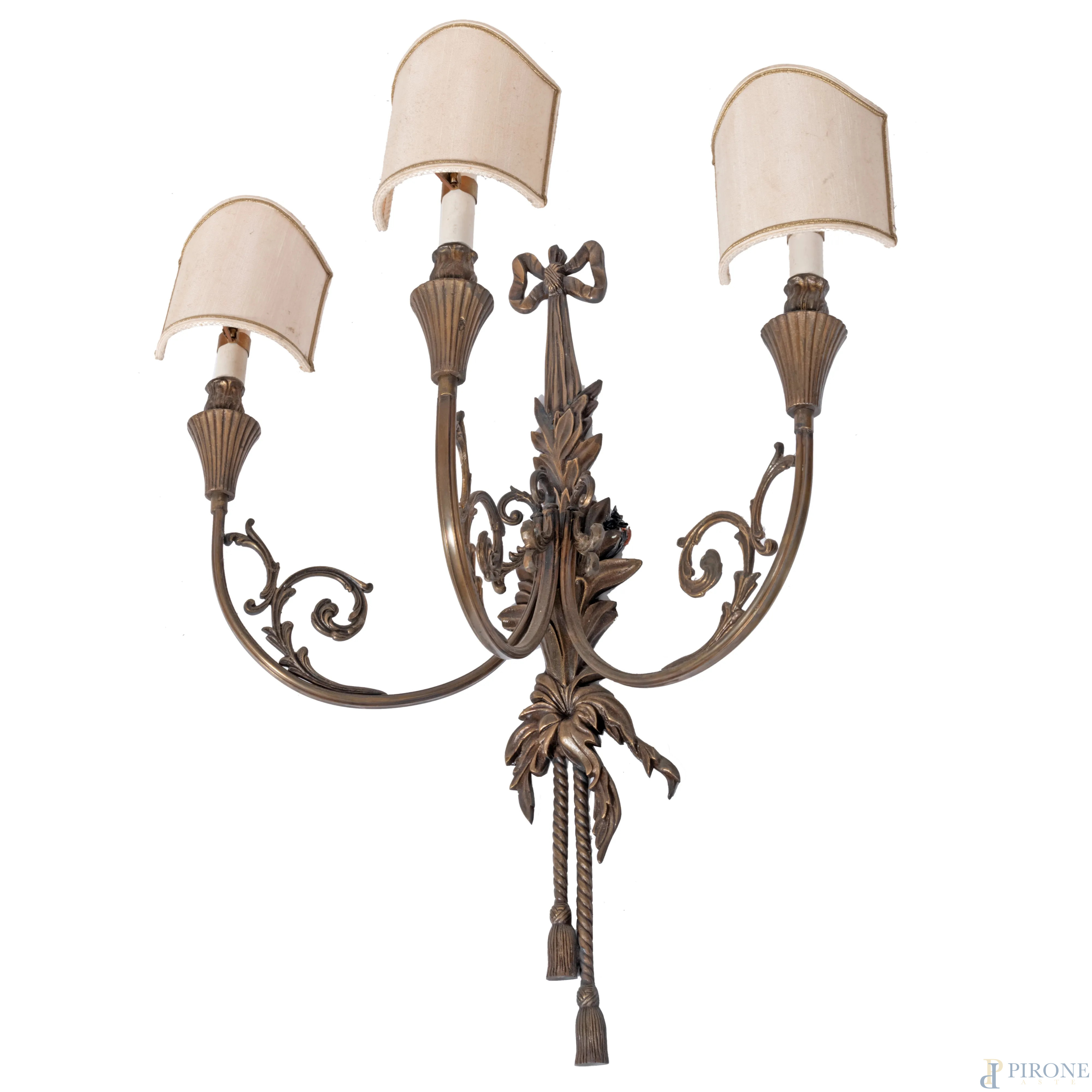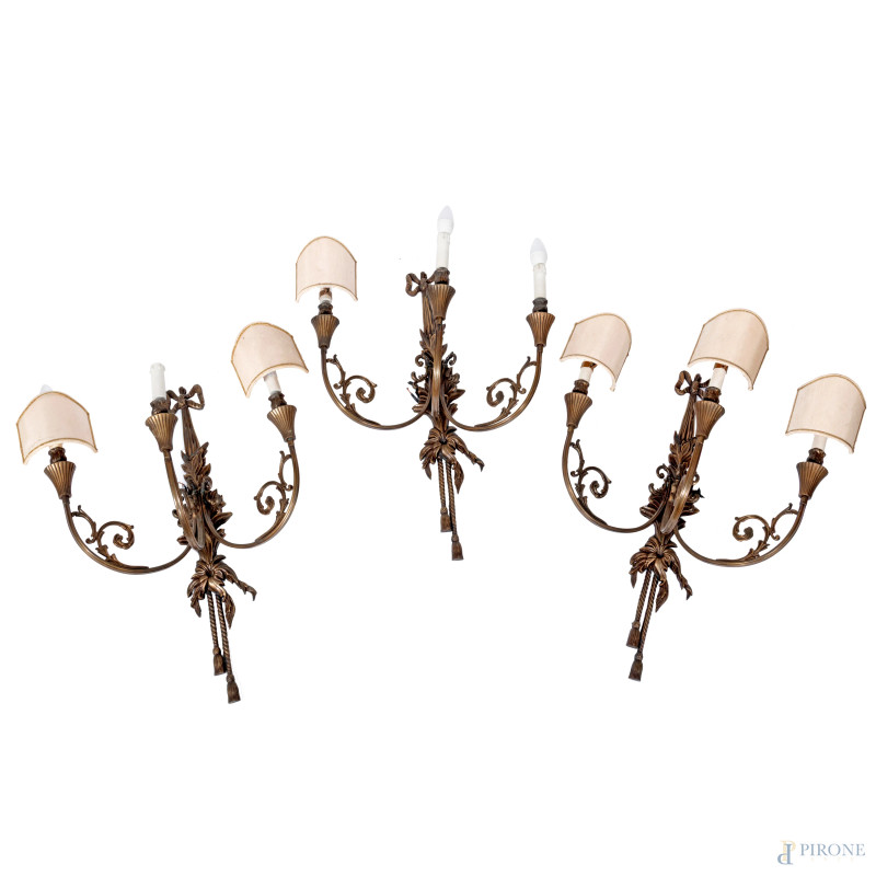 Lotto di tre appliques in bronzo a tre luci , XX secolo, cm 60x50x30, (difetti)