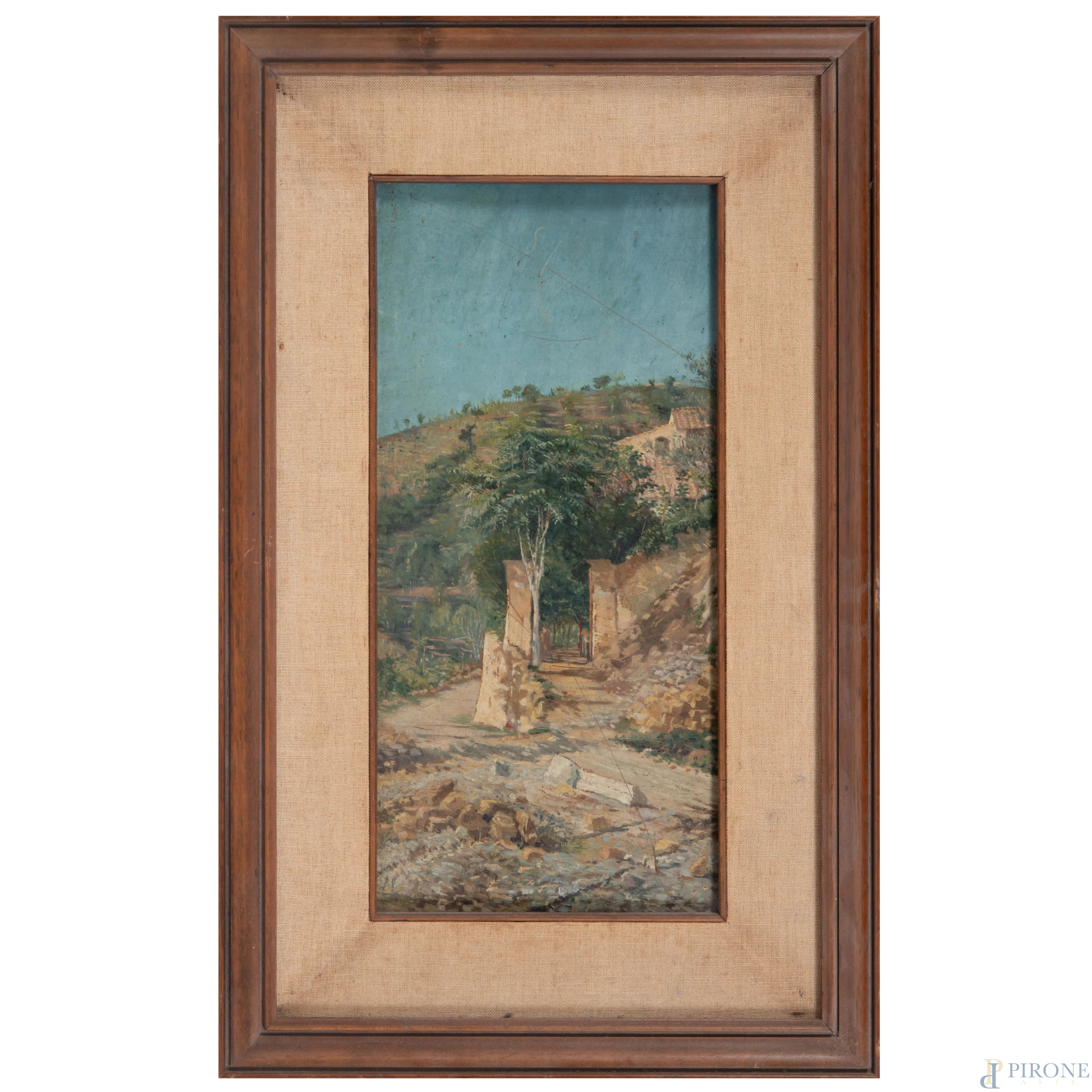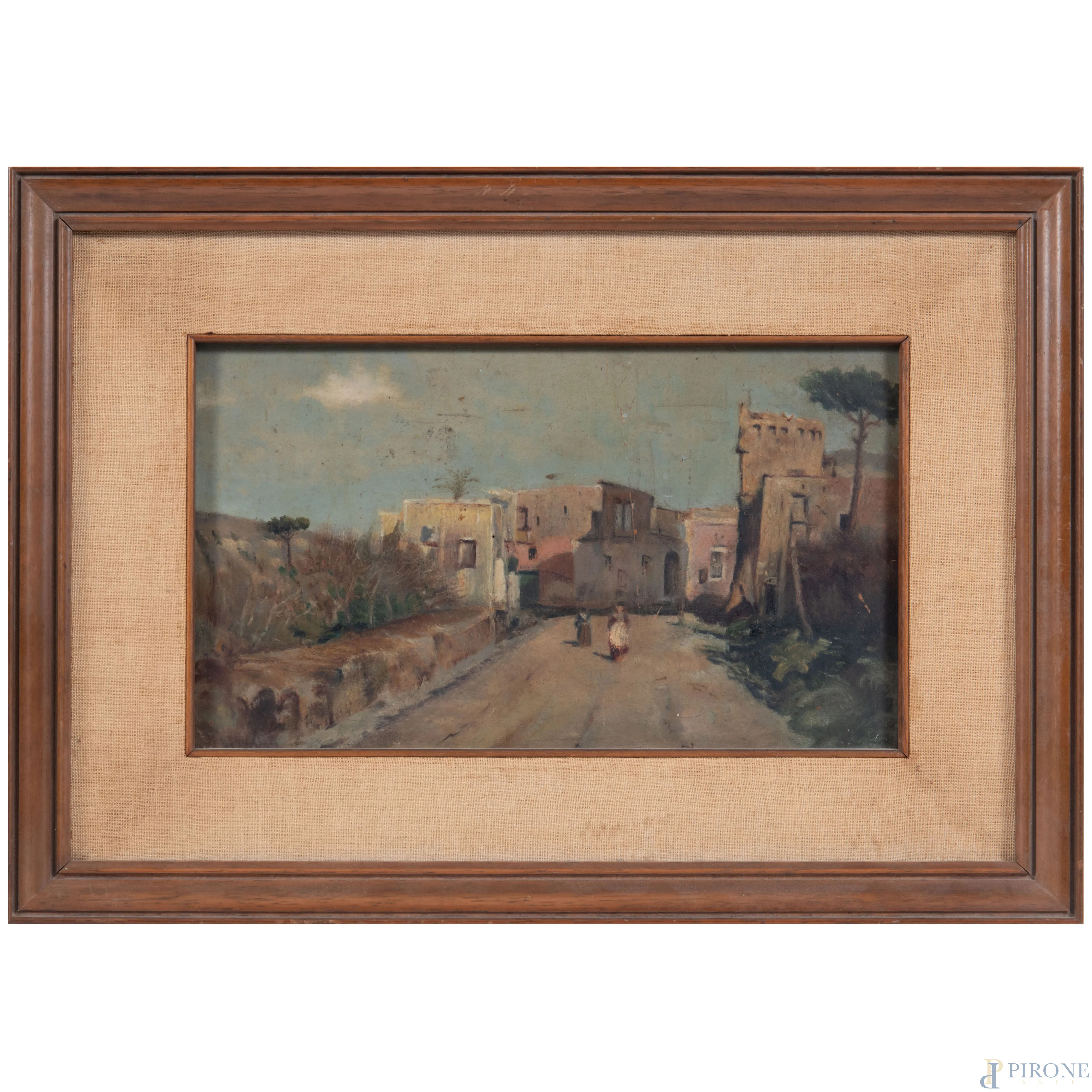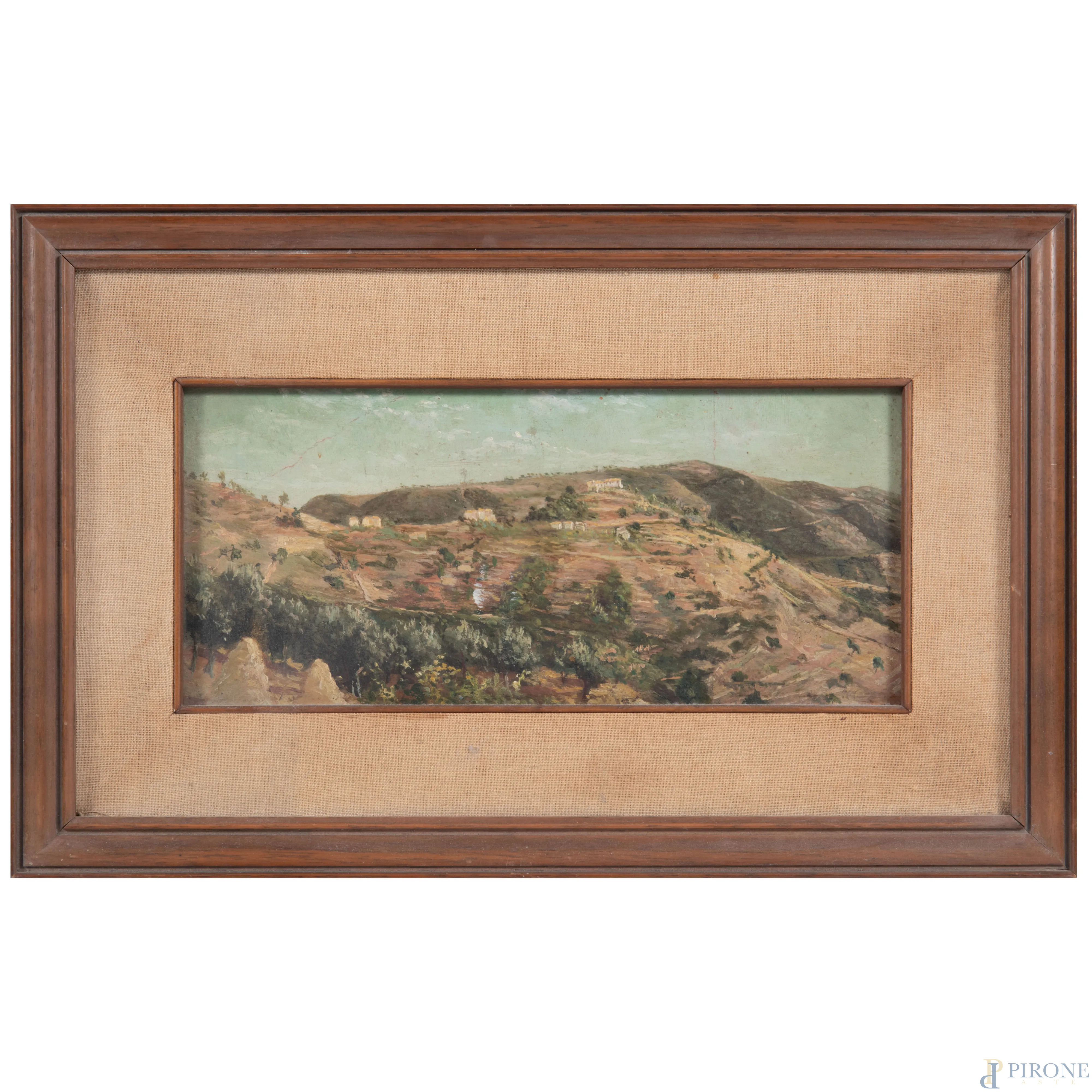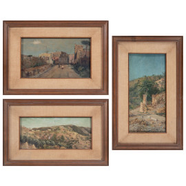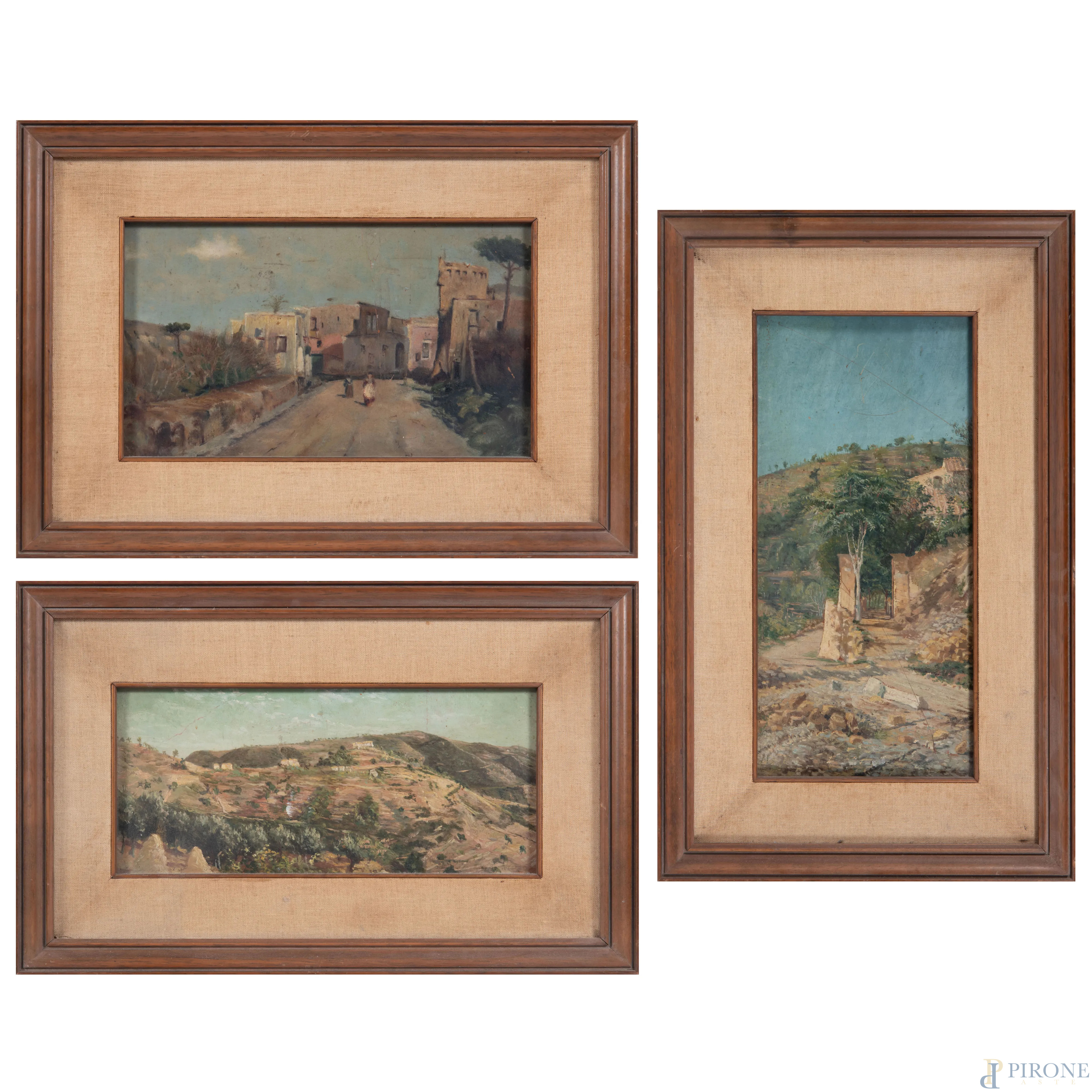 Lotto di tre dipinti ad olio su tavoletta raffiguranti scorcio di città e vedute di paesaggio, XX secolo, cm 16,5x29, entro cornice, (graffi, cadute di colore, scalfiture)