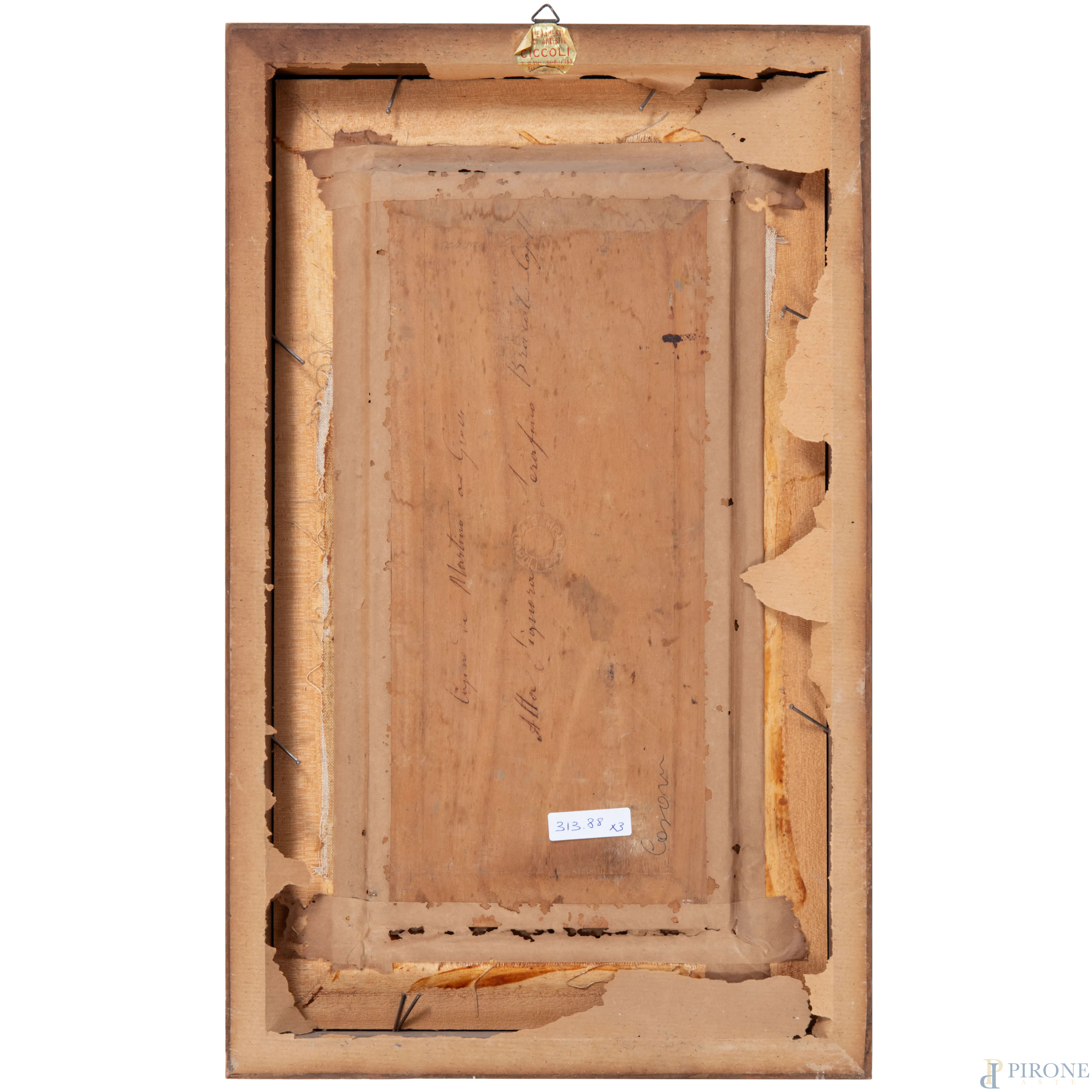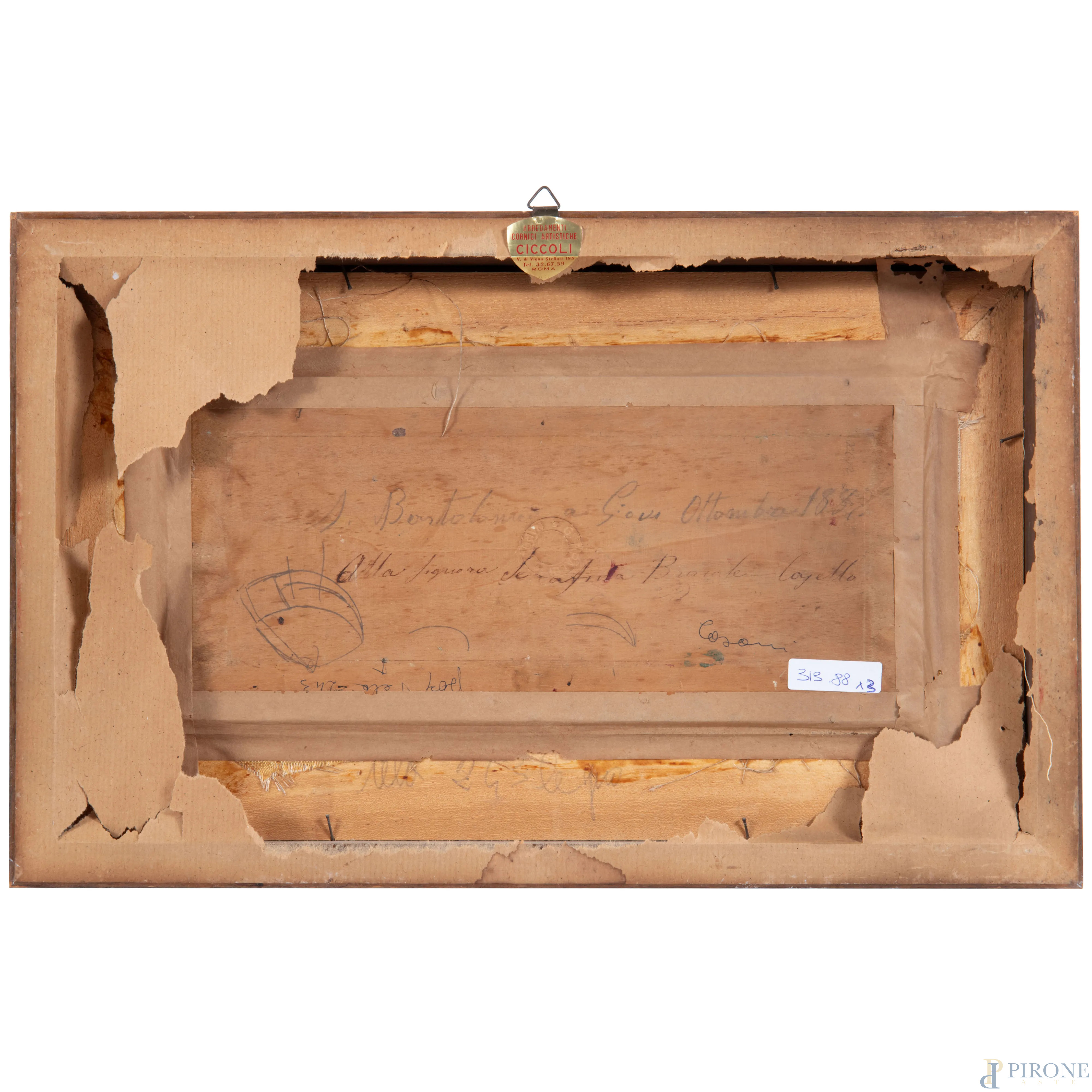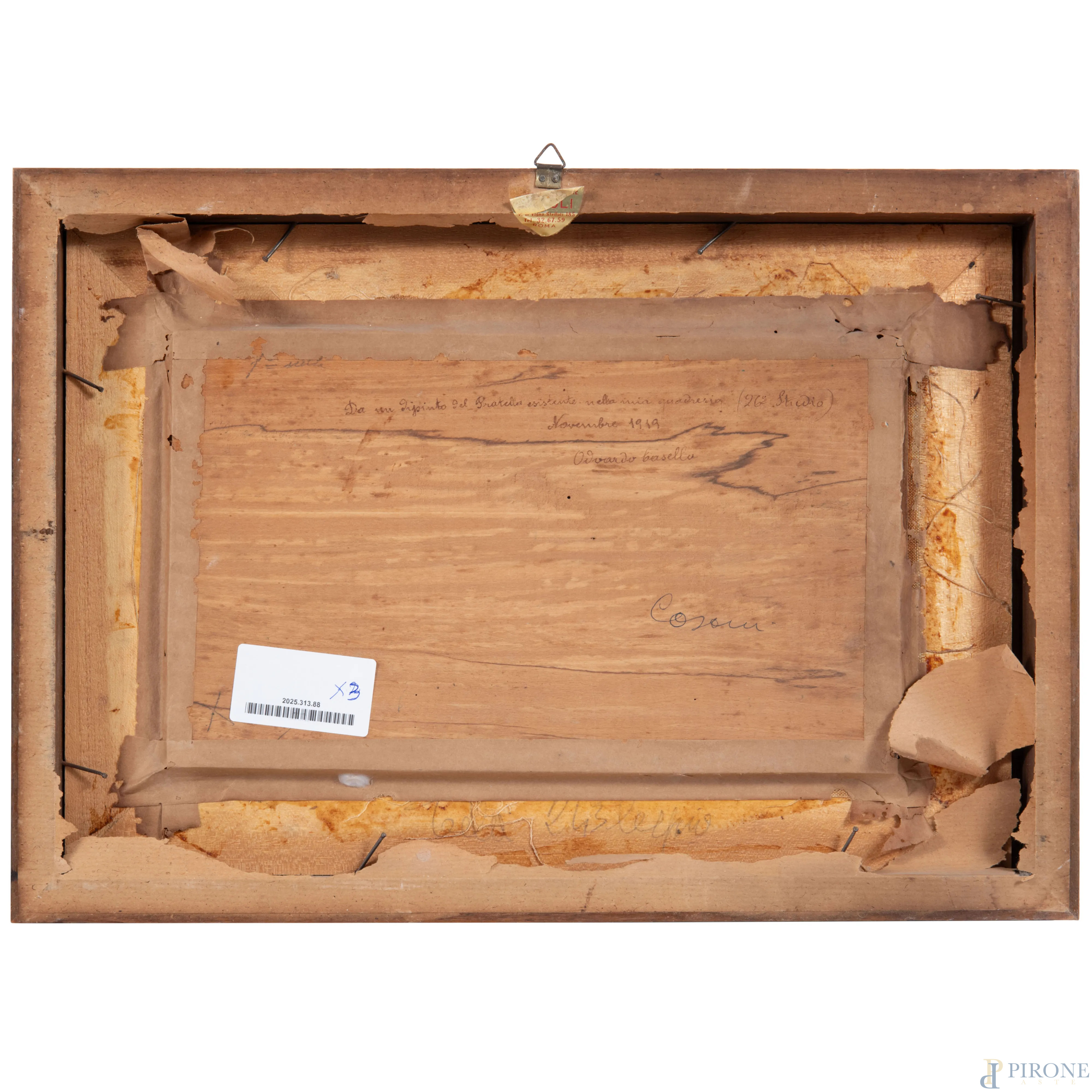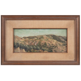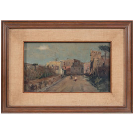 Lotto di tre dipinti ad olio su tavoletta raffiguranti scorcio di città e vedute di paesaggio, XX secolo, cm 16,5x29, entro cornice, (graffi, cadute di colore, scalfiture)