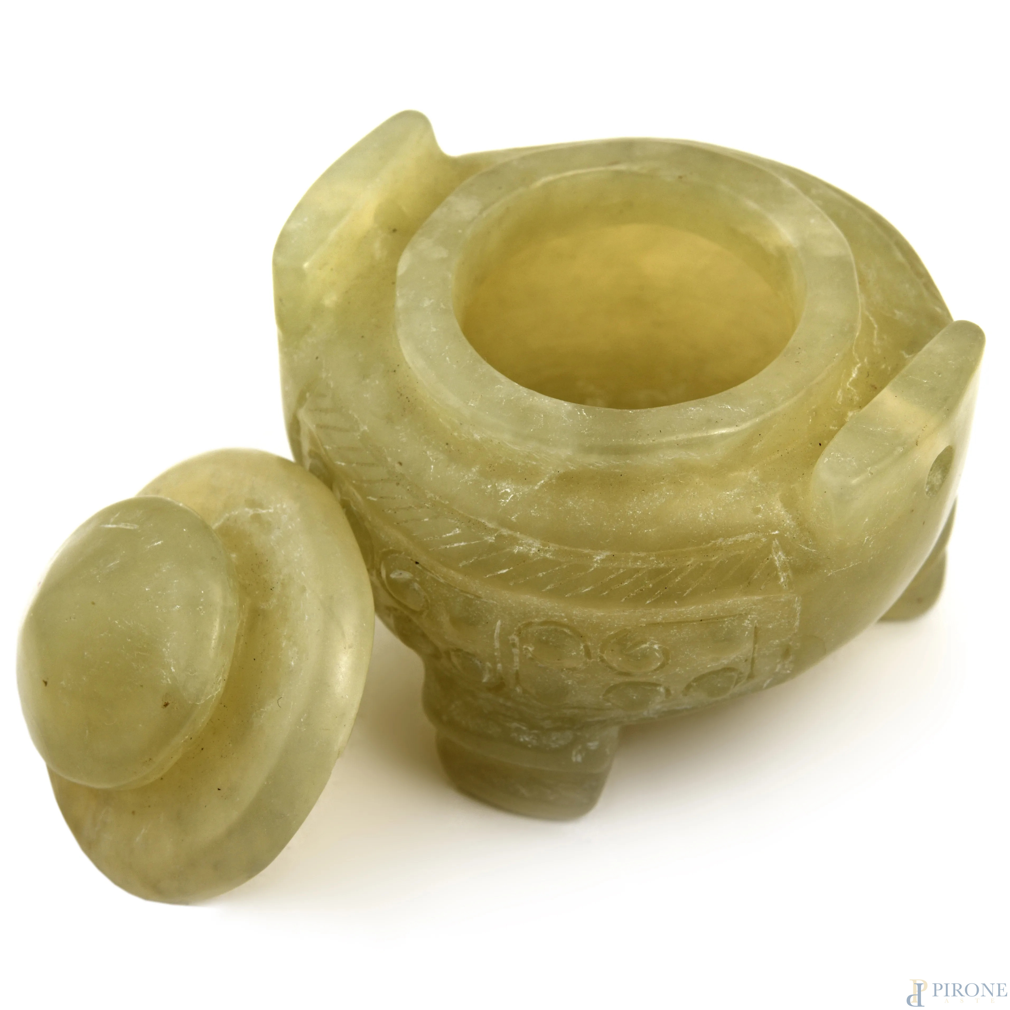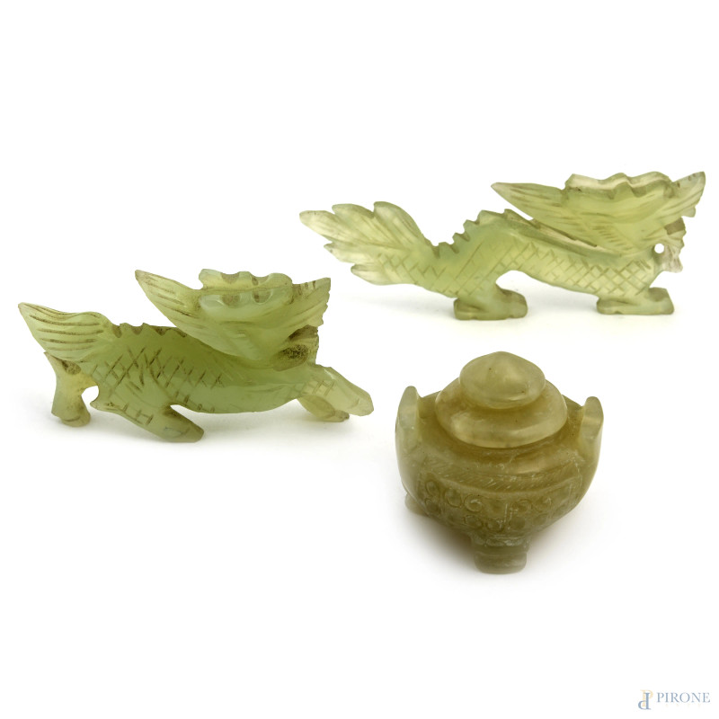 Lotto di una potiche e due cani di Pho in giada, XX secolo, misura massima cm 5x11, (scalfiture, segni di usura)