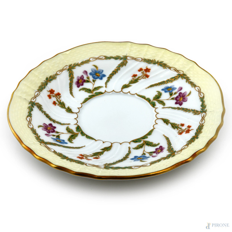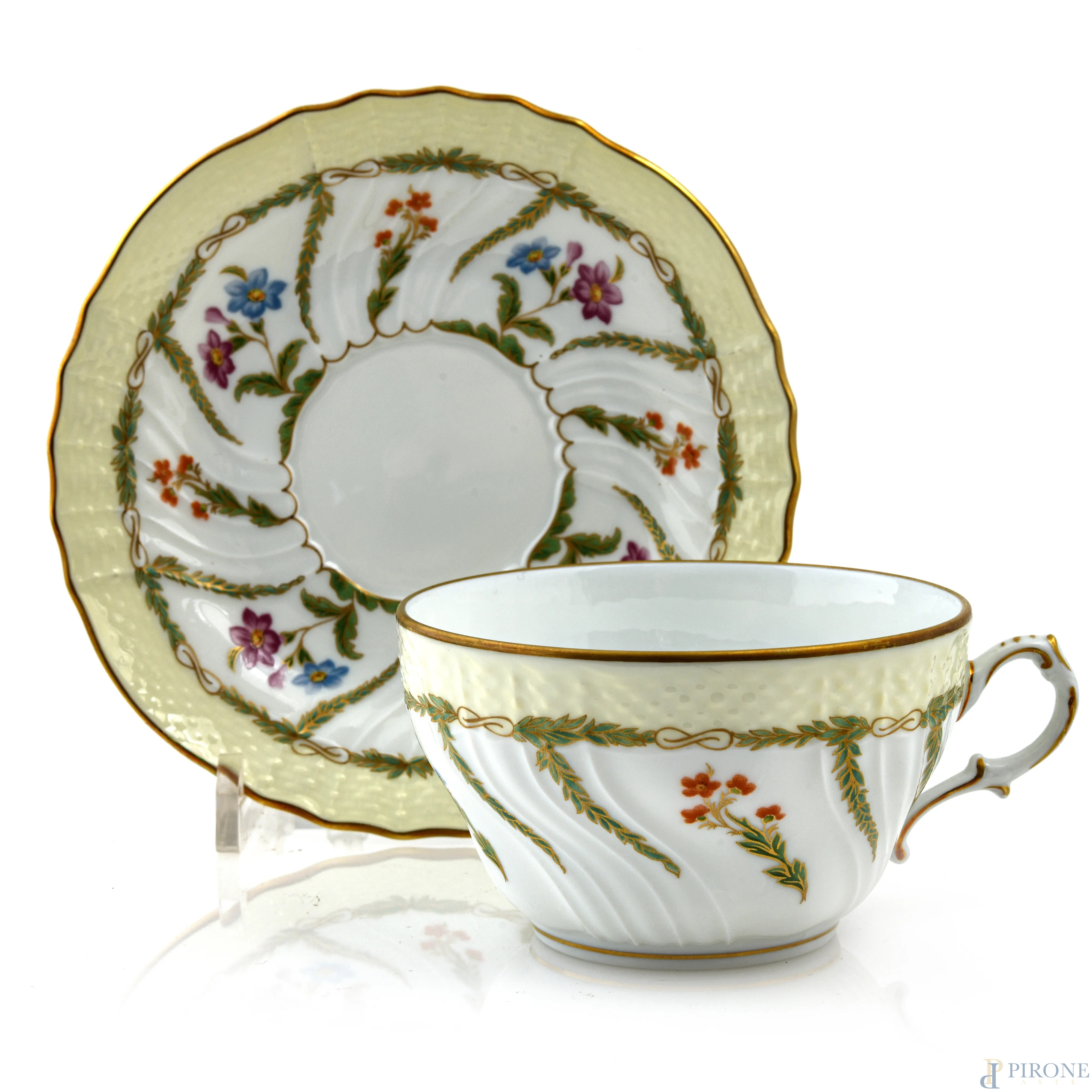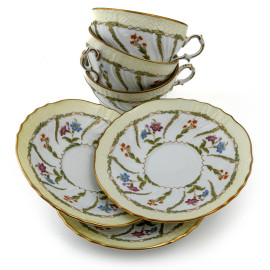 Lotto in porcellana Richard Ginori composto da 3 tazze da the e 3 piattini decorati nei toni del verde e dell'oro, XX secolo