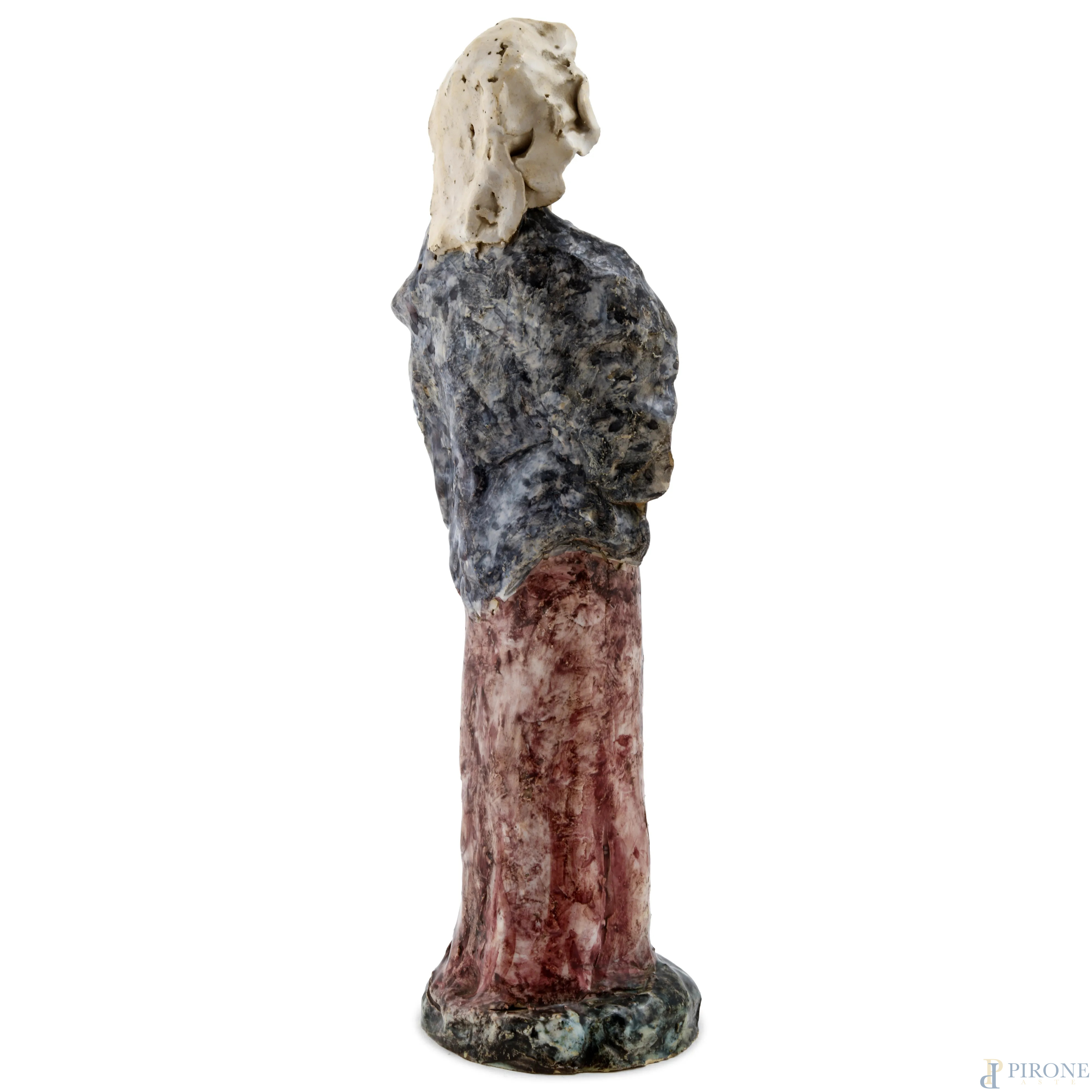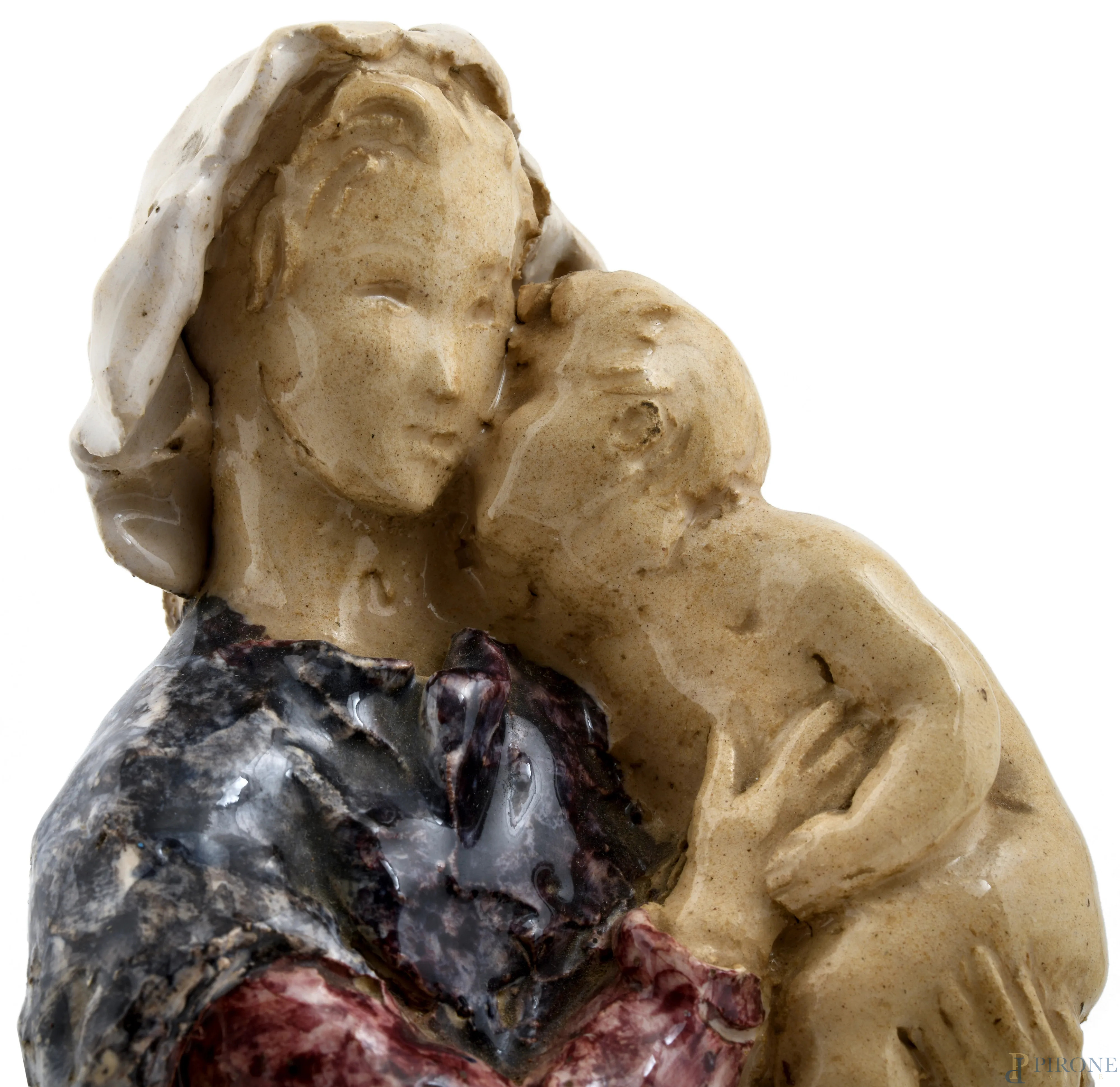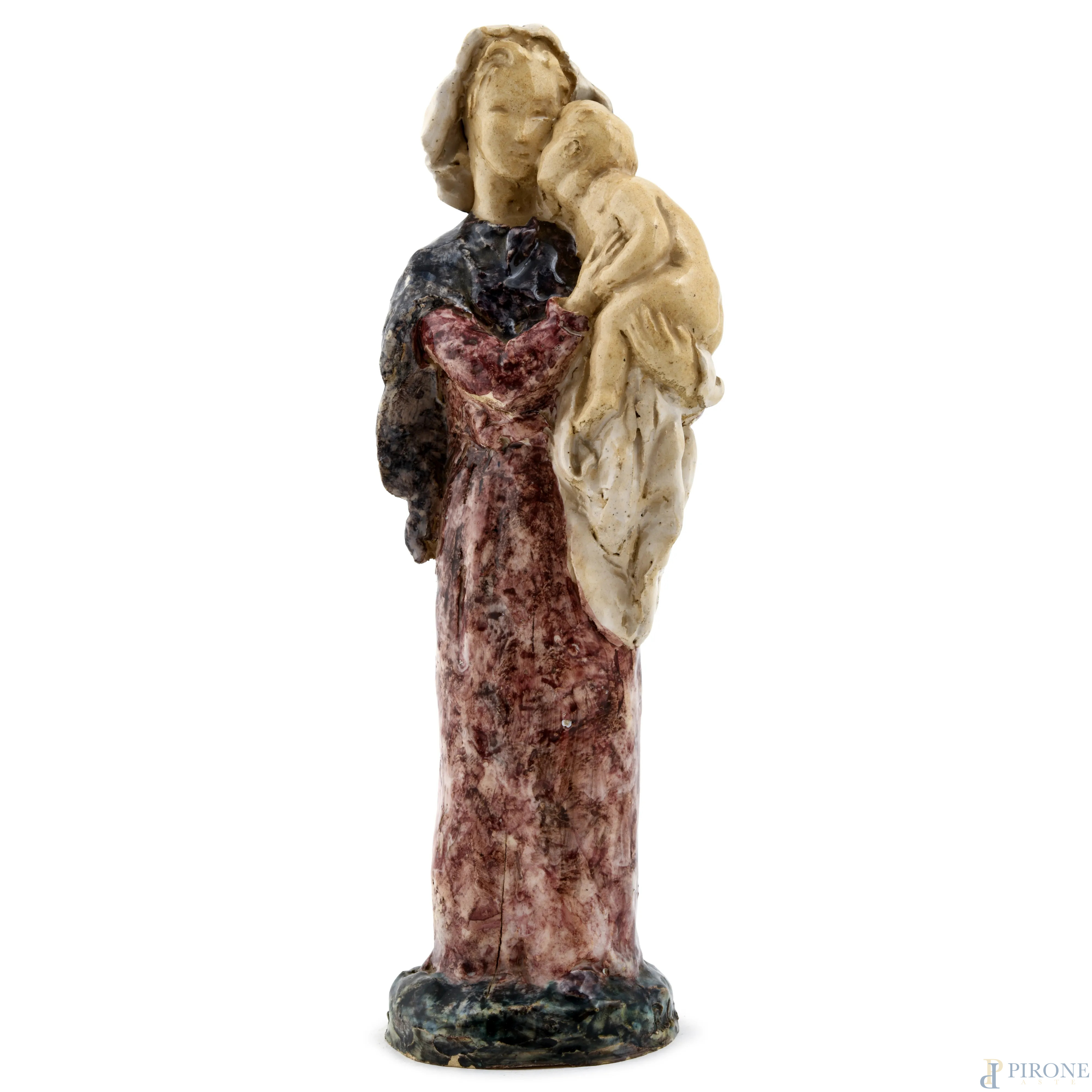 Madonna con Bambino in terracotta smaltata, XX secolo, altezza cm 27, (rotture, felature, difetti di cottura, caduta di smalto)