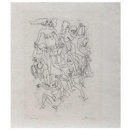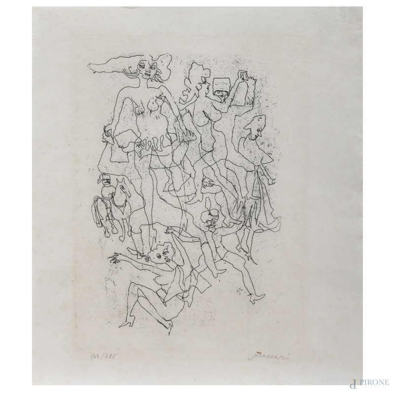 Mino Maccari (1898-1989), Figure, acquaforte su carta di riso, es. 142/295, cm 28,5x25, firmato in basso a destra