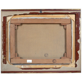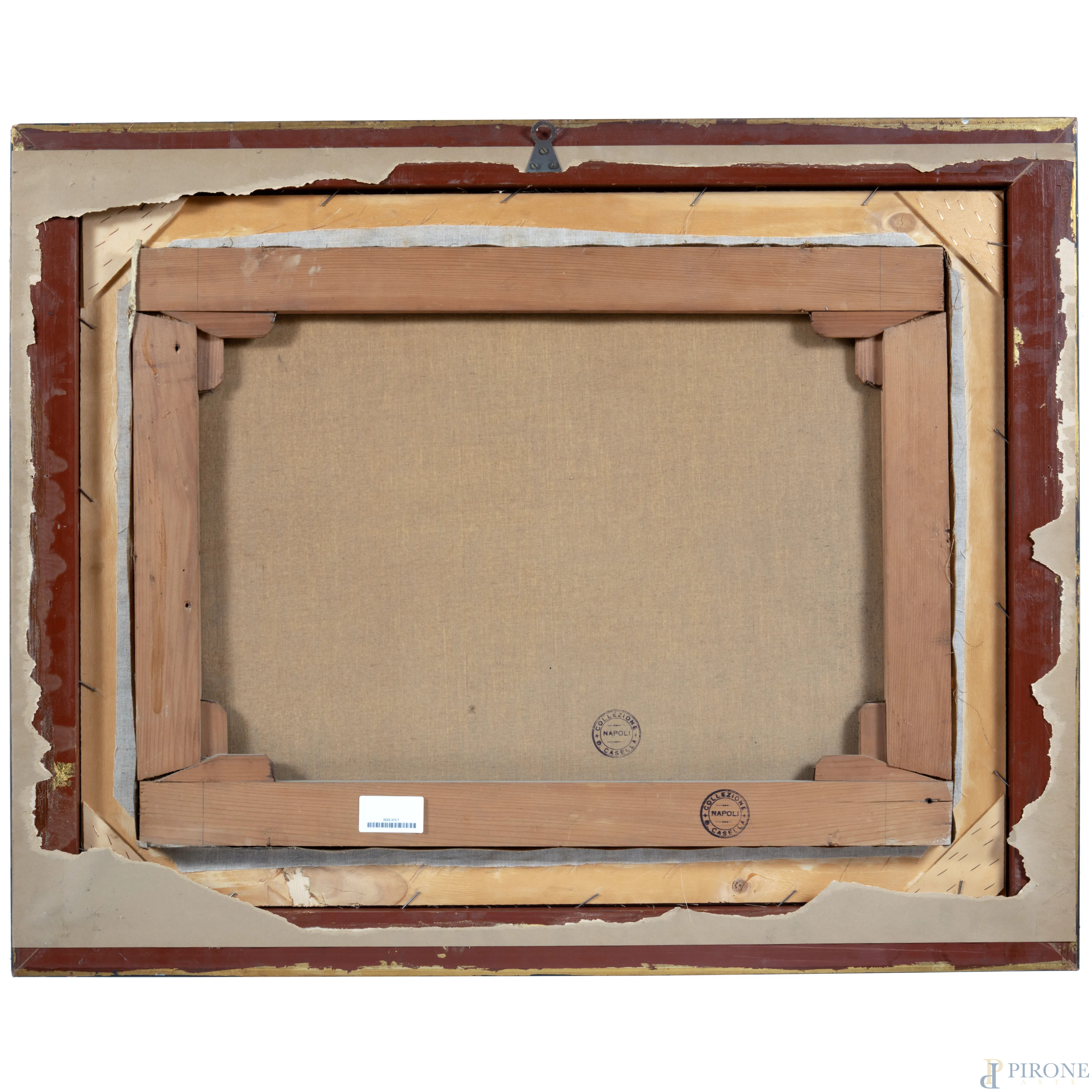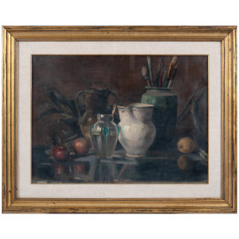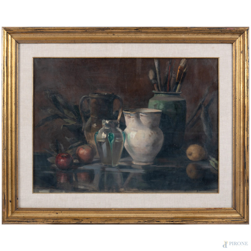 Natura morta con pennelli e vasellame, XX secolo, olio su tela, cm 53x72, entro cornice
