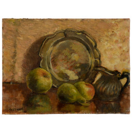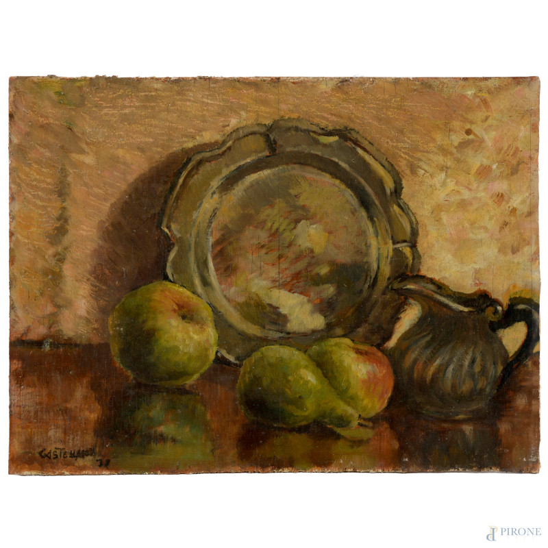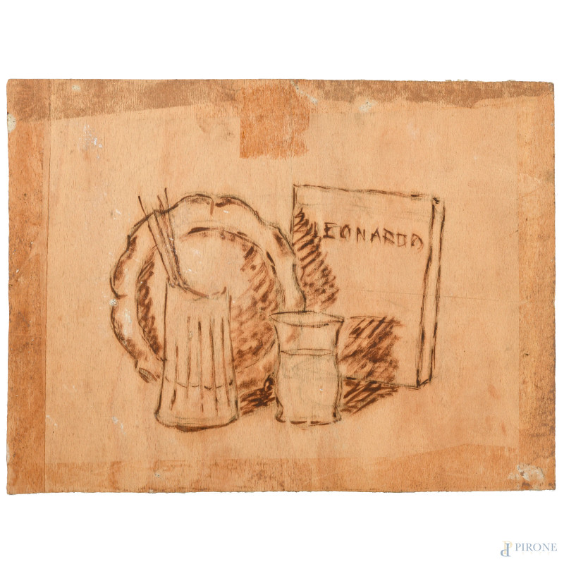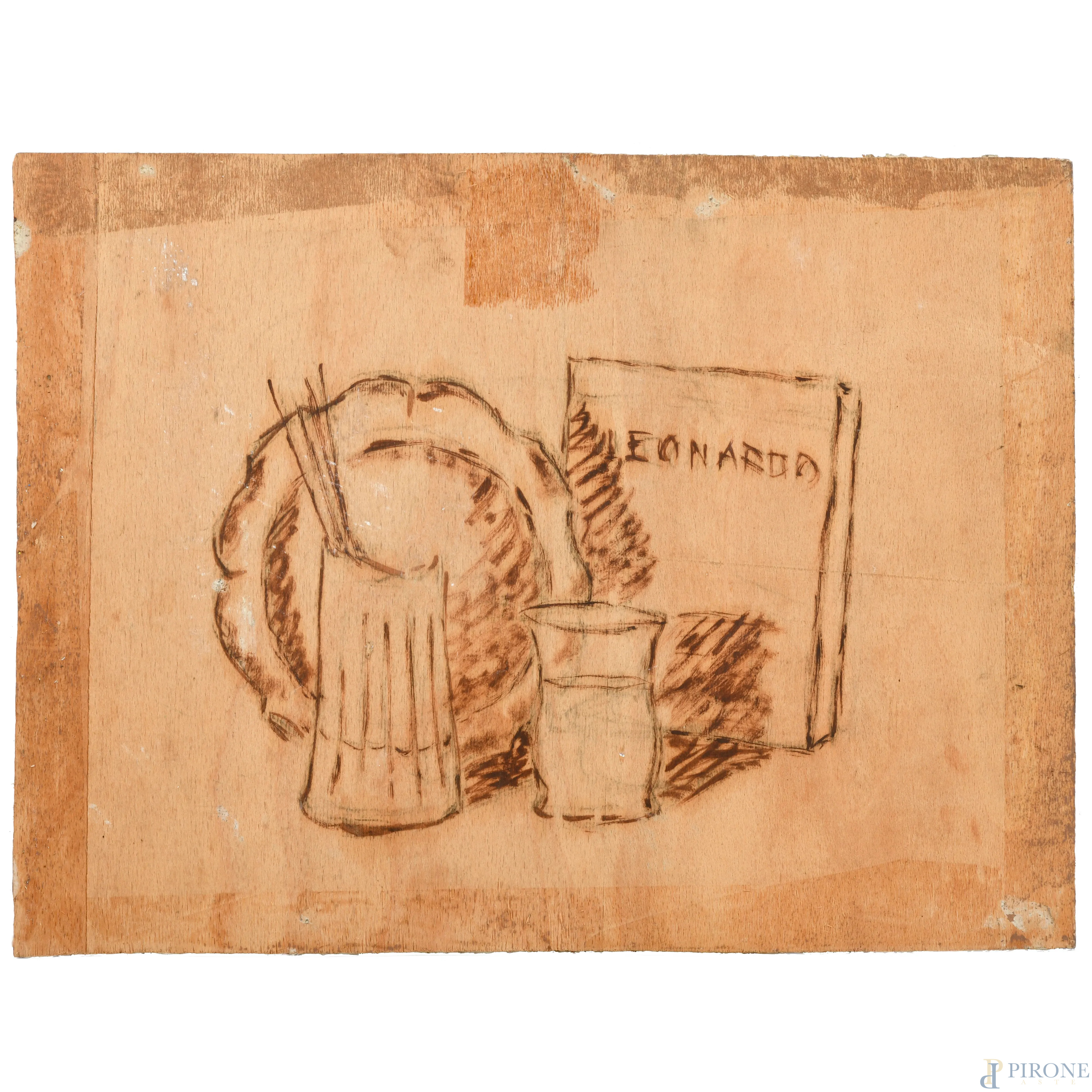 Natura morta, XX secolo, olio su tavoletta, cm 30x40, firmato in basso a sinistra, (cadute di colore, felature del supporto, rotture)