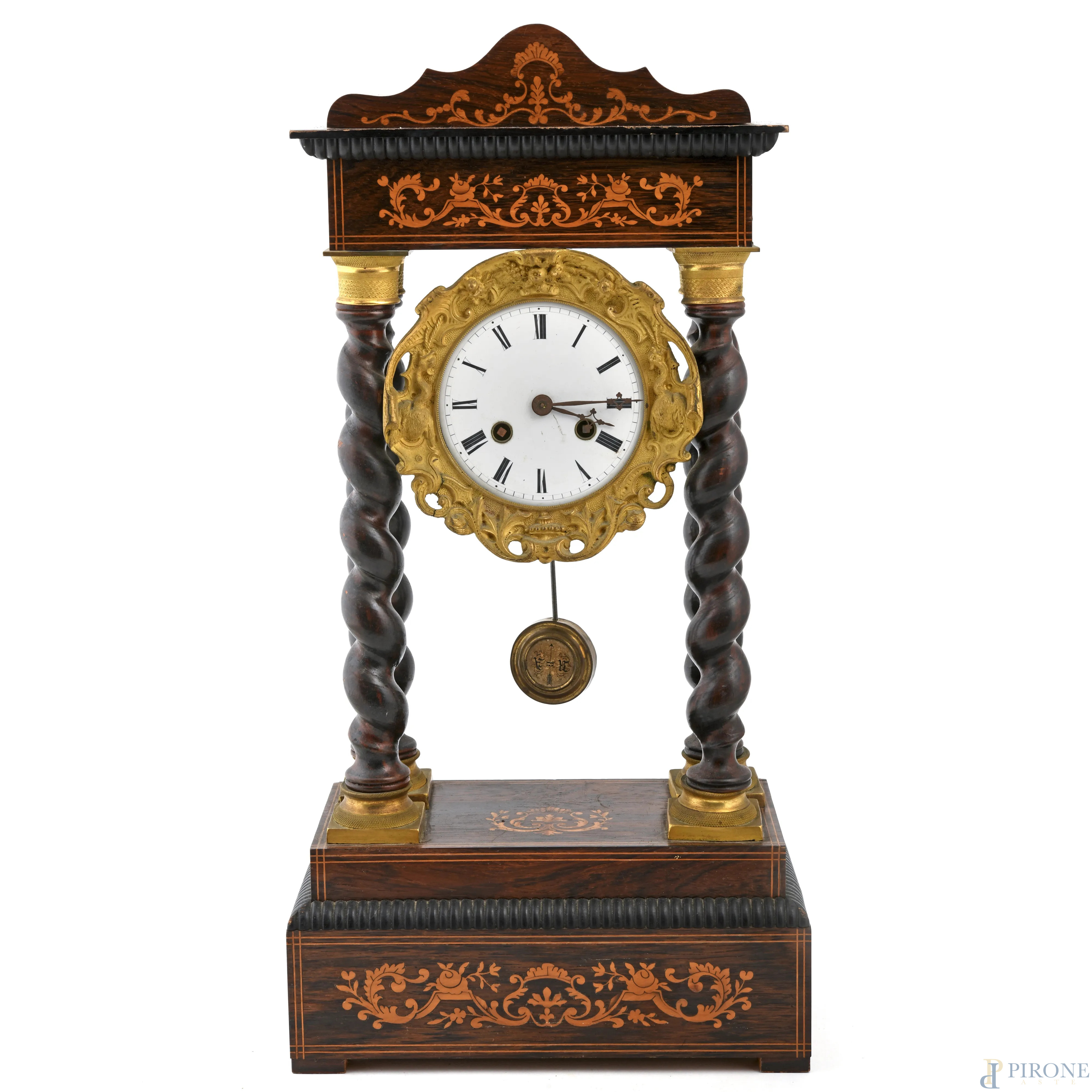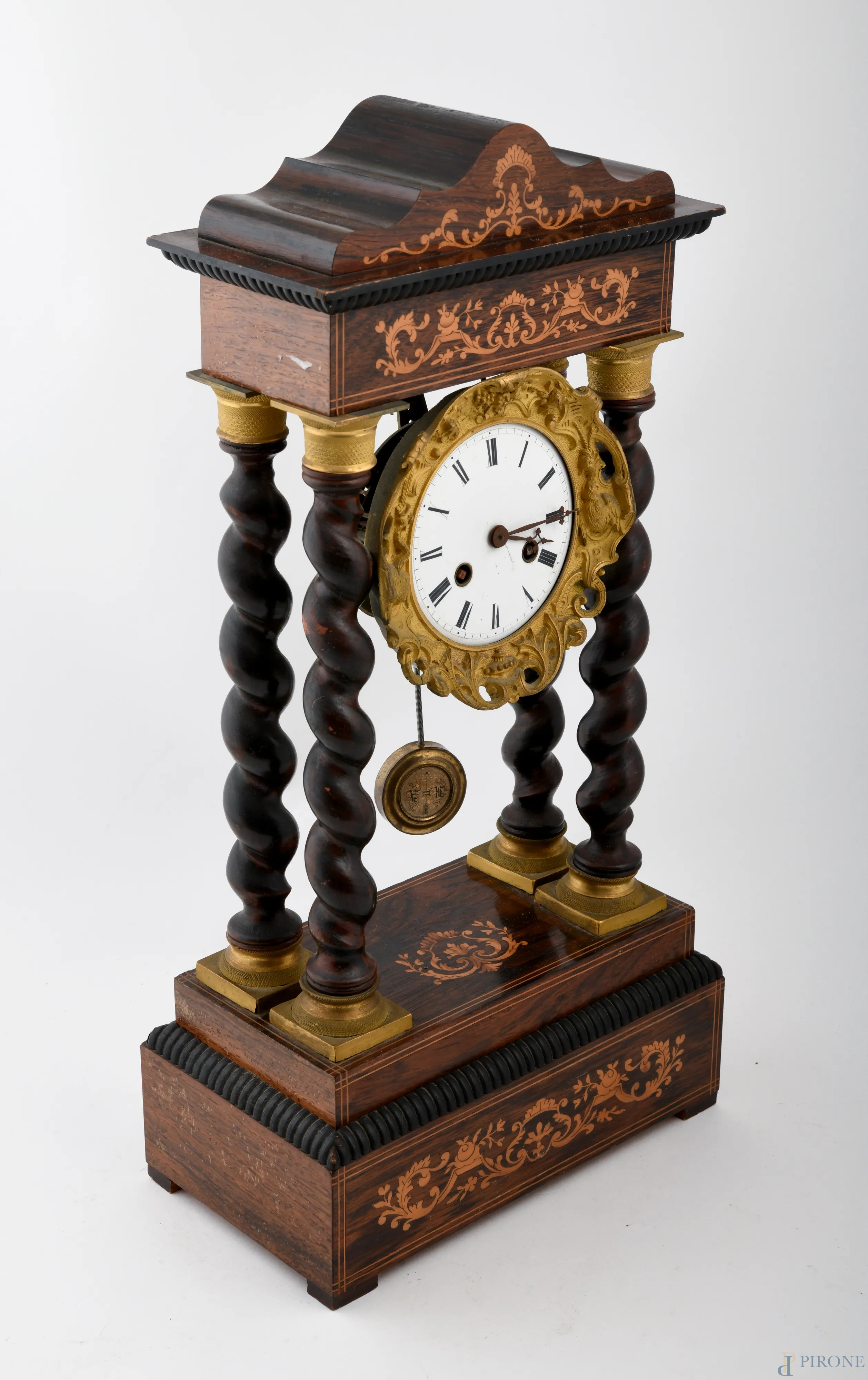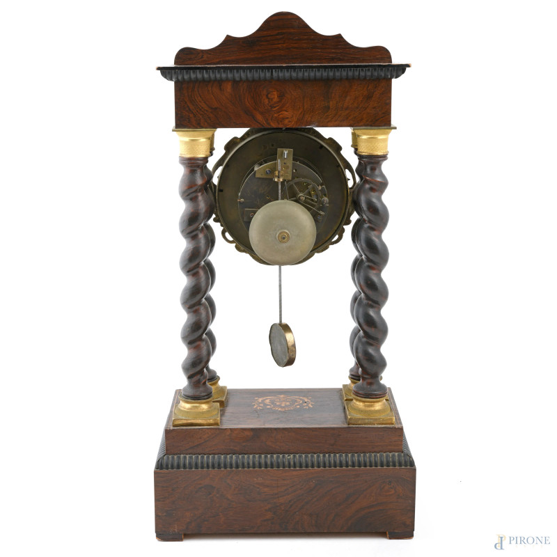 Orologio Carlo X in legno intagliato e intarsiato in varie essenze con quadrante a smalto e metallo dorato incorniciato da quattro colonnine tortili, cm 53x24x12, (da revisionare, difetti)