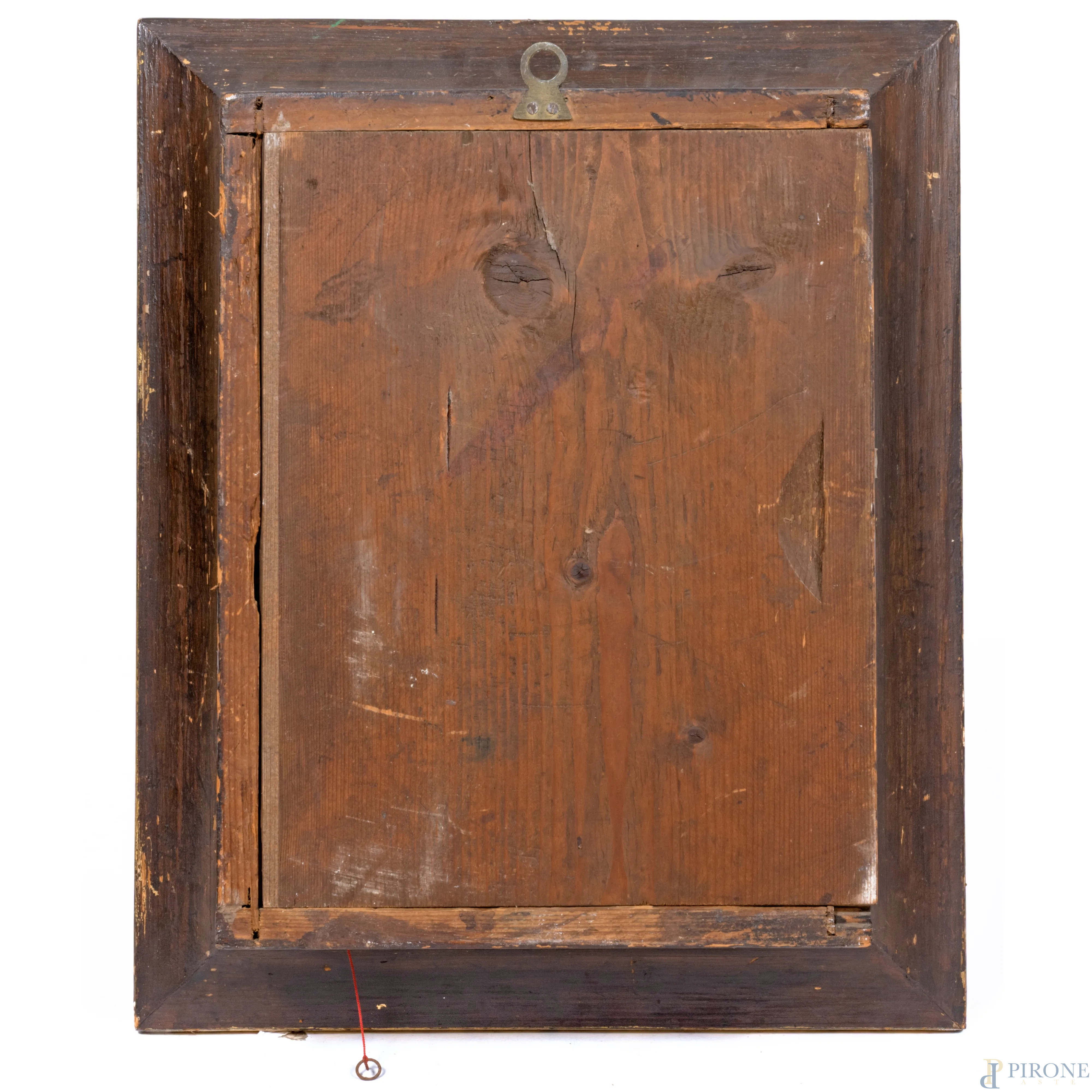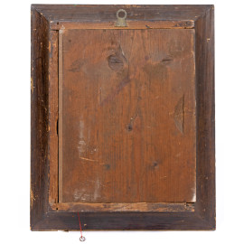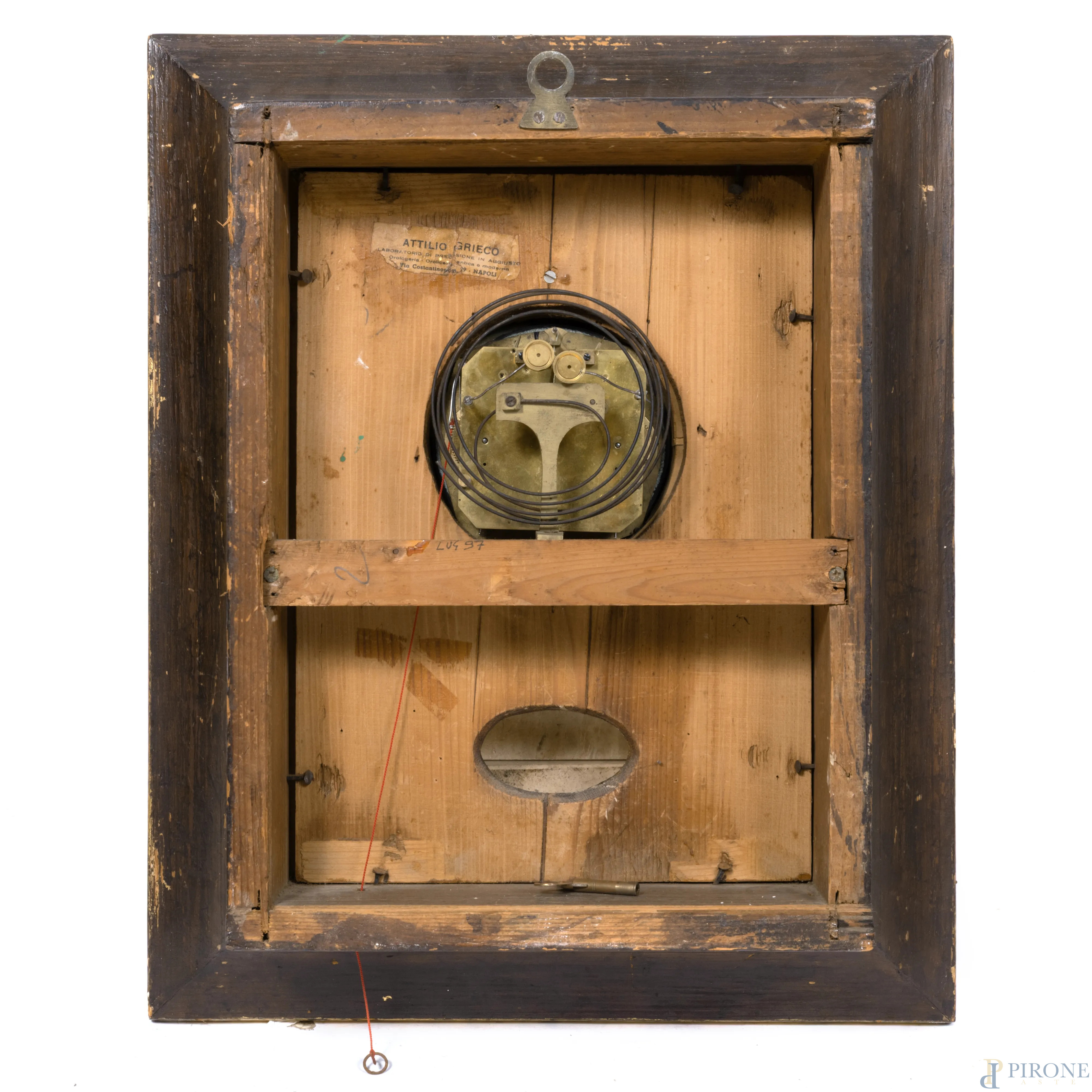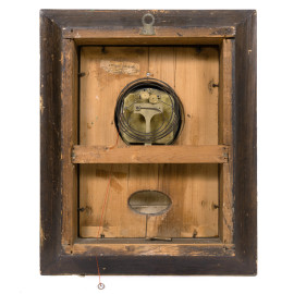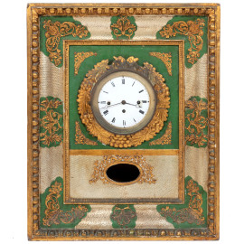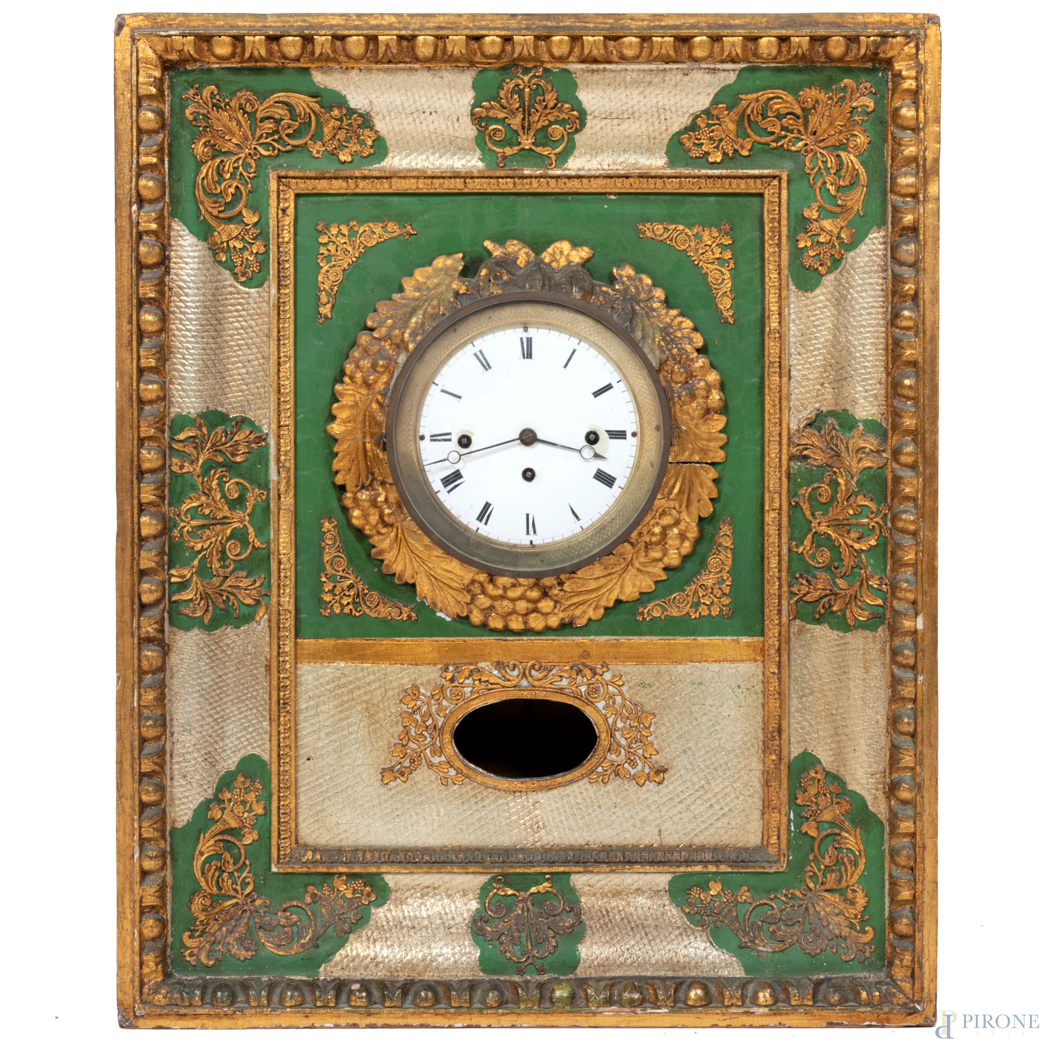 Orologio da parete con cassa in legno dorato e smaltato, finemente inciso con girali fogliati e tralci d'uva. Quadrante circolare a numeri romani, XX secolo, cm 55x46x13, (da revisionare, difetti, cadute di colore e dorature, scalfiture)