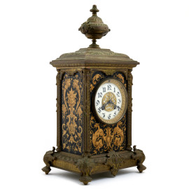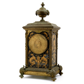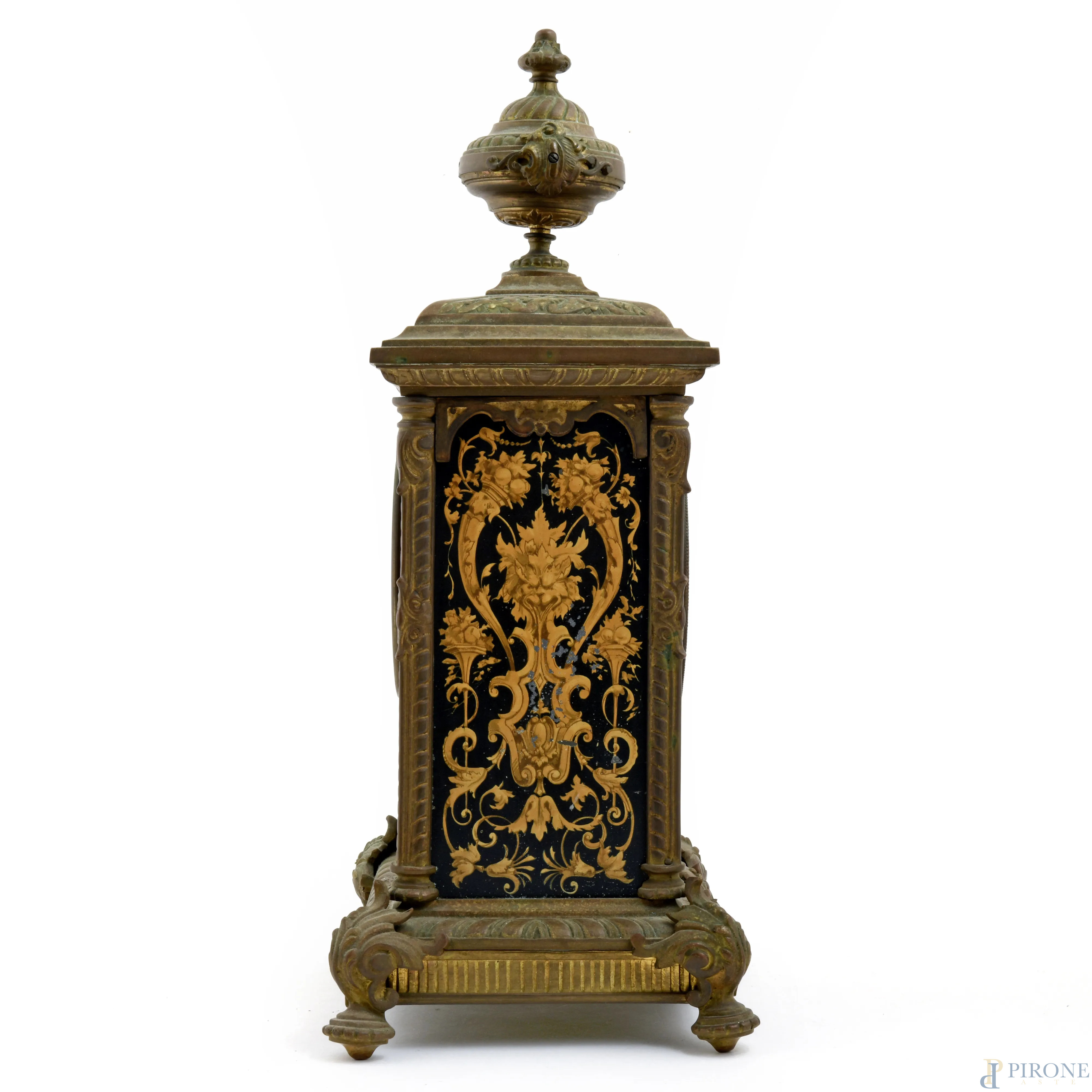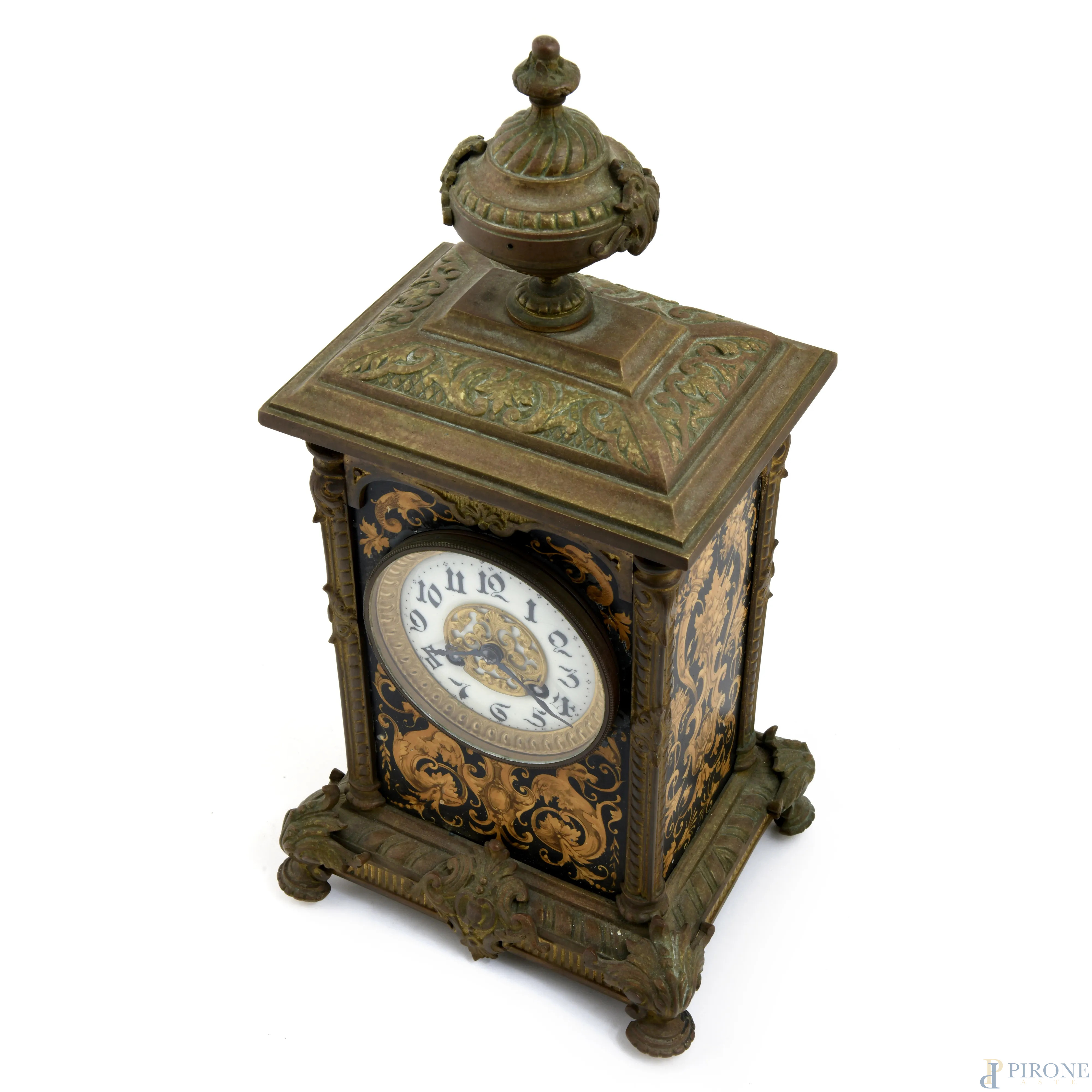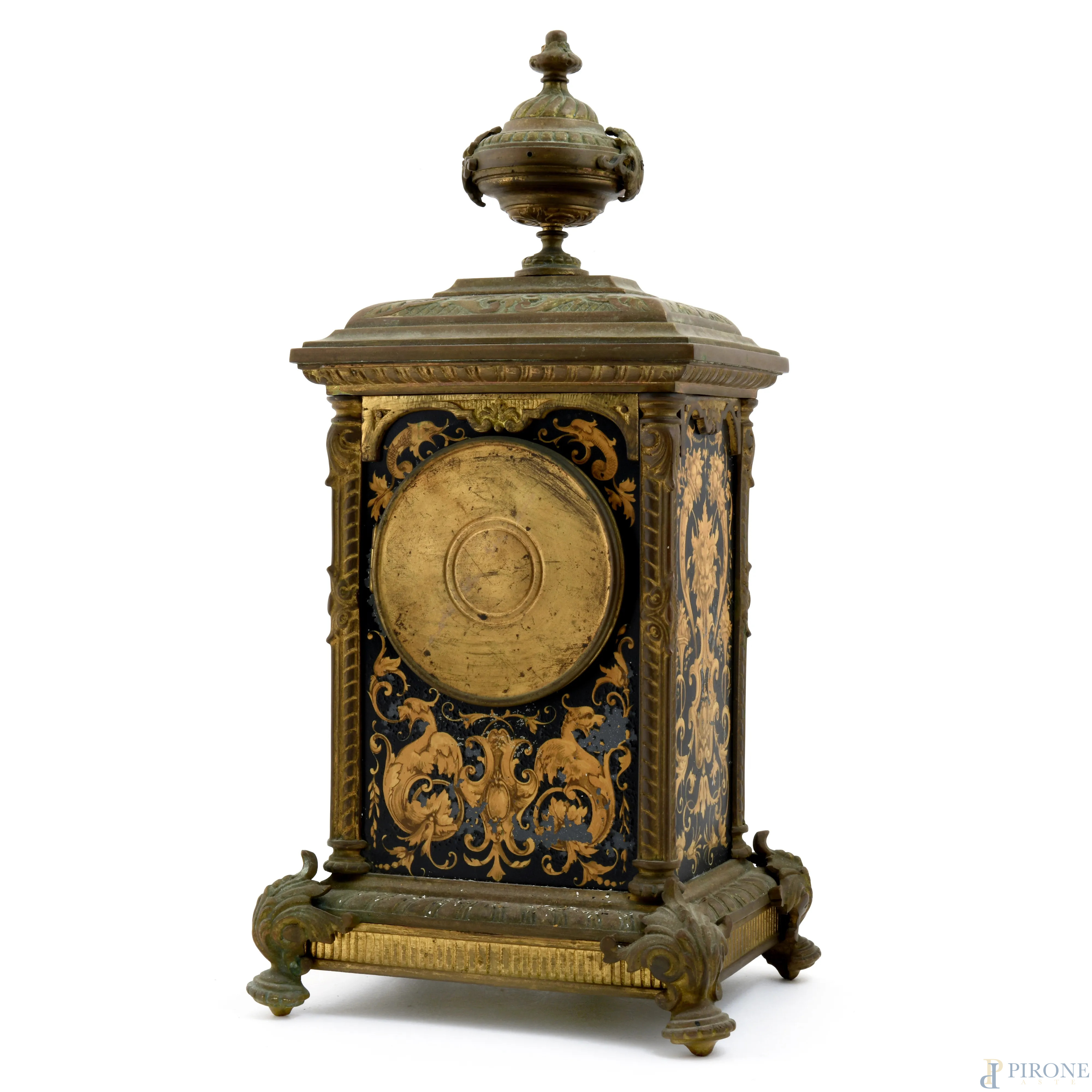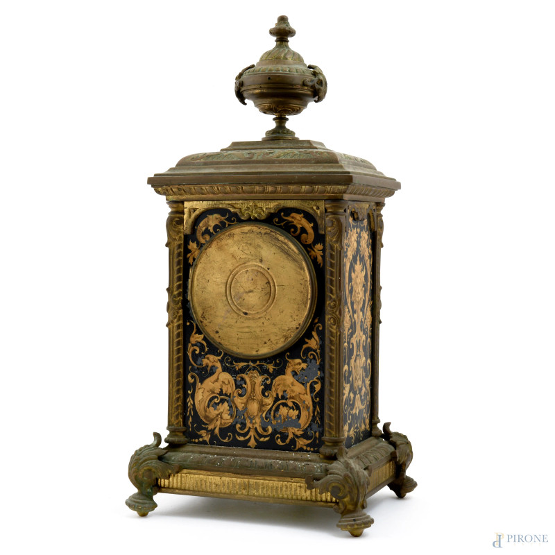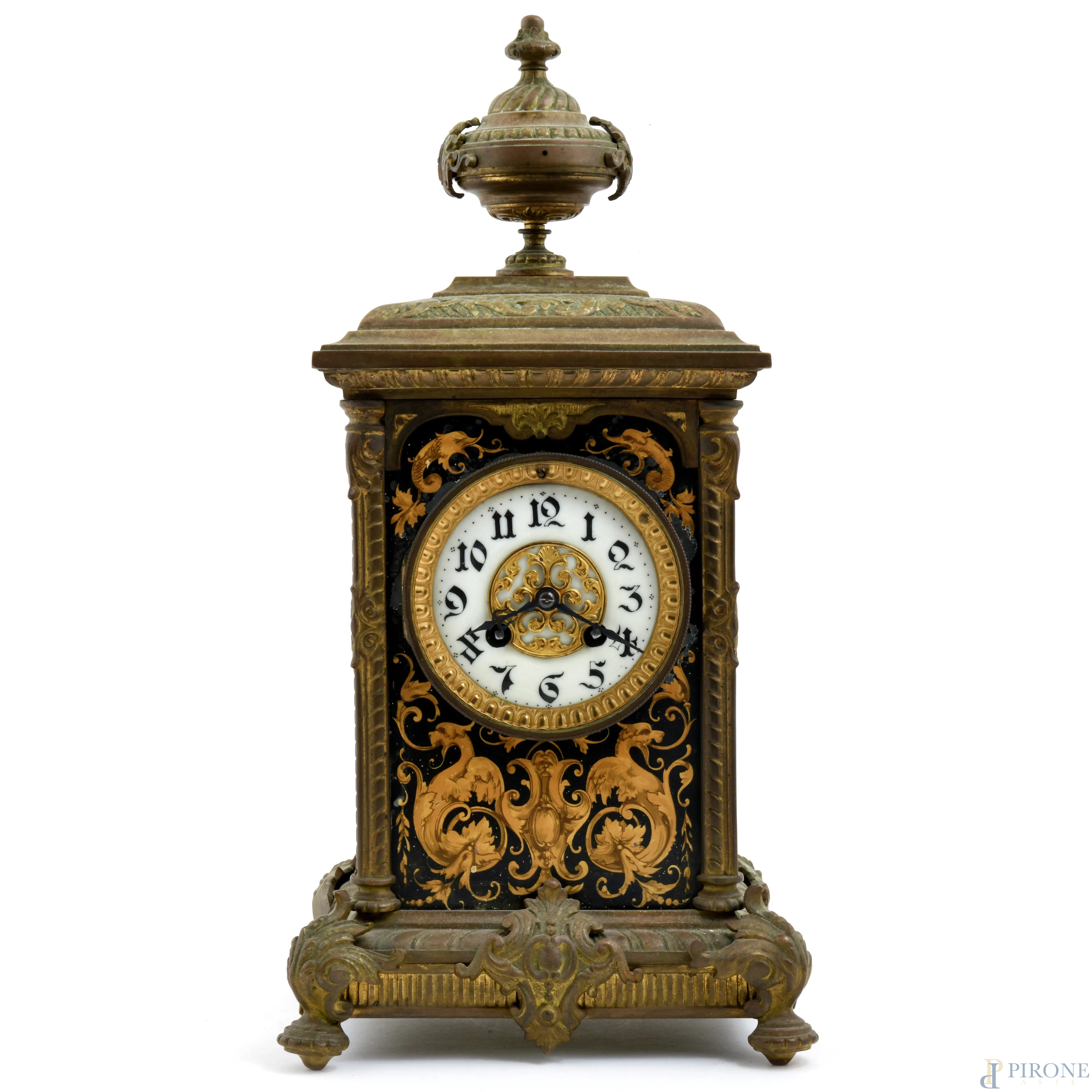 Orologio da tavolo in bronzo con elemento apicale a foggia di urna. Decorazioni ai lati con motivi vegetali, figure mitologiche e delfini. Quadrante smaltato con numeri arabi, XX secolo, cm 41x20,5x17 (da revisionare, difetti)
