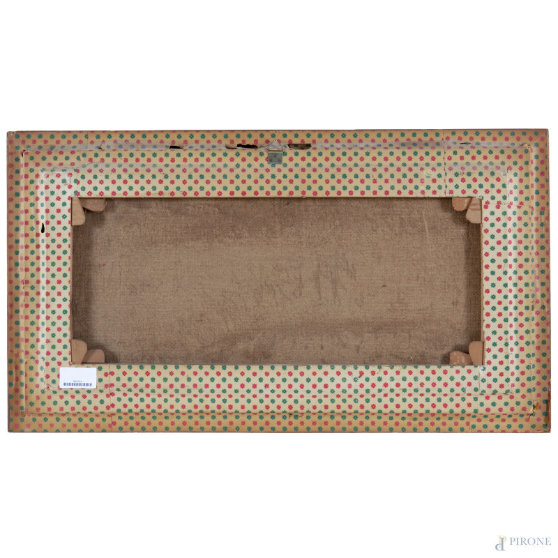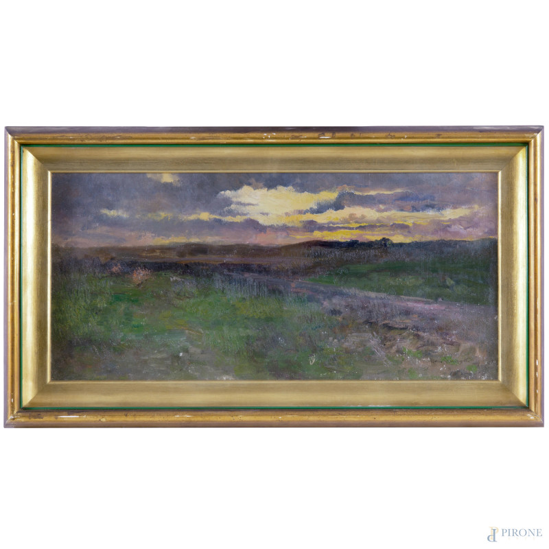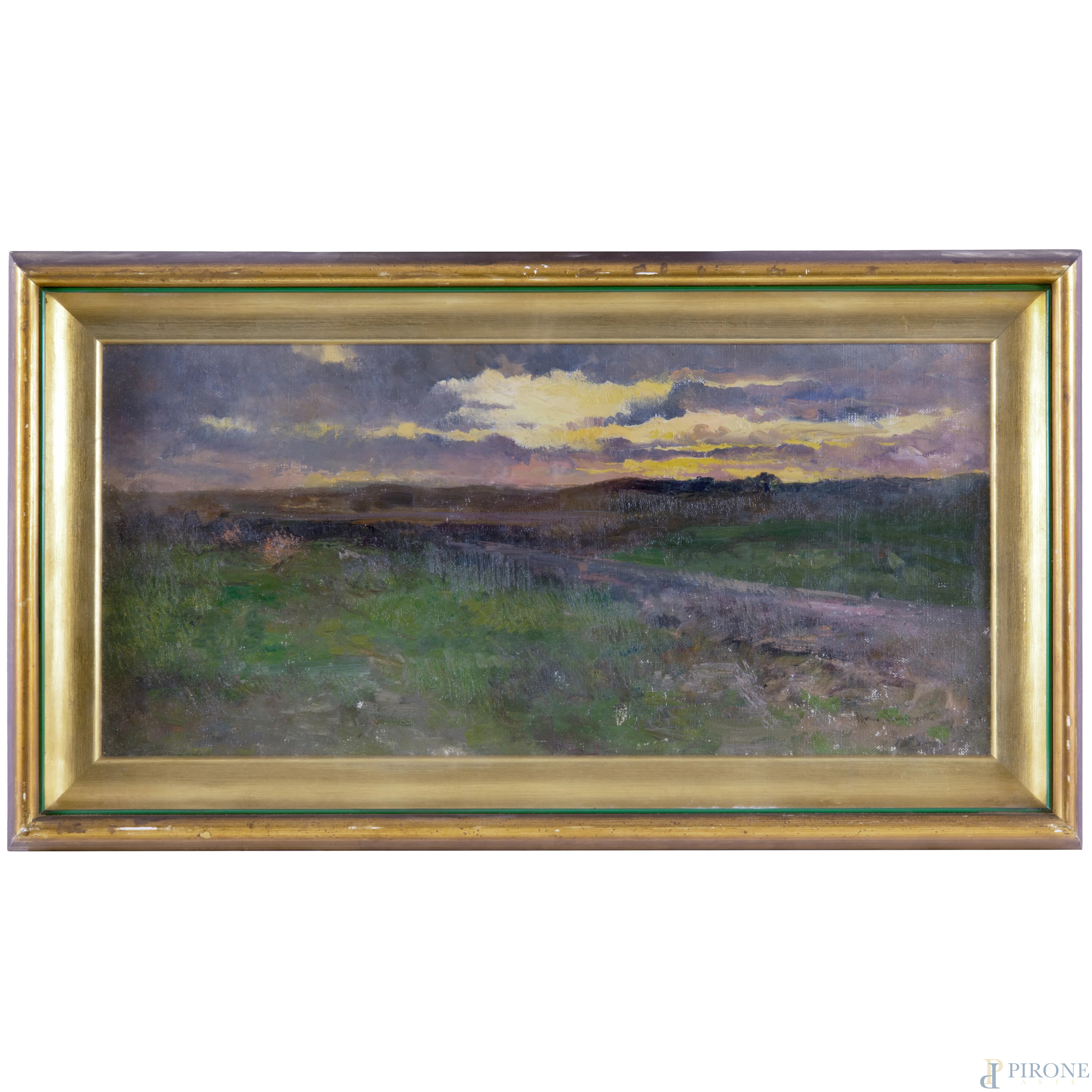 Paesaggio al tramonto, XX secolo, olio su tela, cm 35x72, firmato in basso a destra, entro cornice