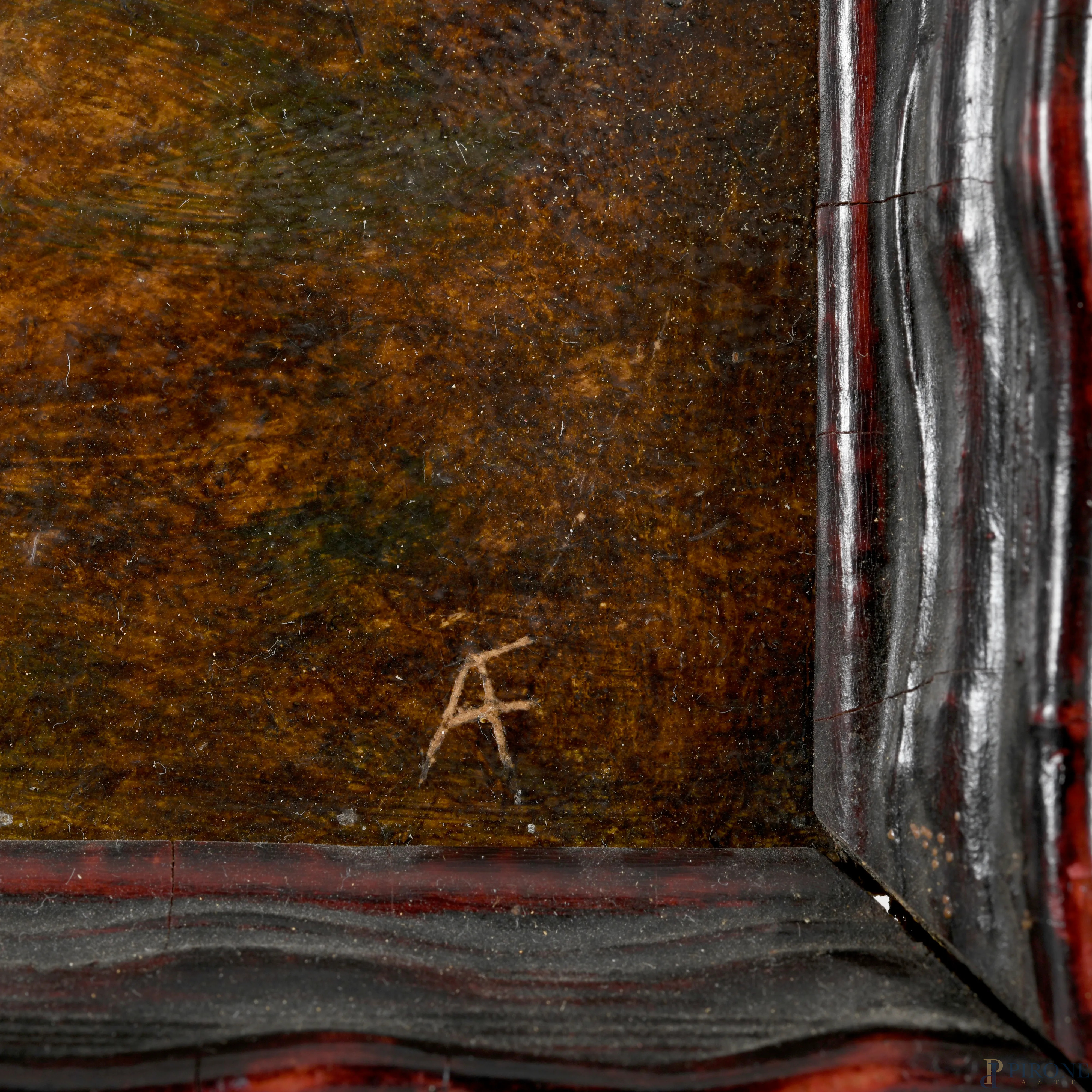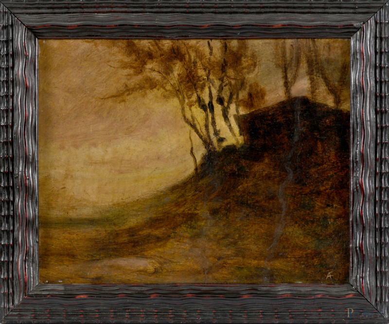 Paesaggio con casa, XX secolo, olio su cartone incollato su faesite, cm 23x30, siglato in basso a destra, entro cornice, (difetti)
