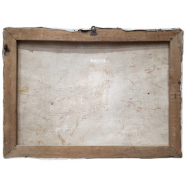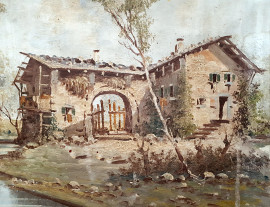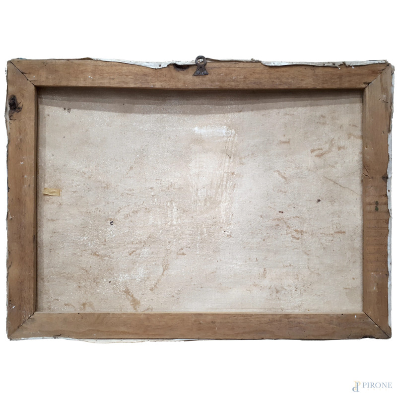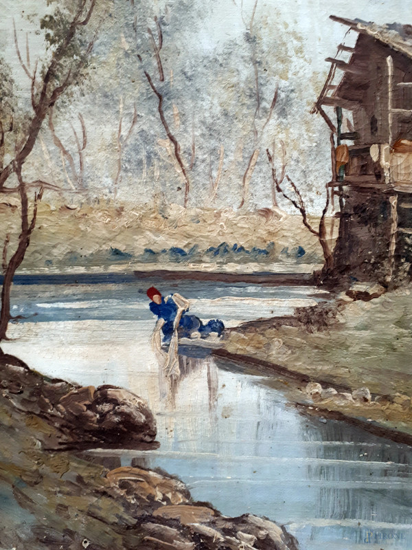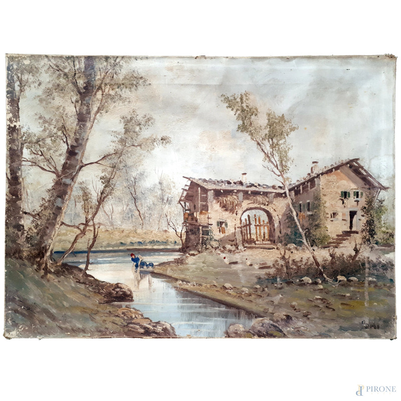 Paesaggio fluviale con cascina e lavandaia, XX secolo, olio su tela, cm 50x68