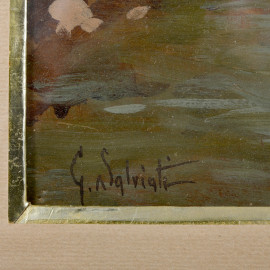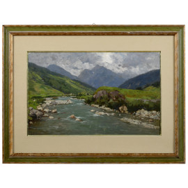 Paesaggio montano con ruscello, XX secolo, olio su cartone, cm 38x43, firmato in basso a sinistra, entro cornice