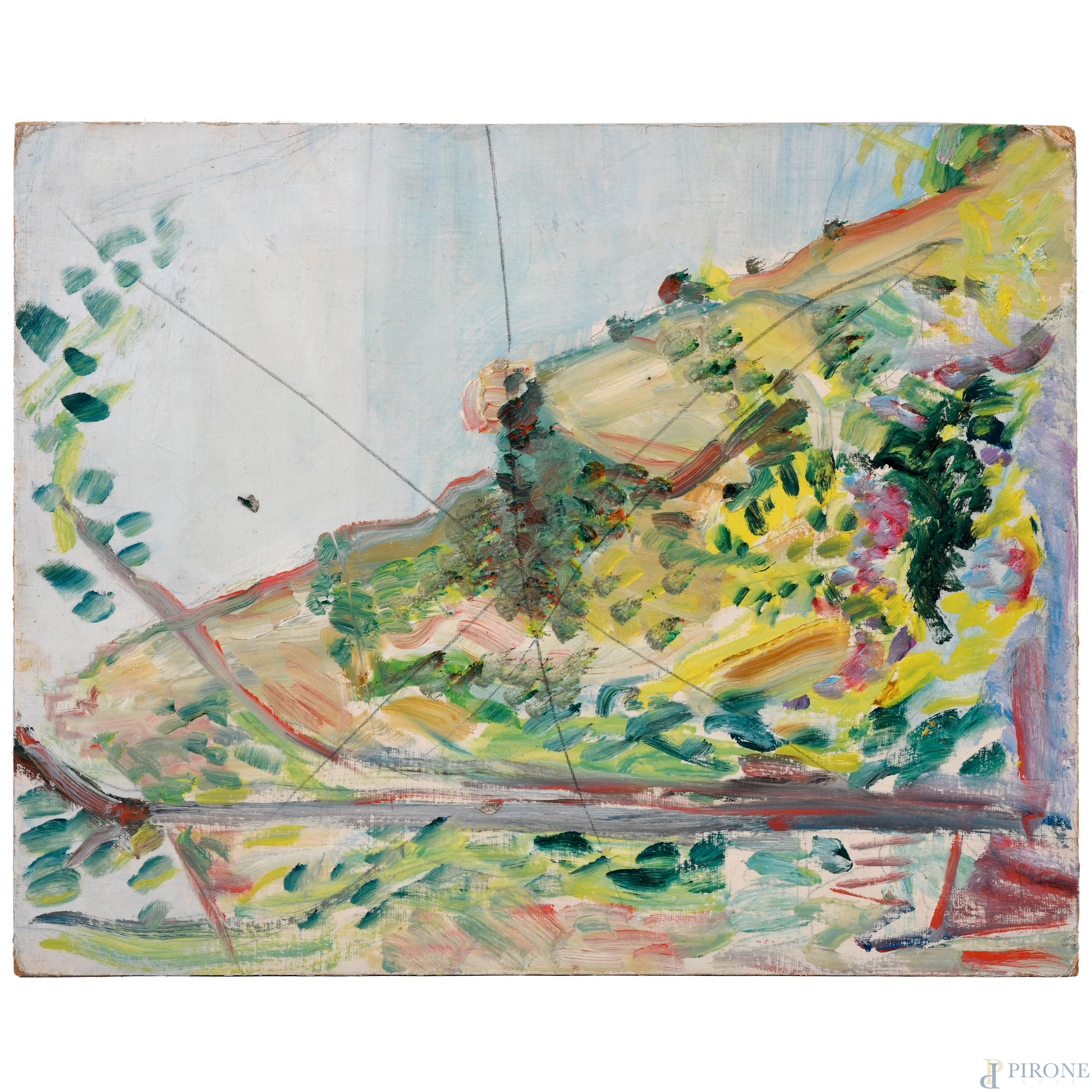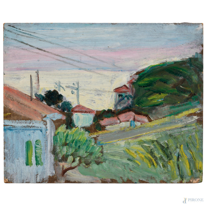 Paesaggio, XX secolo, olio su cartone telato, cm 40x50, (difetti, cadute di colore)