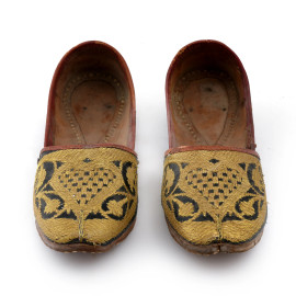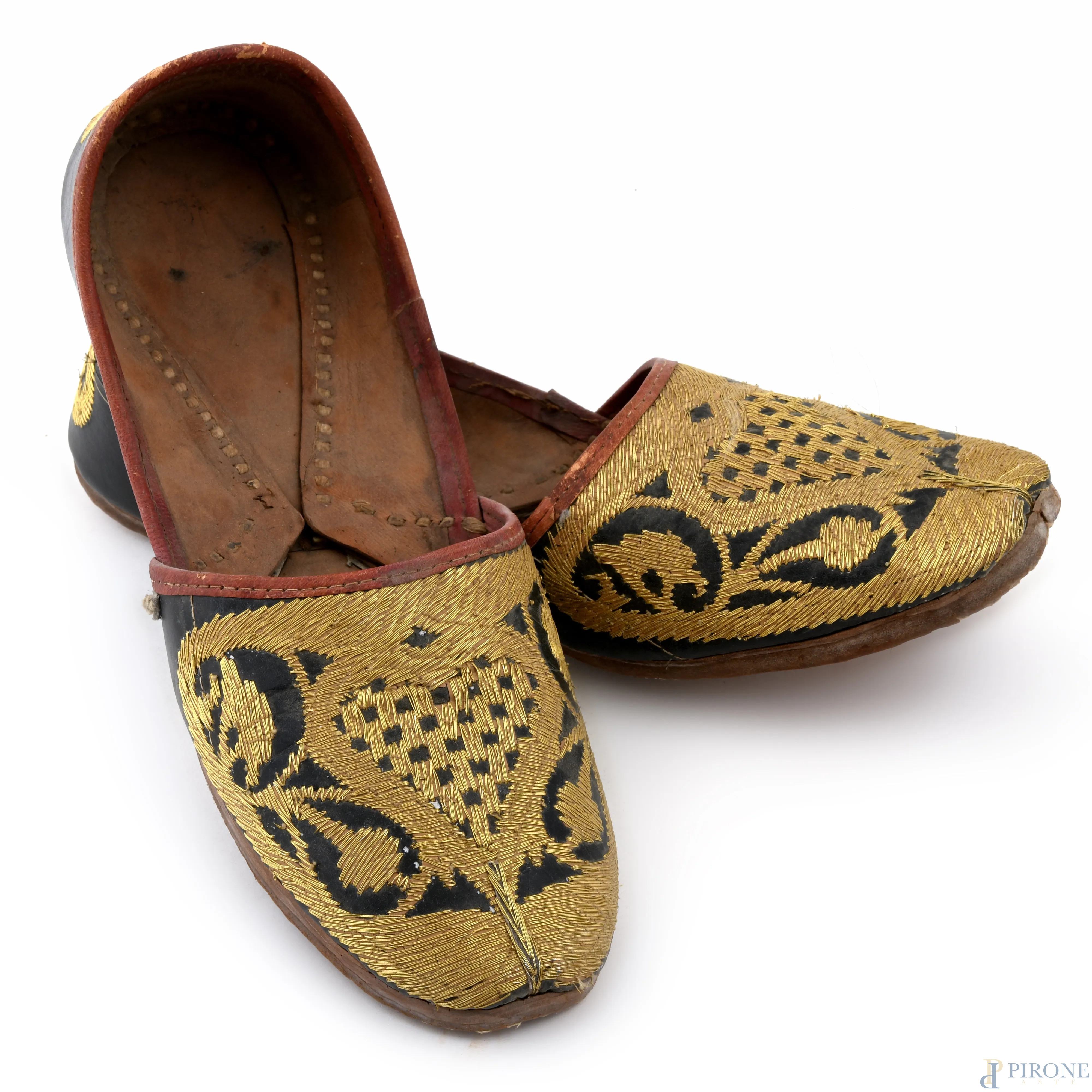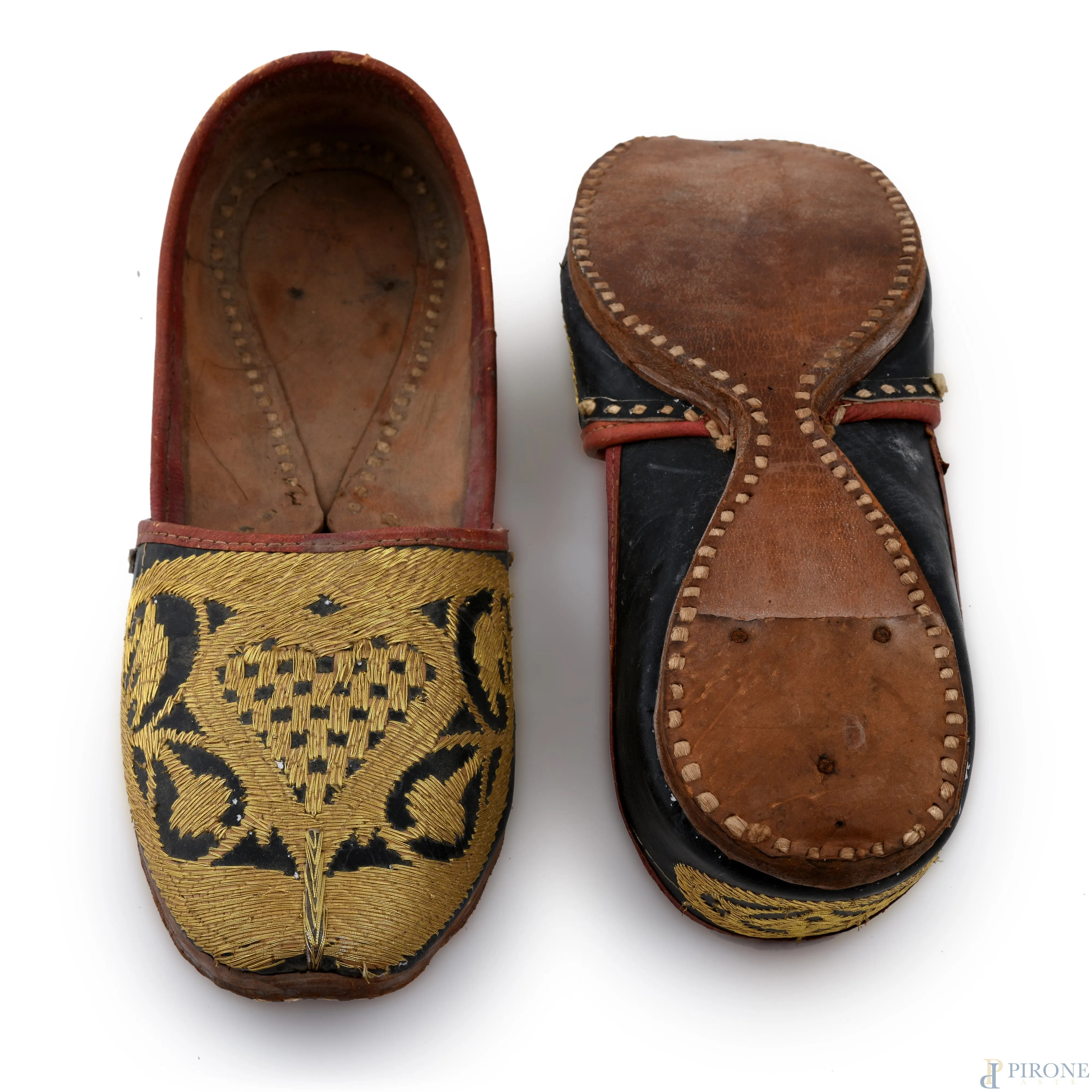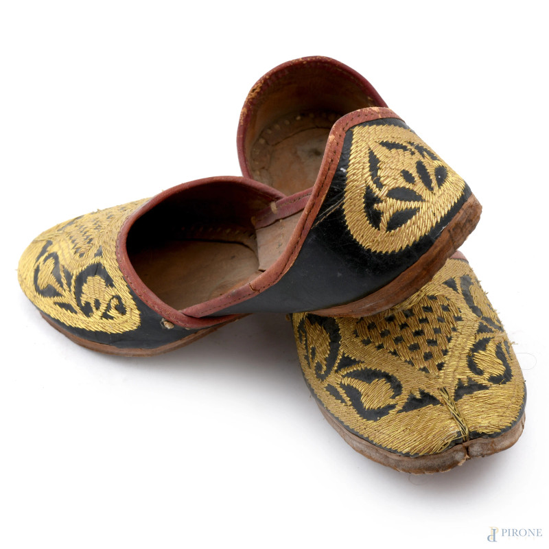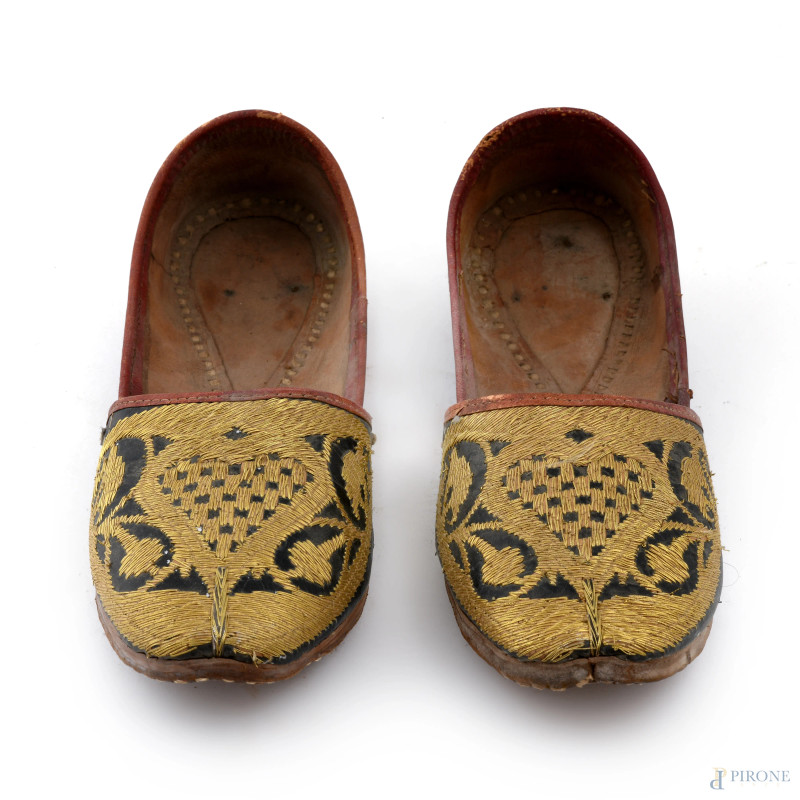 Paio di scarpe in cuoio con ricami oro, (segni di usura, difetti)