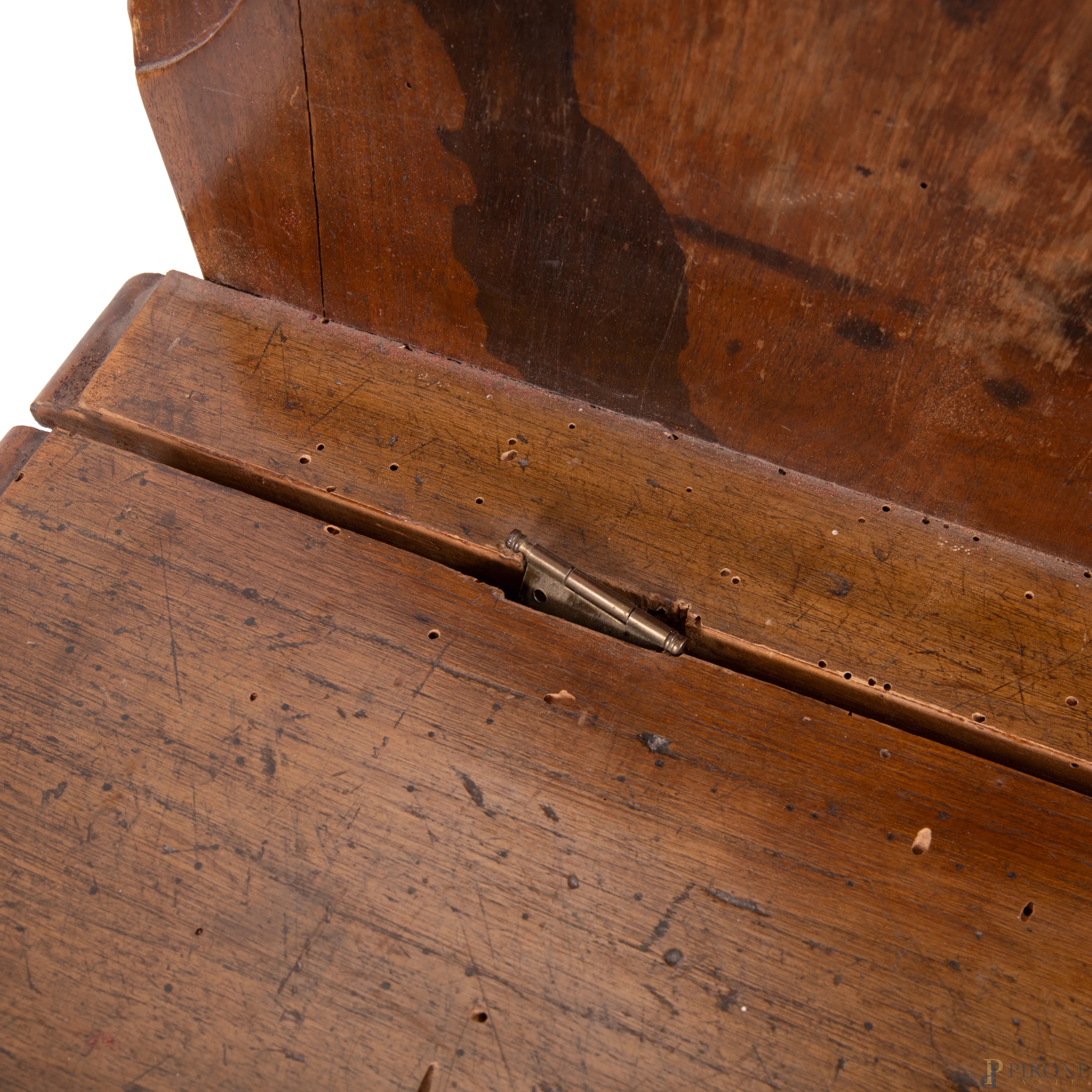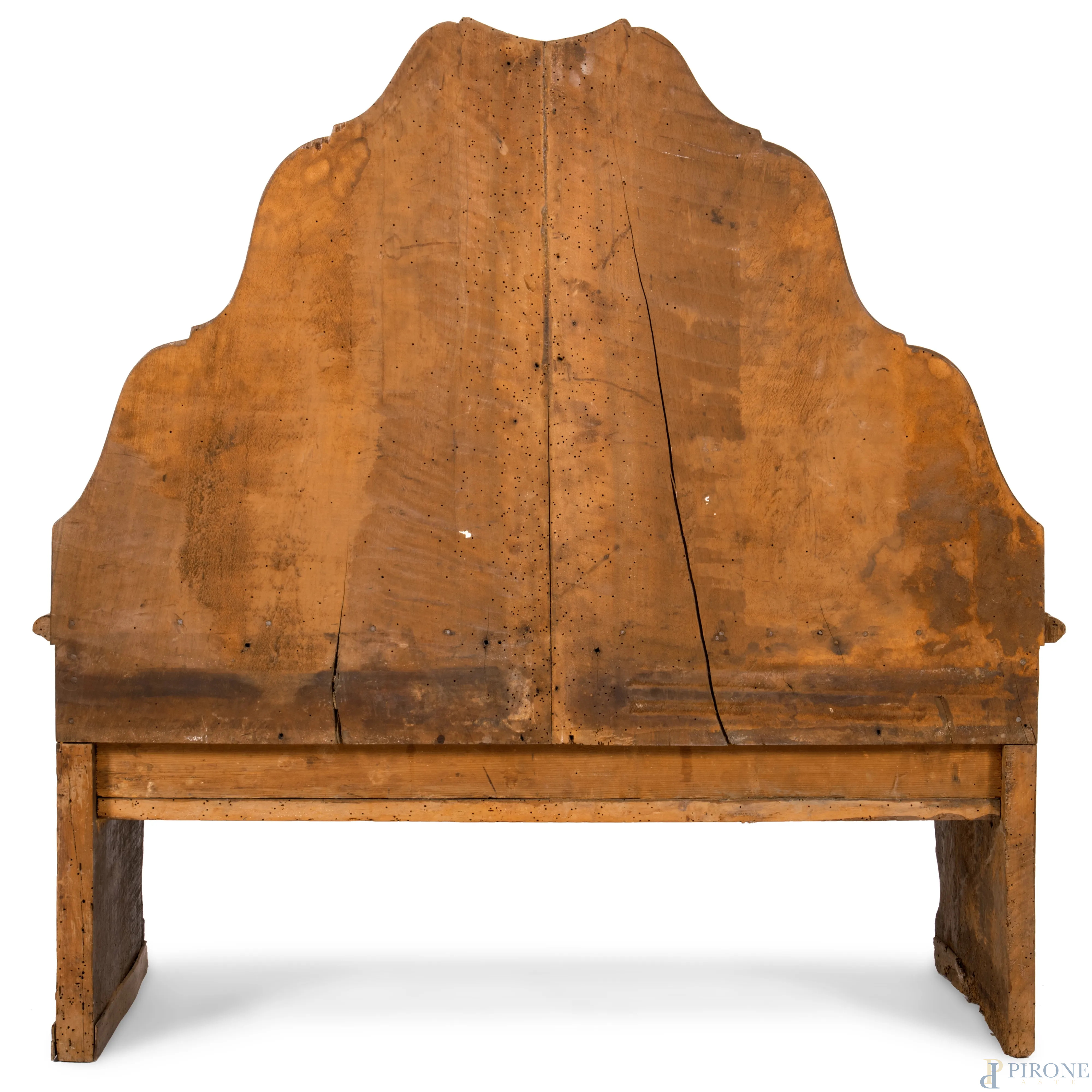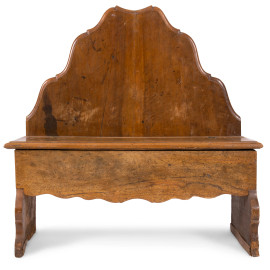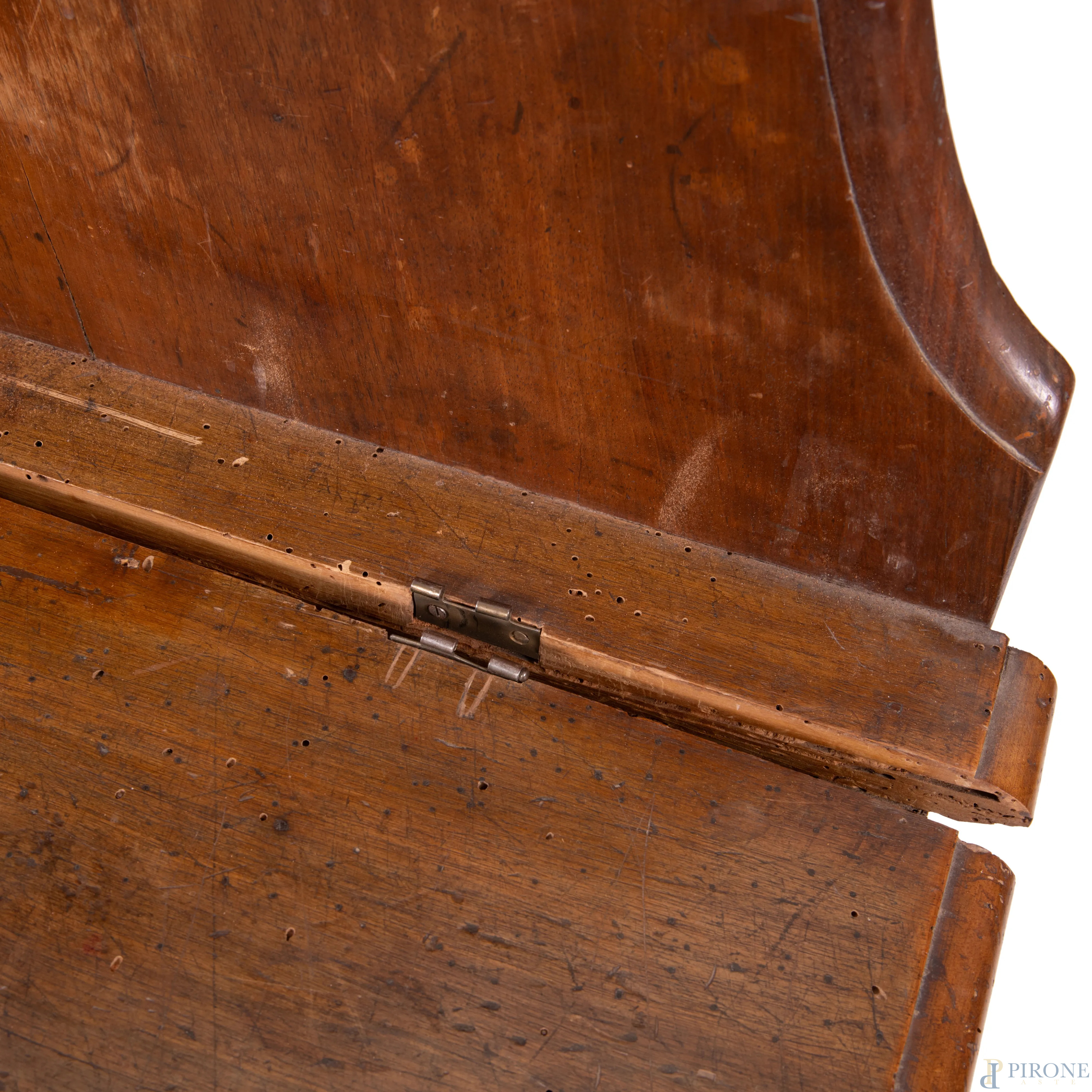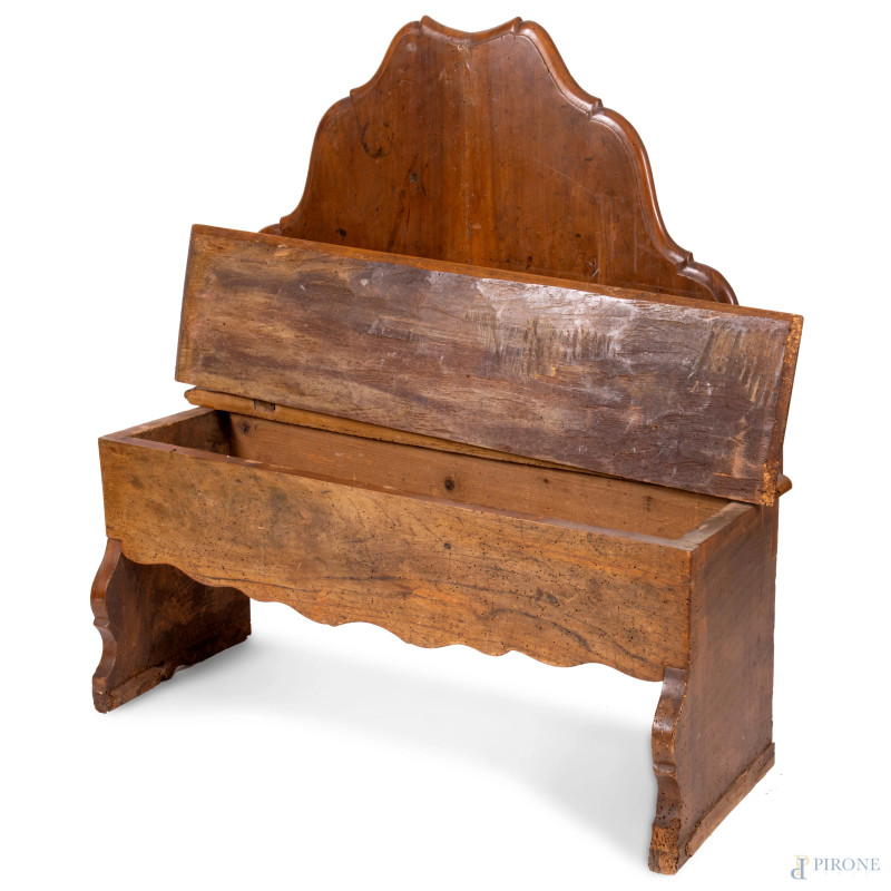 Panchetta in legno con schienale sagomato e seduta apribile a ribalta. XIX secolo, cm 107x105x38, (segni di sura, graffi, scalfiture, rotture)