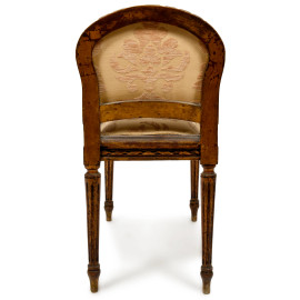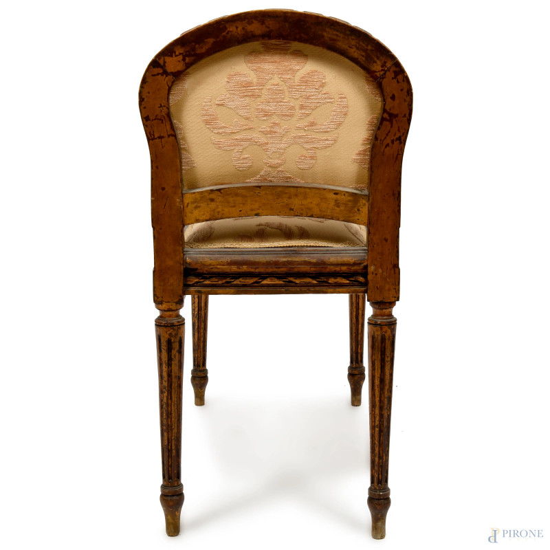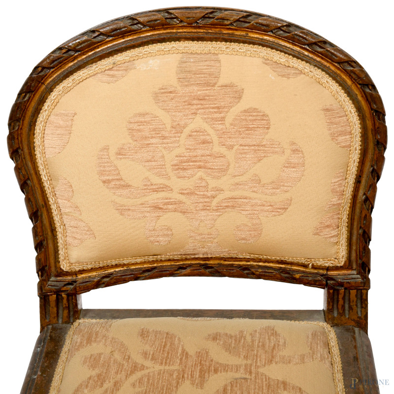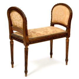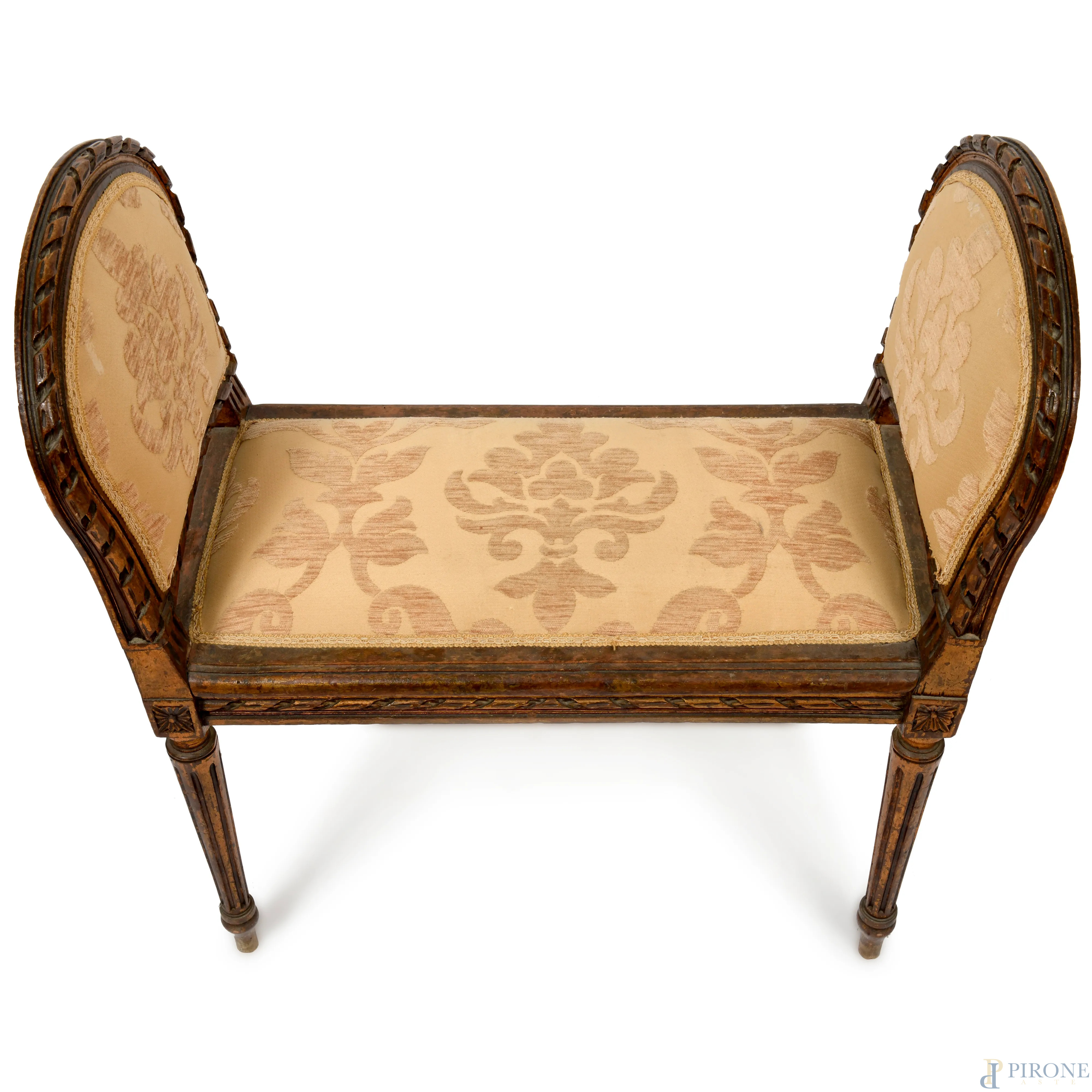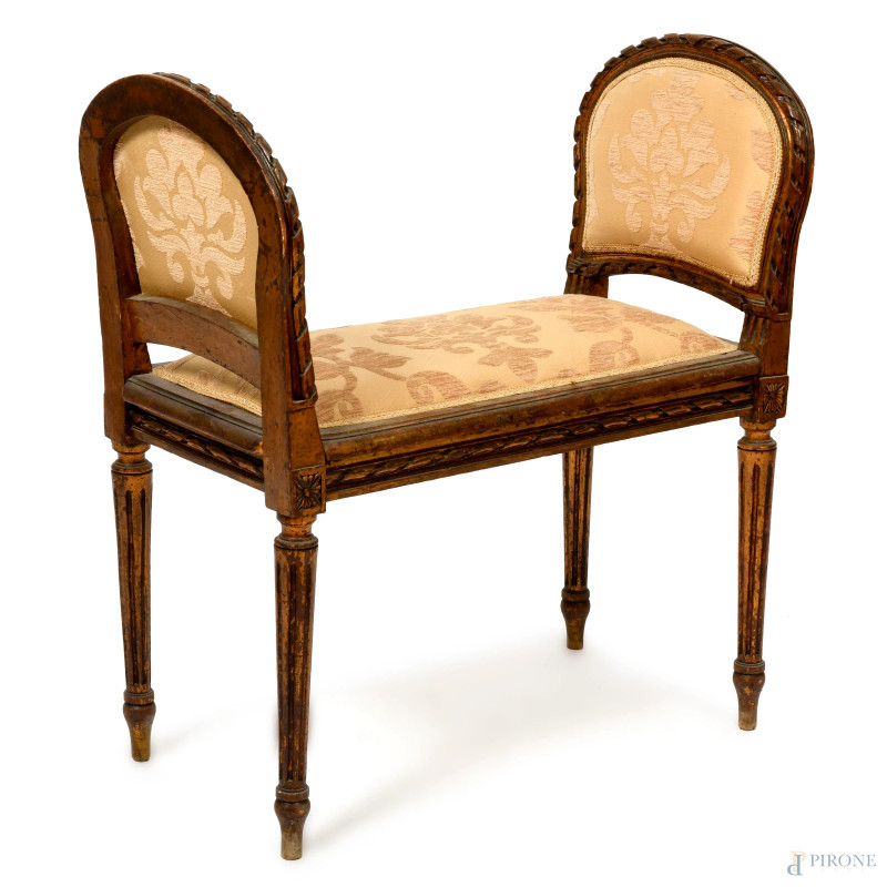 Panchetta in legno intagliato e dorato con gambe tornite. Tappezzeria imbottita in velluto color crema. XX secolo, cm 77x72x35,5