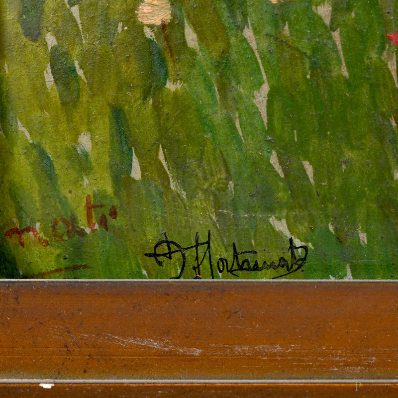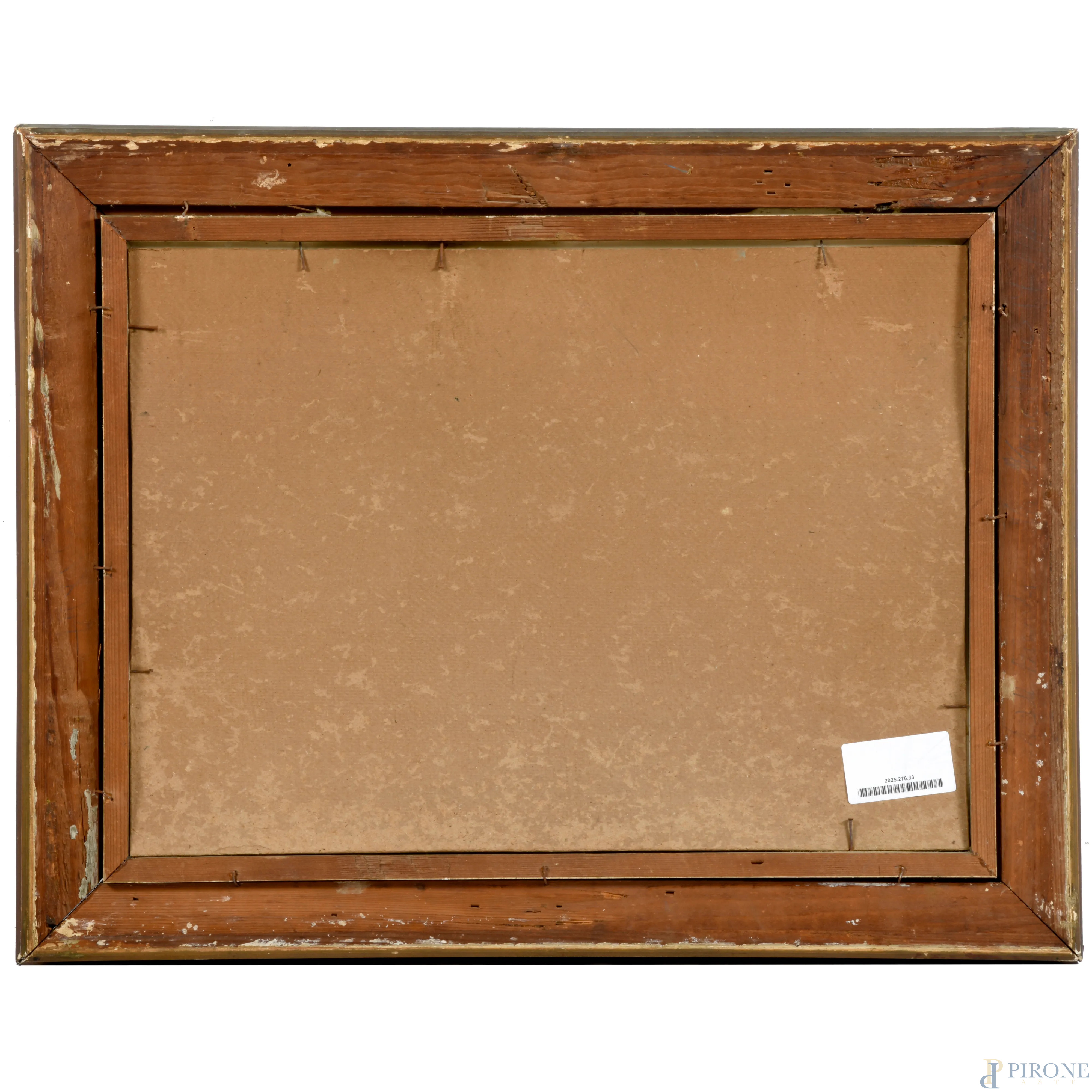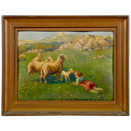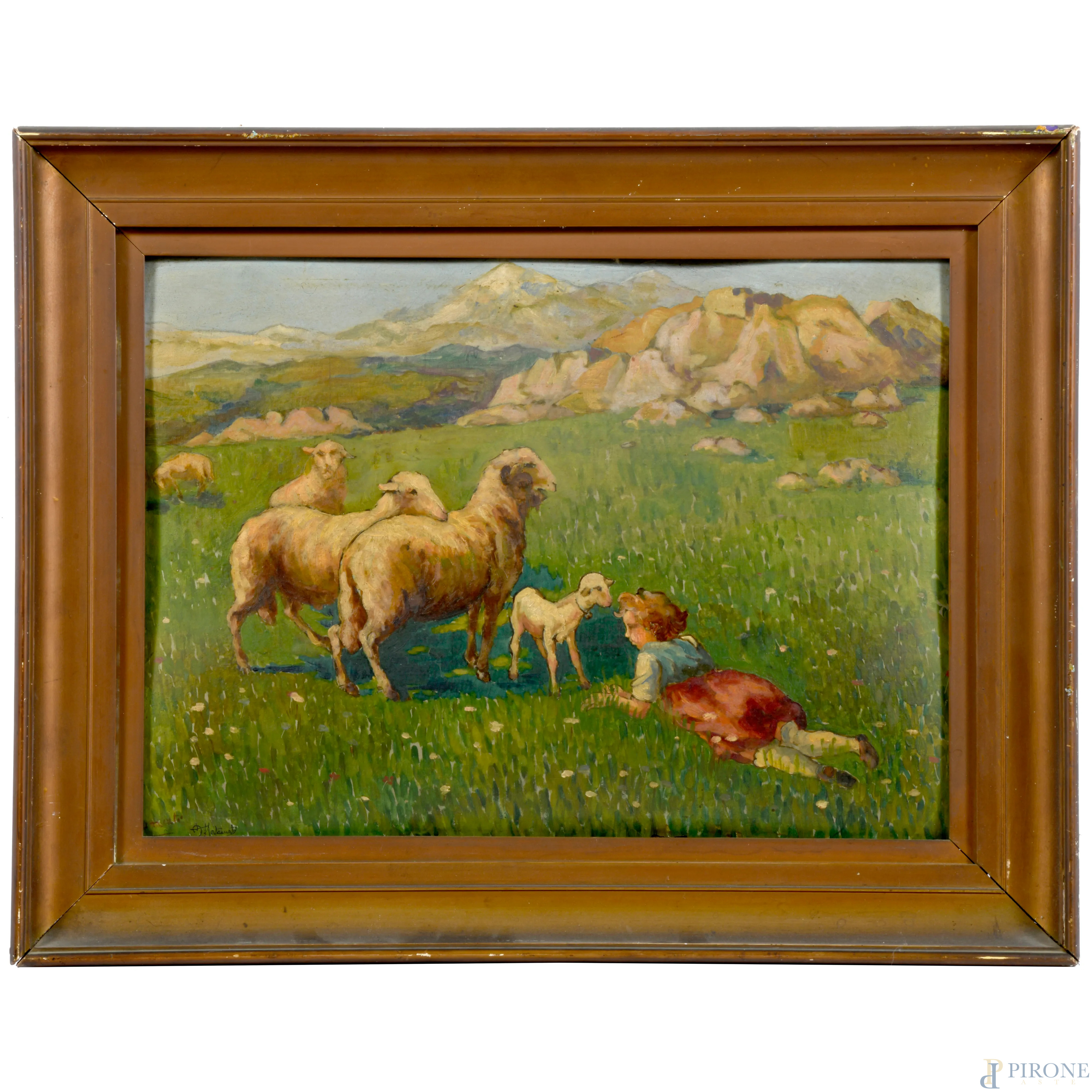 Pastorella con pecore, XX secolo, olio su cartone, cm 32,5x44,5, firmato in basso a sinistra, entro cornice, (cartone imbarcato)