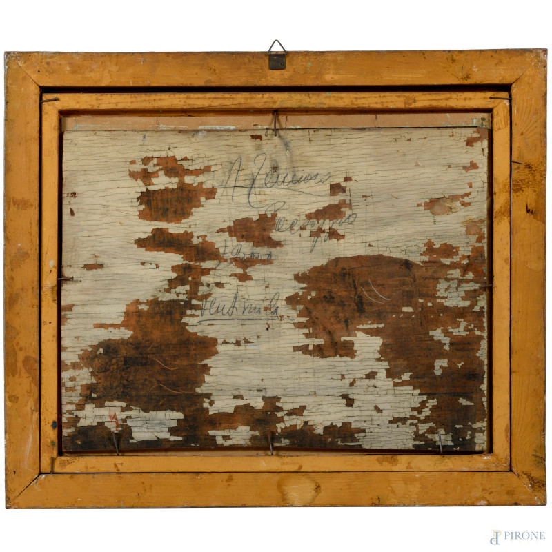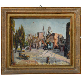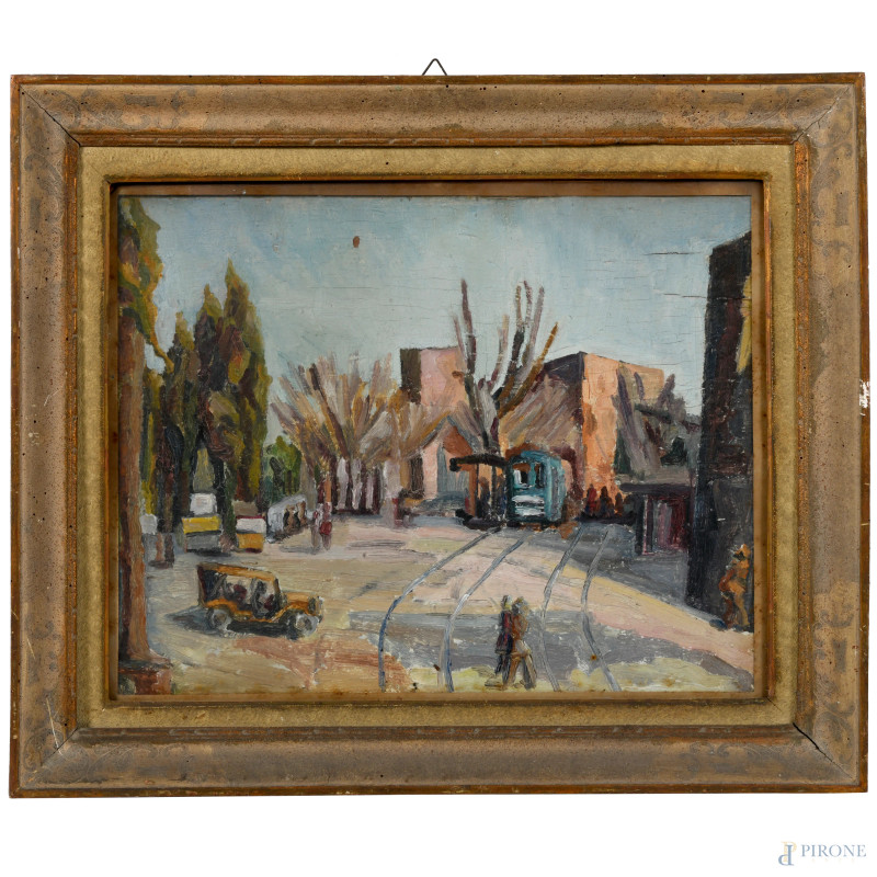 Piazza, XX secolo, olio su compensato, cm 37,5x49, entro cornice, (sollevamenti, cadute di colore)