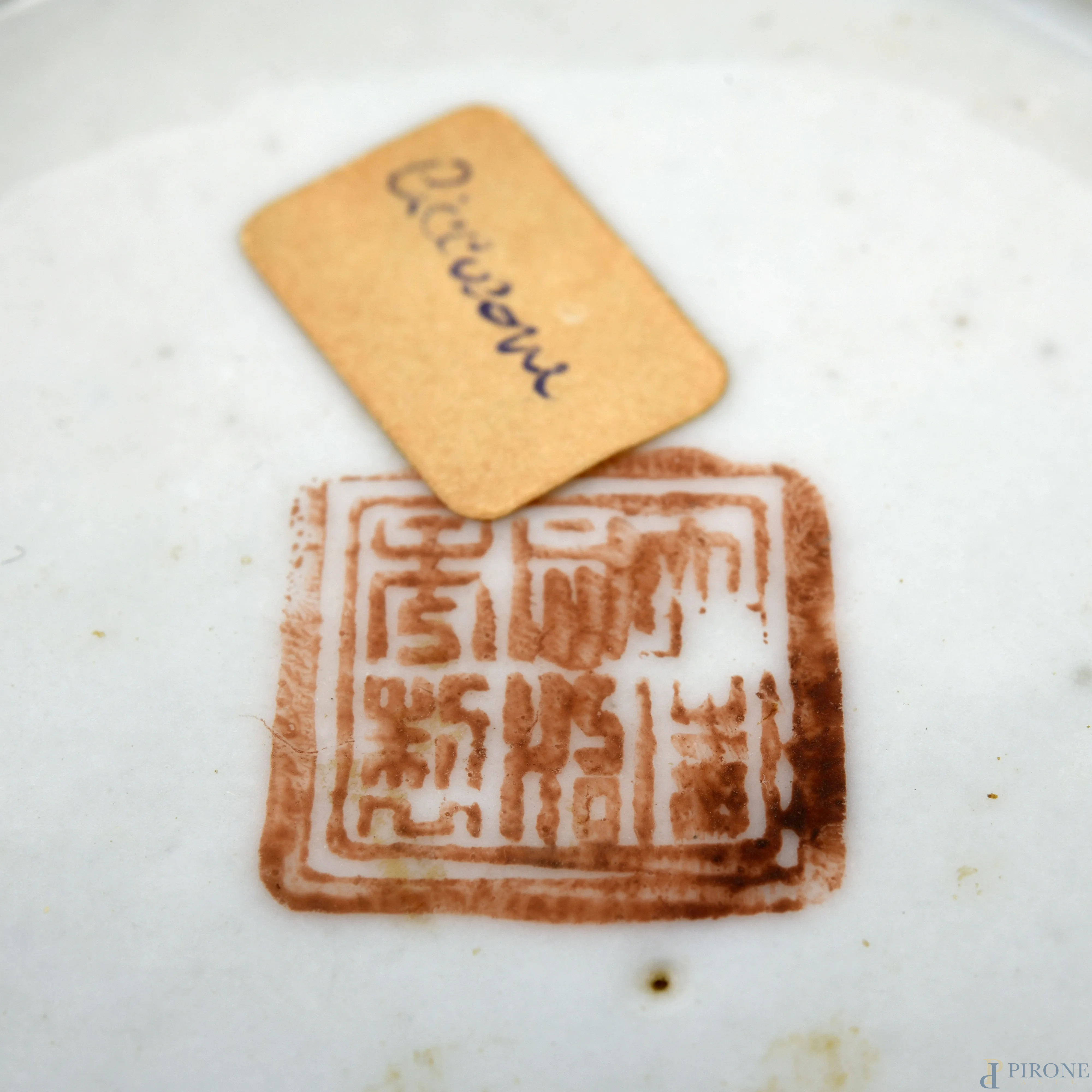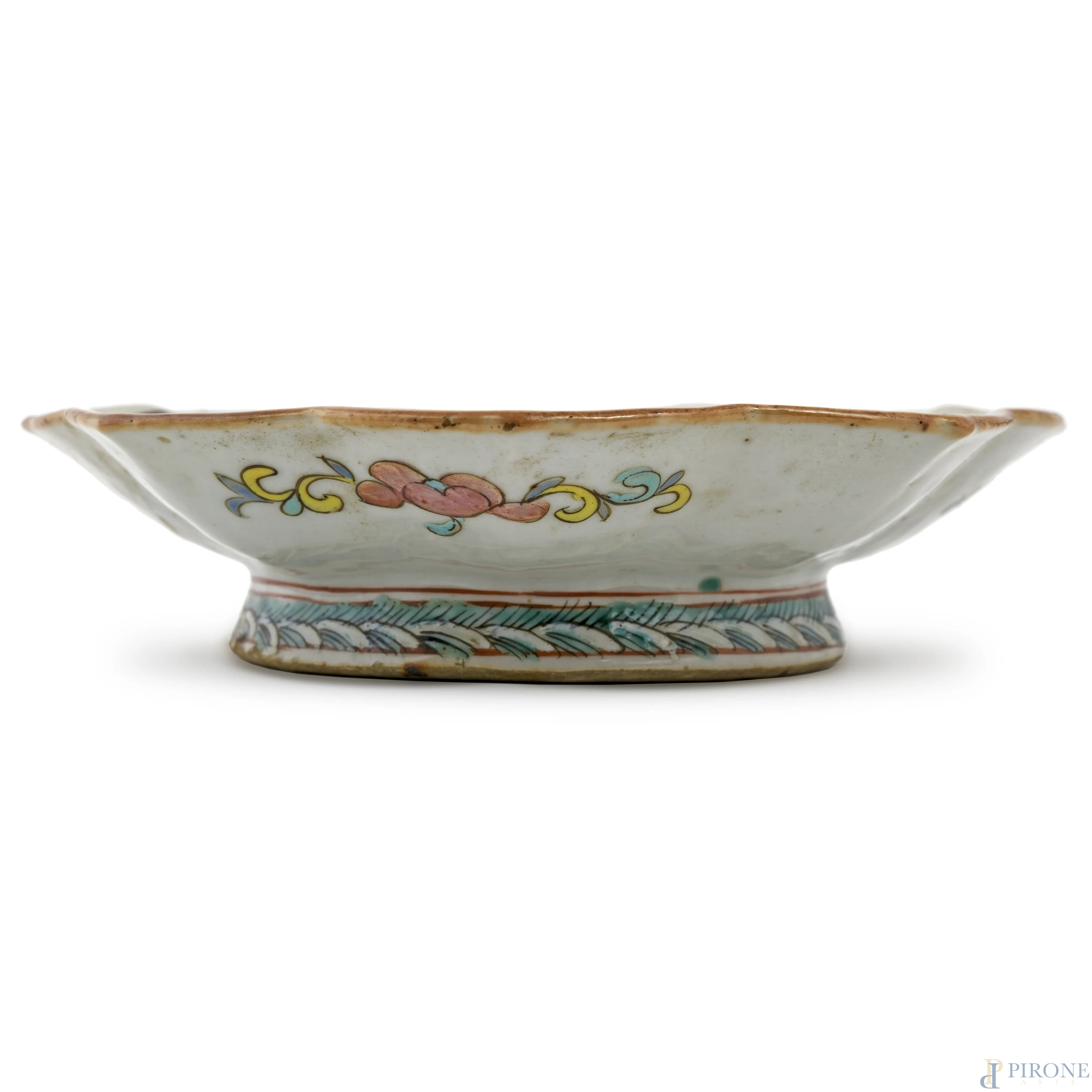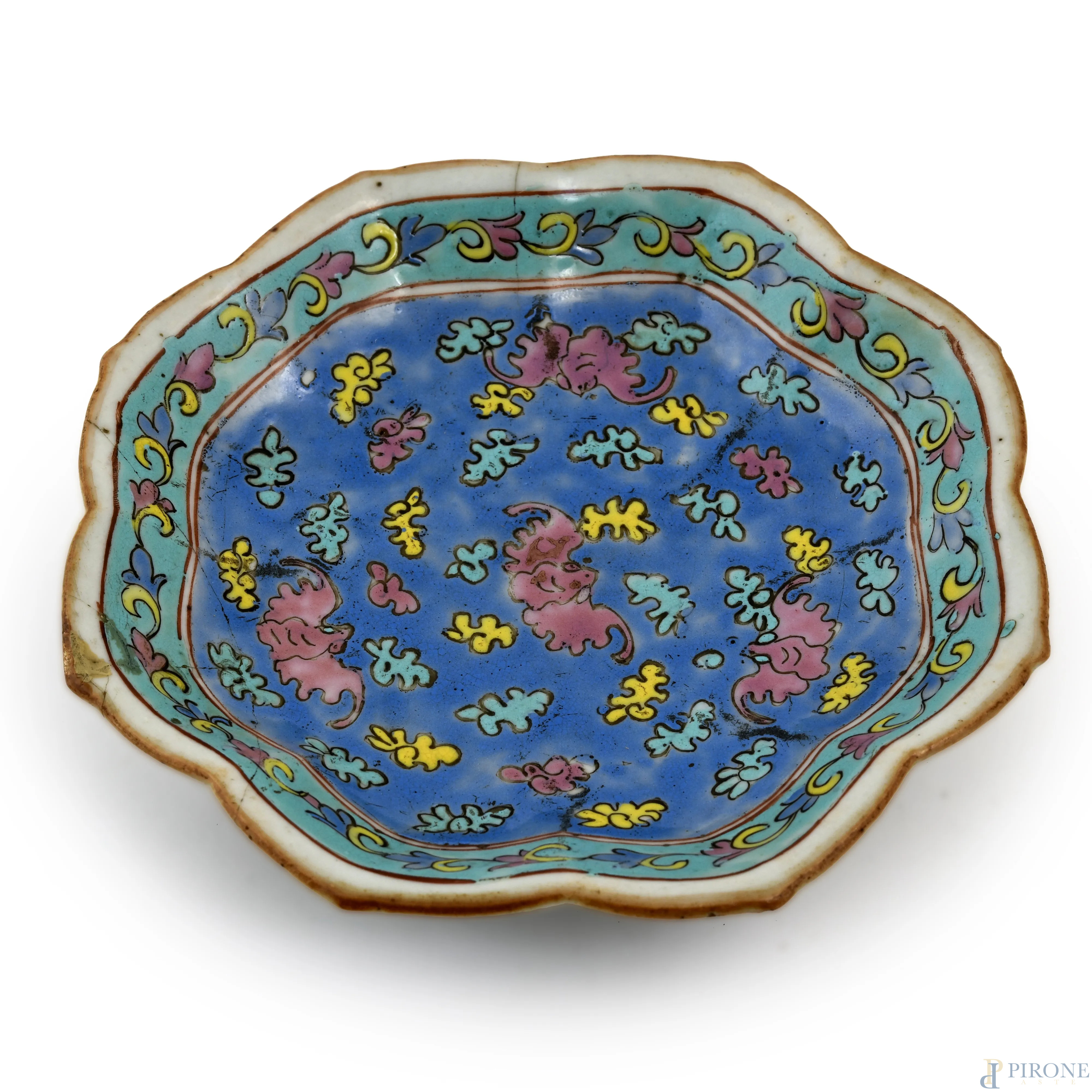 Piccola alzata in ceramica orientale dal bordo orlato con decori a volute policrome, XX secolo, cm 4x17 (difetti di cotture, felature, restauri, difetti)