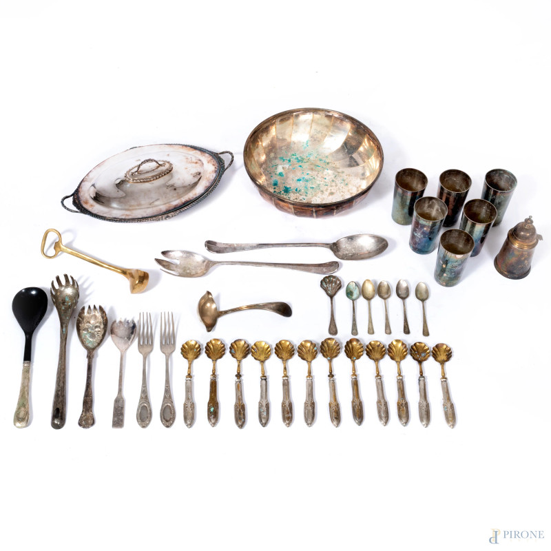 Posate e contenitori di varia manifattura in metallo argentato, XX secolo