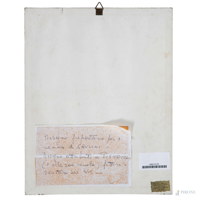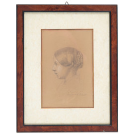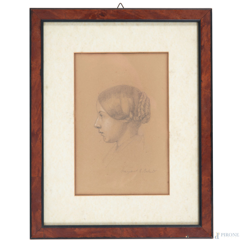 Profilo di fanciulla,XIX secolo, tecnica mista su carta, cm 30x23 compreso passepartout, iscritto in basso a destra, entro cornice, (ondulazioni della carta, foxing, segni di umidità)