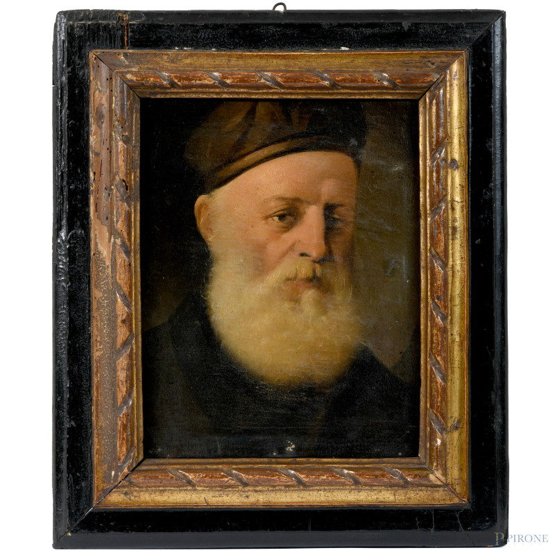 Ritratto di anziano con barba, XIX secolo, olio su tela, cm 40x32,5, entro cornice, (piccole cadute di colore, graffi, ondulazioni, segni di battitura della tela, piccolo foro)