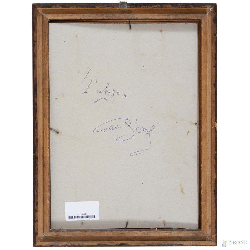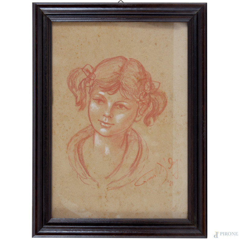 Ritratto di bambina, disegno a tecnica mista su carta, XX secolo, cm34,5x25, firmato e datato in basso a destra, entro cornice, (fore e segni di umidità)