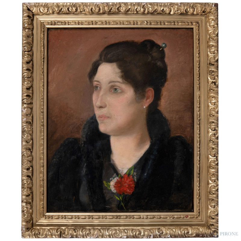 Ritratto di donna, XIX-XX secolo, olio su tela, cm 51x40, entro cornice, (lievi abrasioni, cadute di colore)