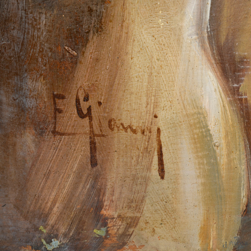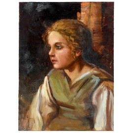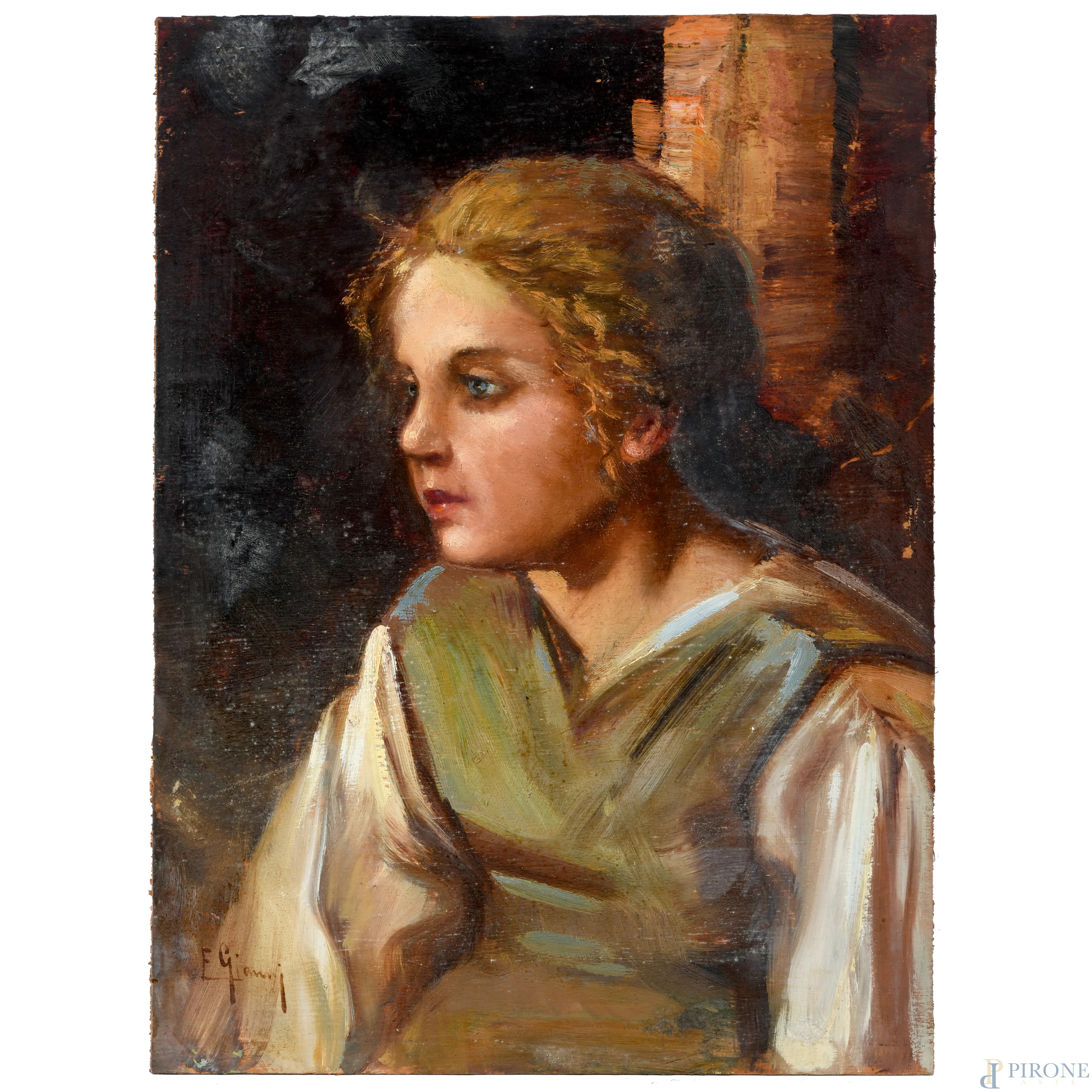 Ritratto di fanciulla, XX secolo, olio su tavola, cm 40x30, firmato in basso a sinistra, (cadute di colore, difetti)