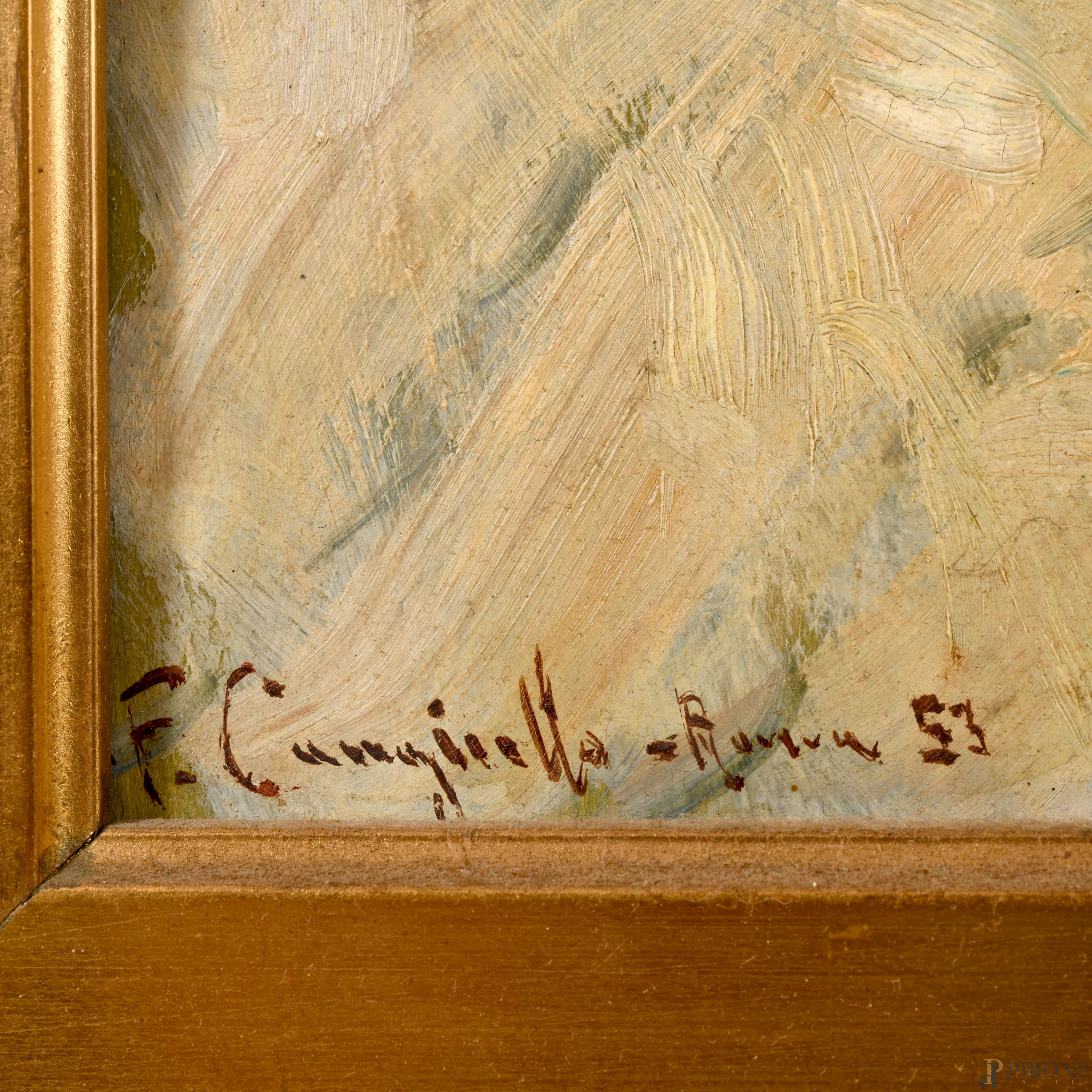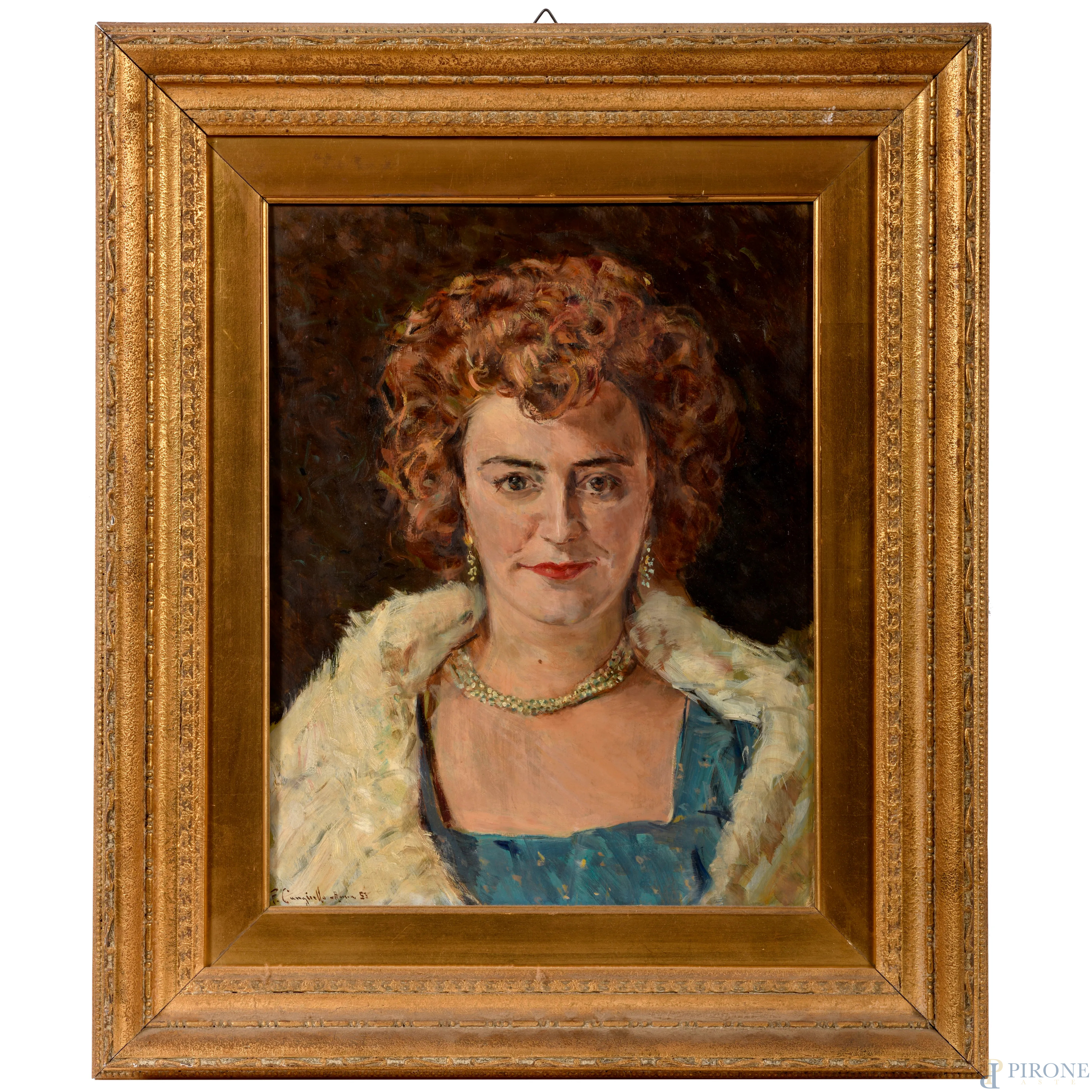 Ritratto di gentildonna, XX secolo, olio su compensato, cm 45x35, firmato e datato "Roma 53" in basso a sinistra, entro cornice