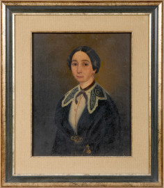 Ritratto di signora, XX secolo, olio su tela, cm 41x33,5, entro cornice, (craquelure, piccole cadute di colore, piccolo foro)