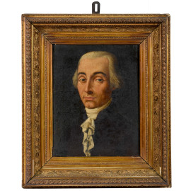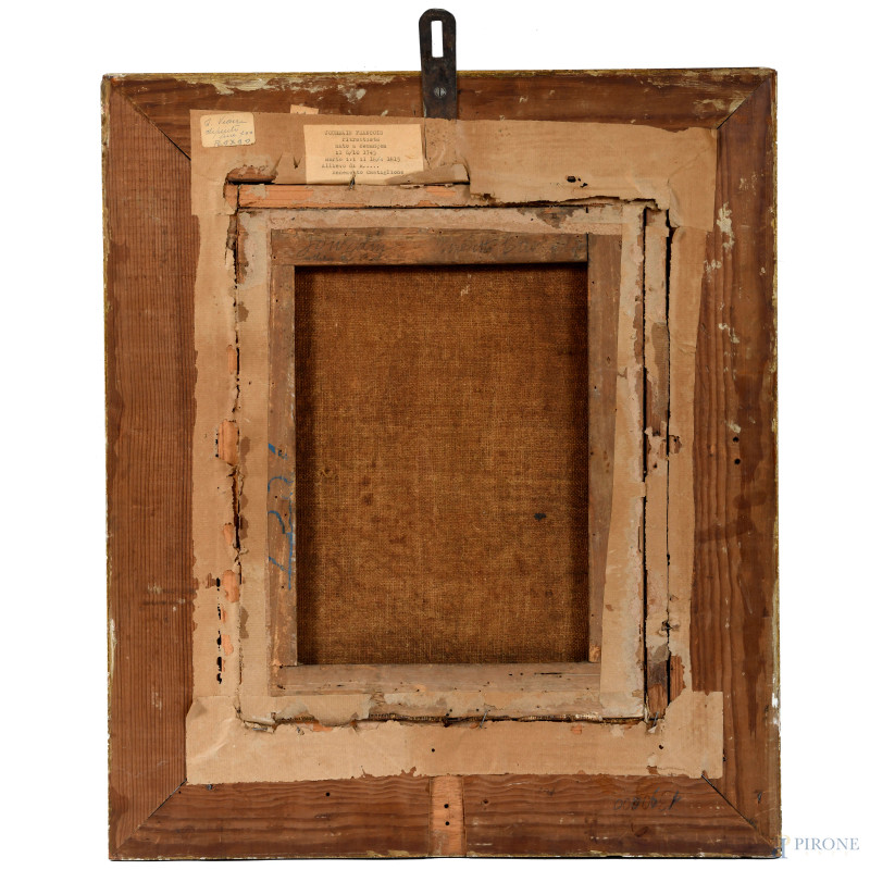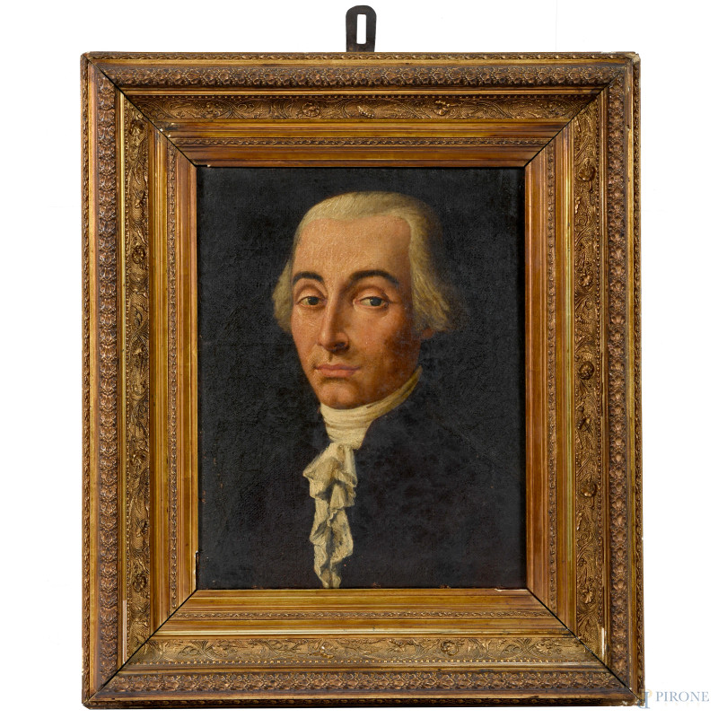 Ritratto gentiluomo, XIX-XX secolo, olio su tela, cm38,5x30,5, entro cornice, (ondulazioni della tela, graffi e abrasioni)
