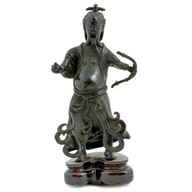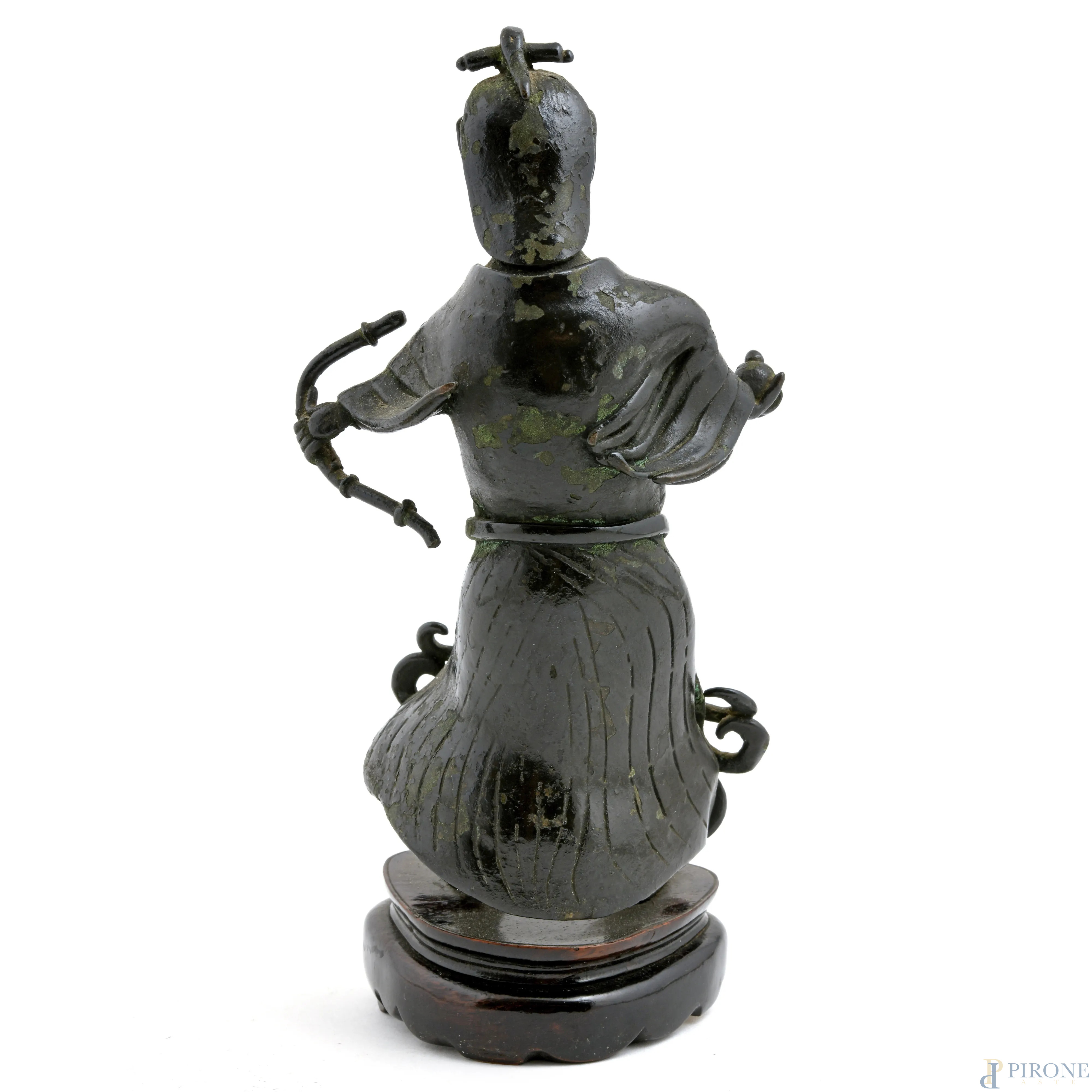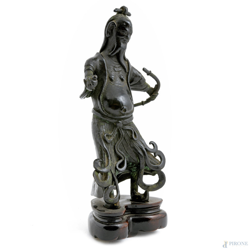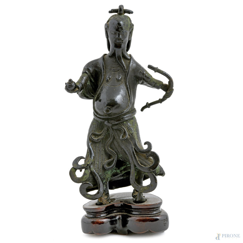 Samurai, scultura in bronzo su base in teak, XX secolo, altezza cm 21, (segni di usura)