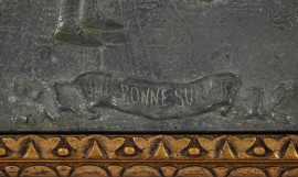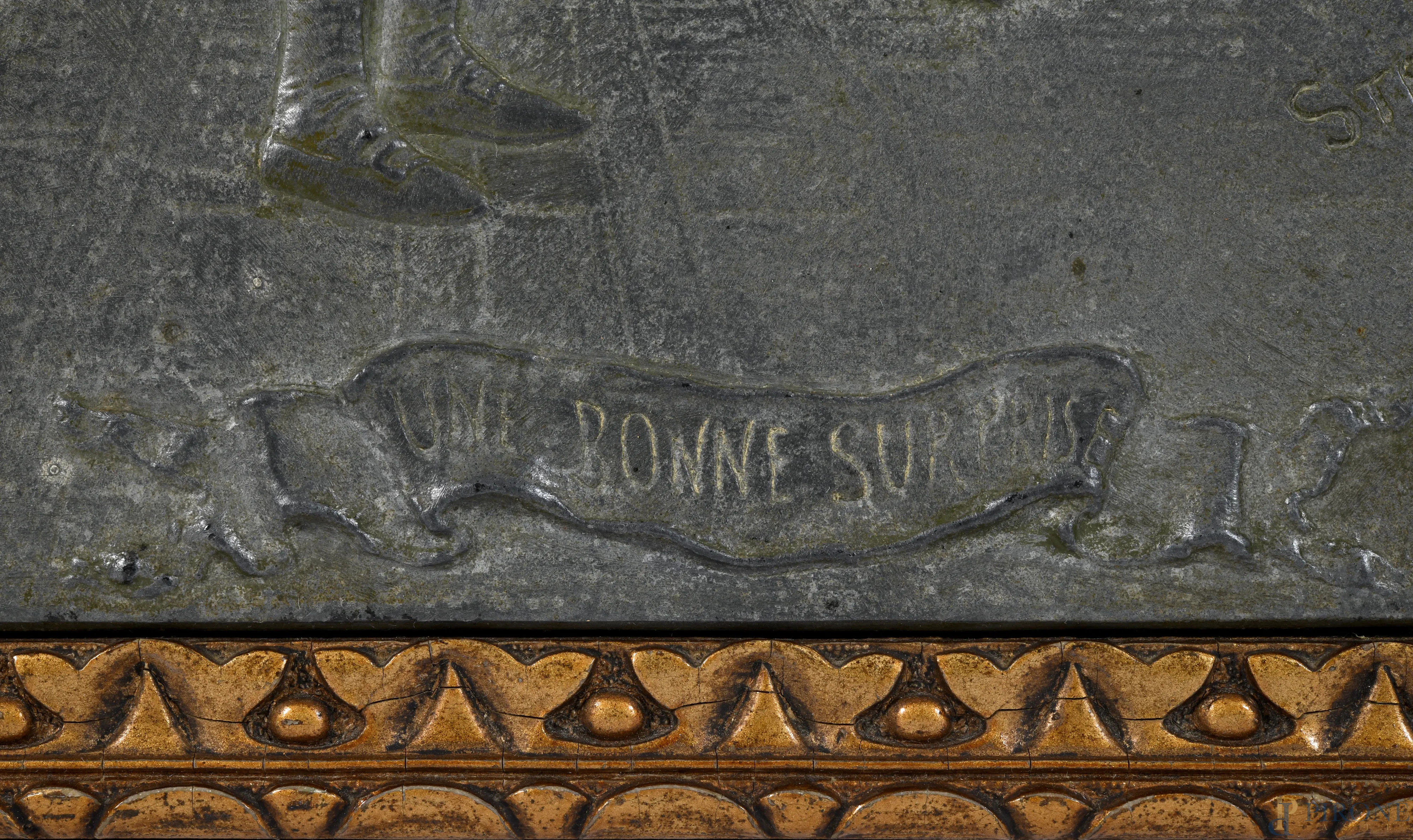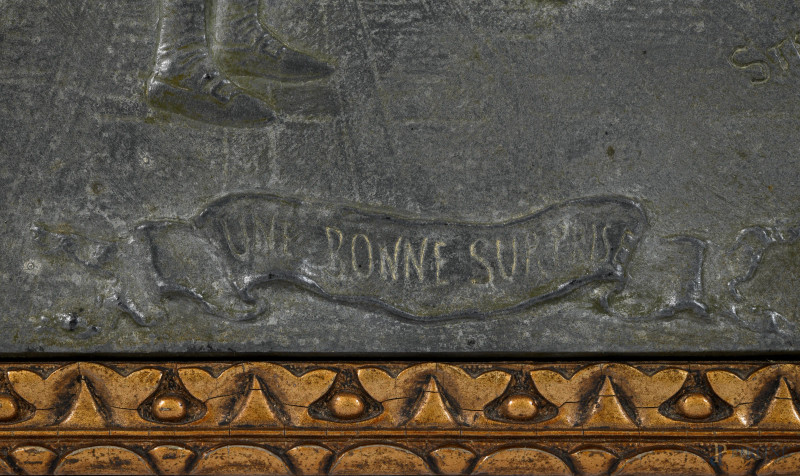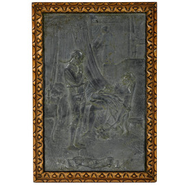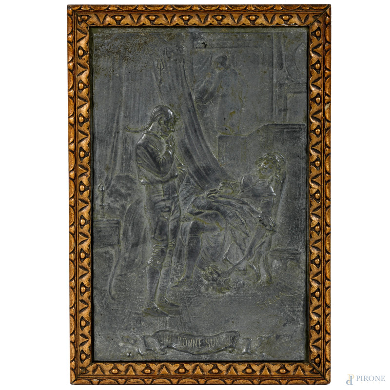 Scena erotica, XX secolo, placca in metallo brunito, cm 24x15,5. entro cornice, (usura del tempo)