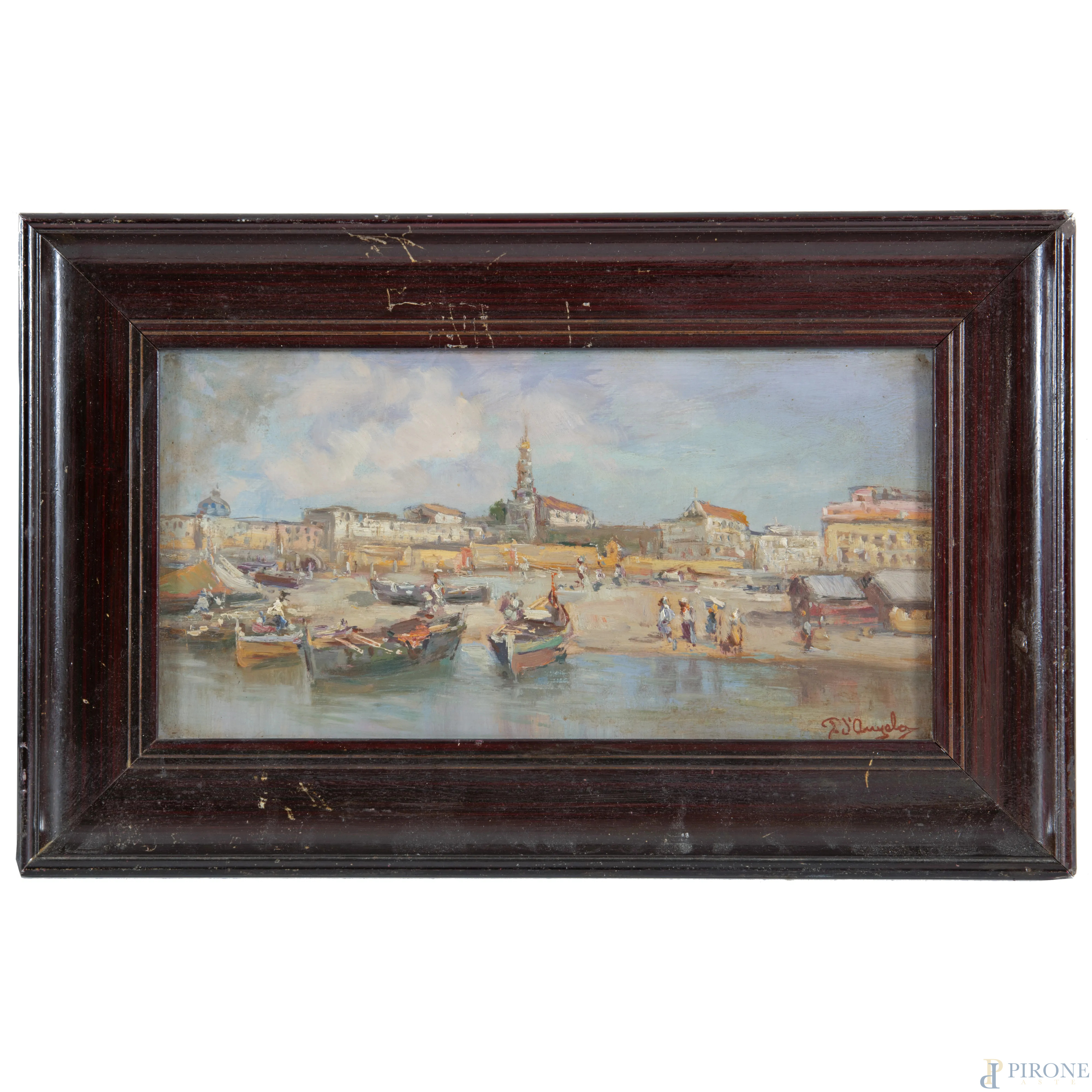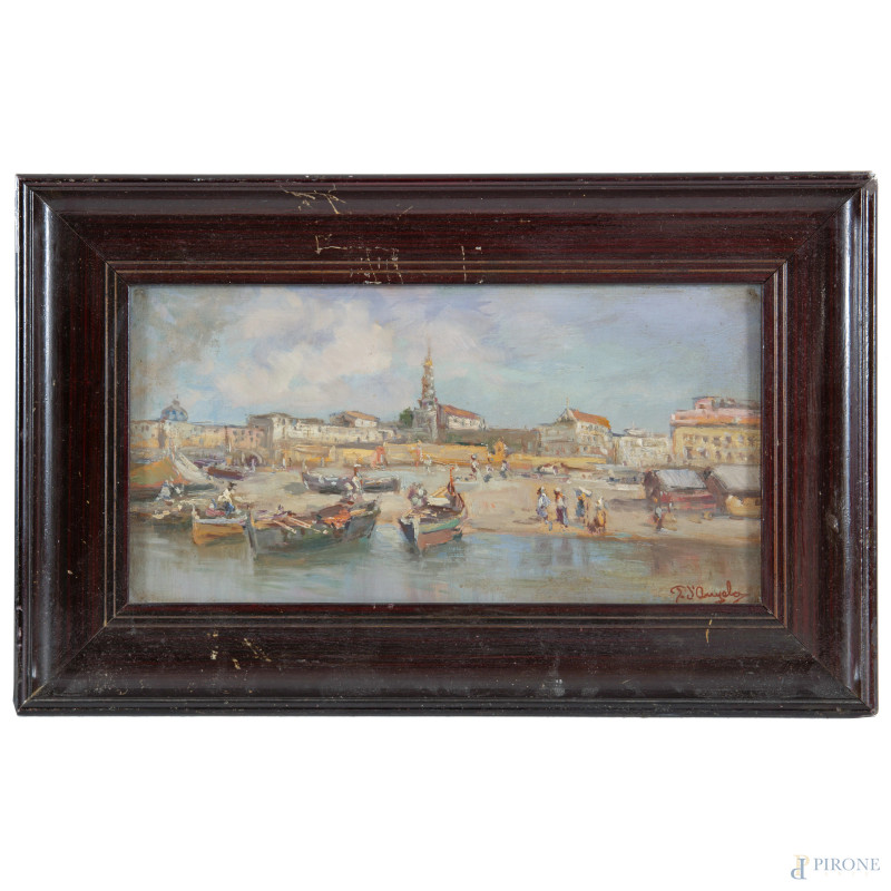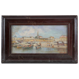 Scorcio di costa con barche, XX secolo, olio su cartone, cm 18x35, firmato in basso a destra, entro cornice