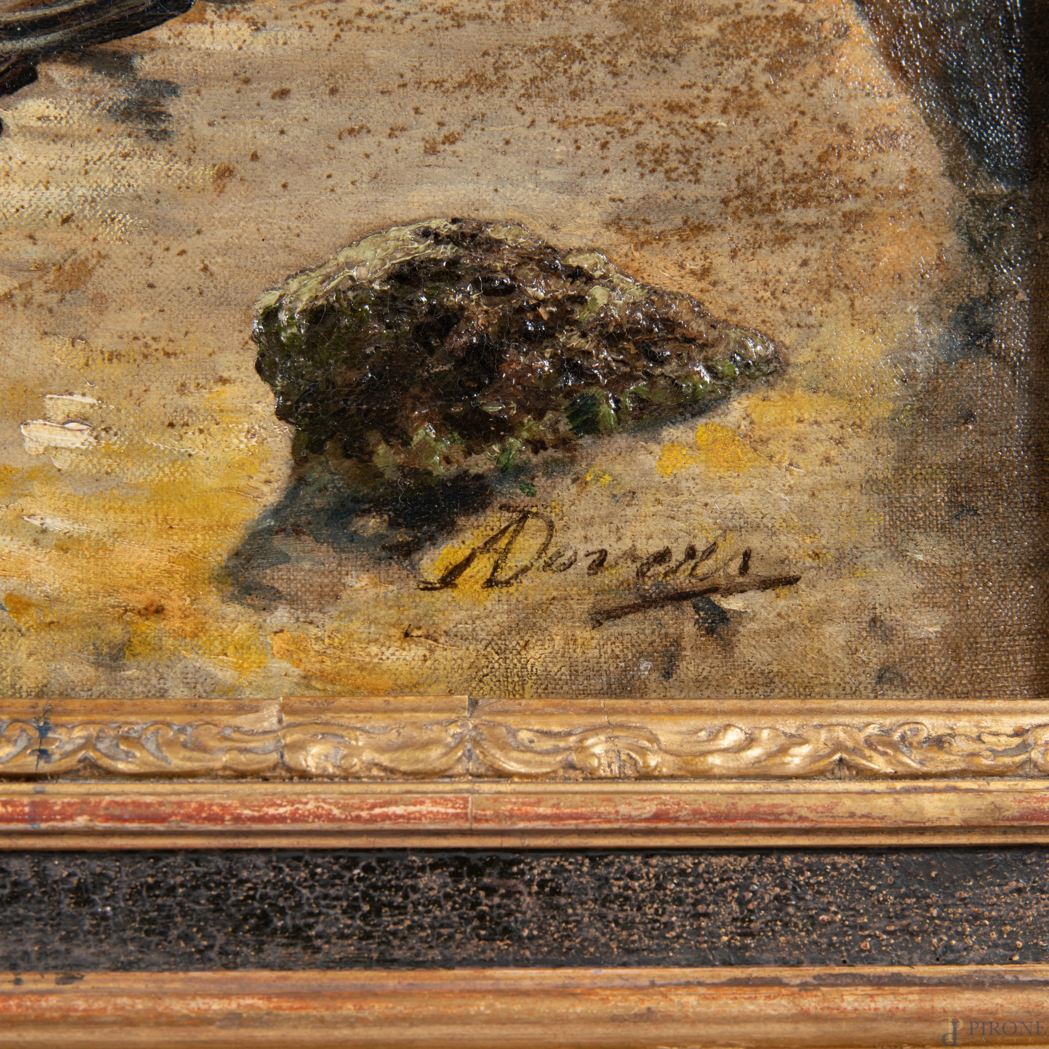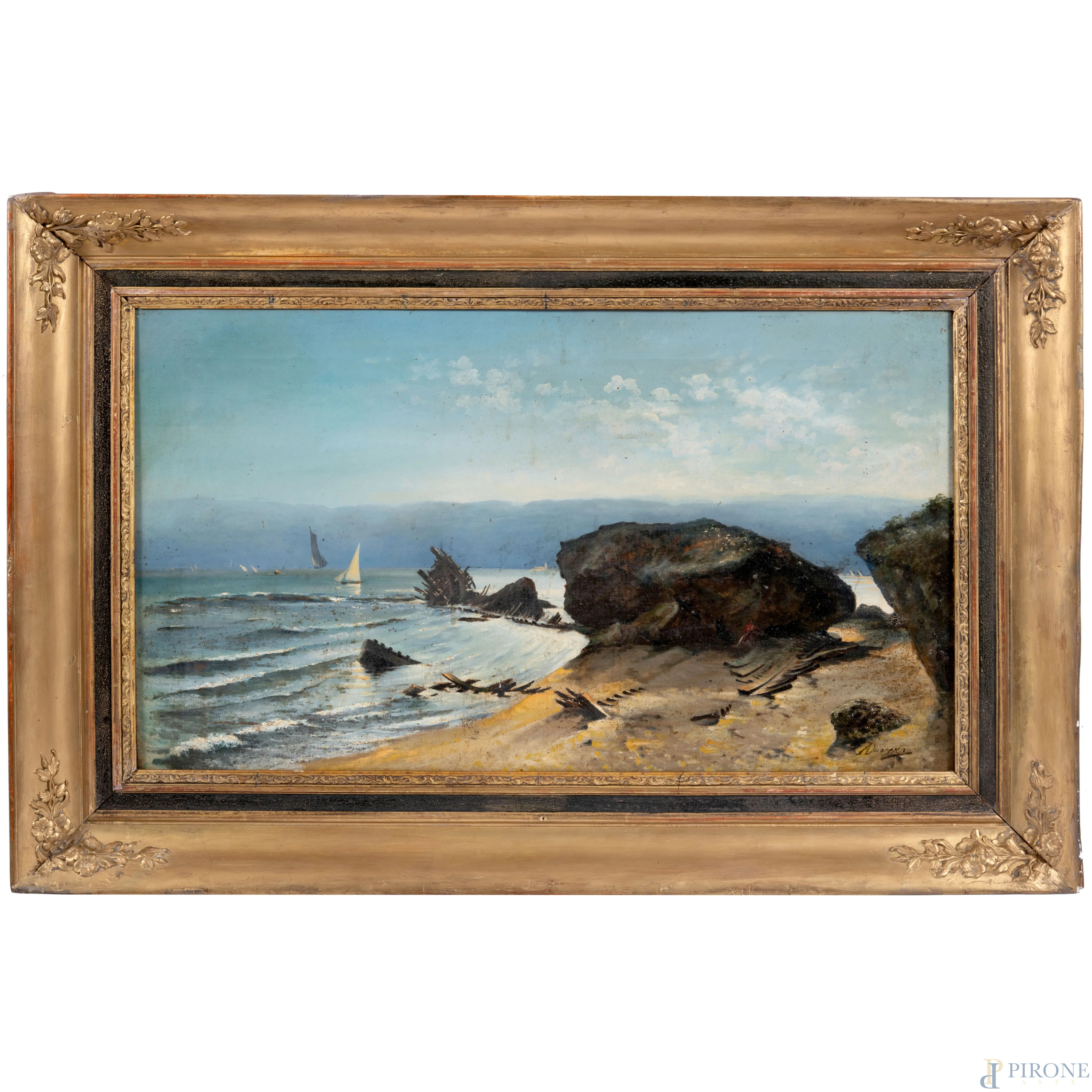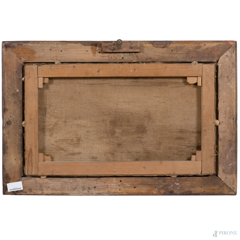 Scorcio di costa con imbarcazioni, XX secolo, olio su tela, cm 41x70, firmato in basso a destra, entro cornice, (sollevamenti di colore, tracce di umidità)