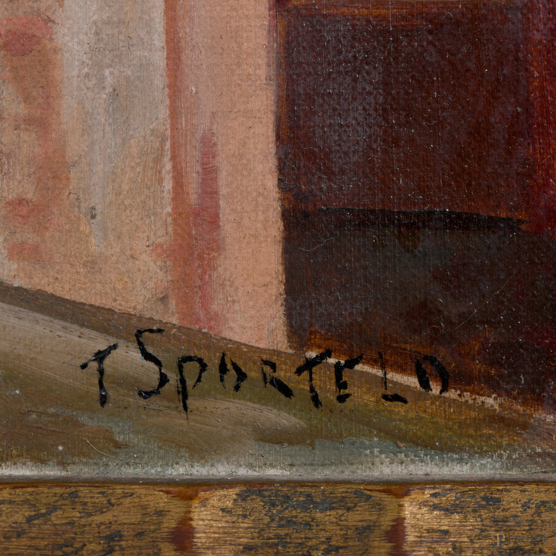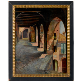 Scorcio di paese, XX secolo, olio su cartone telato, cm 56x44, firmato in basso a destra, entro cornice, (piccole abrasioni, graffi)