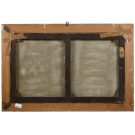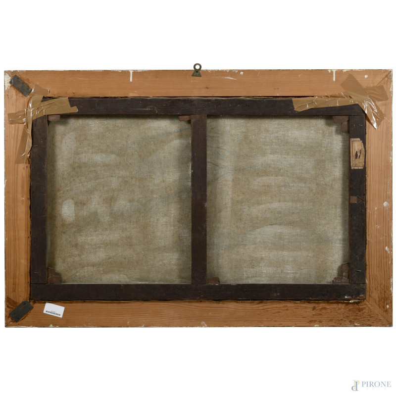 Scorcio di sentiero con figure, XX secolo, olio su tela, cm 58x98, entro cornice, (mancanza di tensione della tel, cadute di colore)