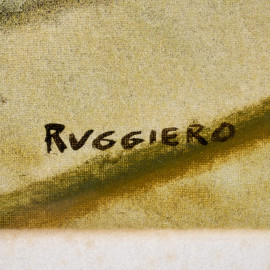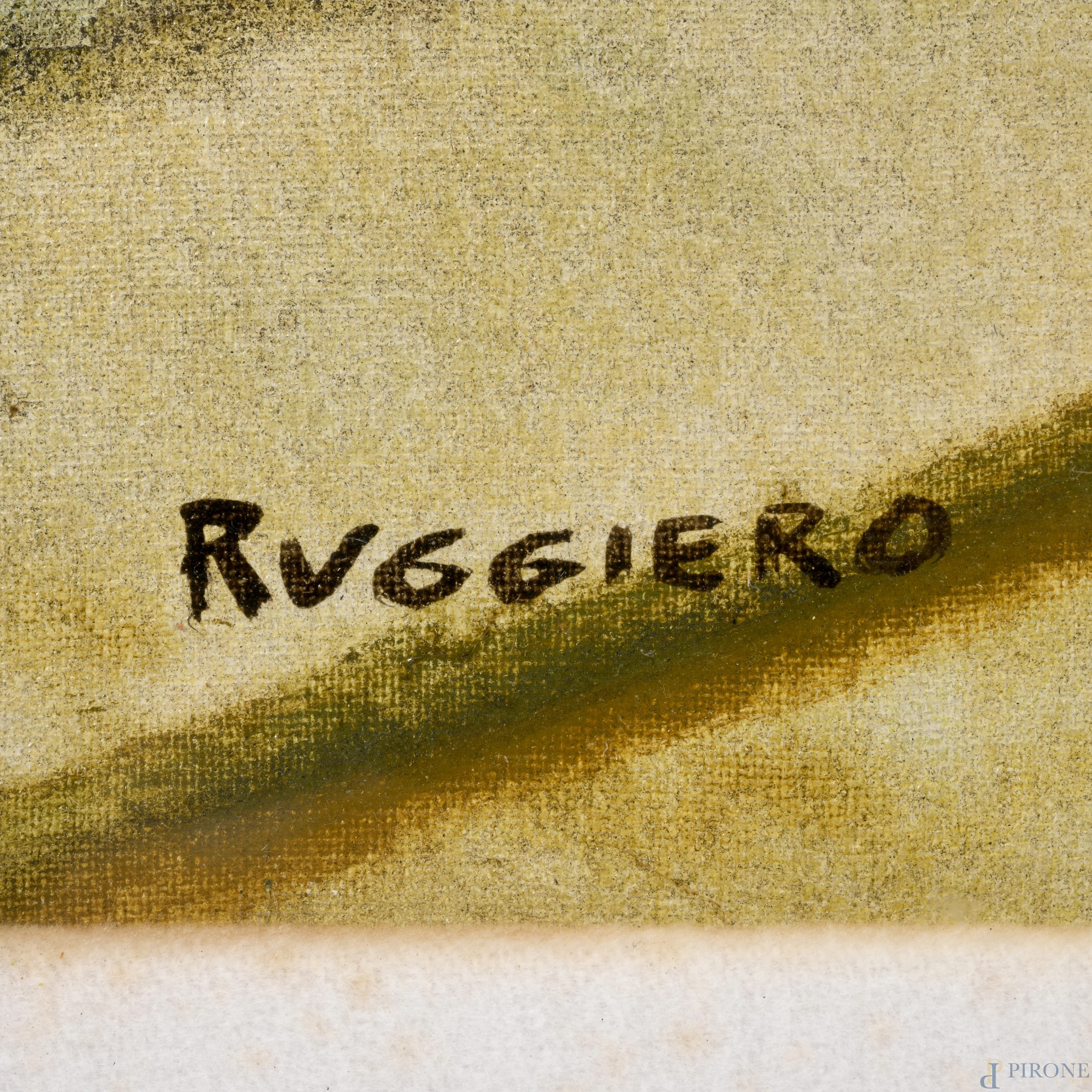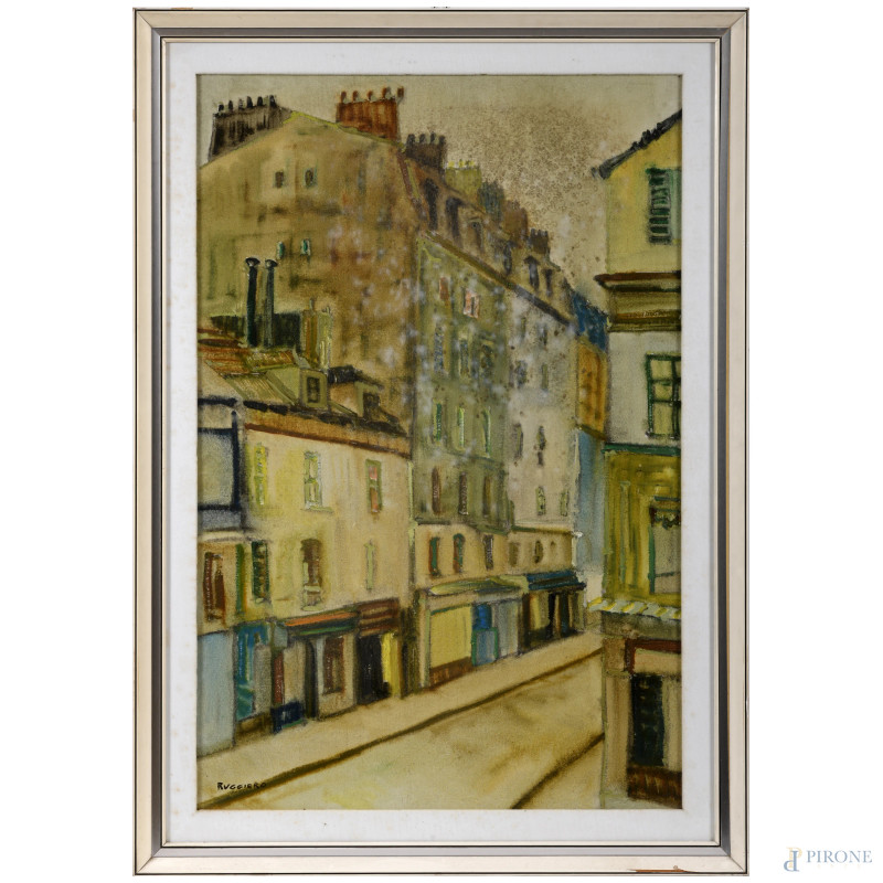 Scorcio di via, XX secolo, olio su tela, cm 89,5x60 , firmato in basso a sinistra, entro cornice, (tracce di umidità e muffa)