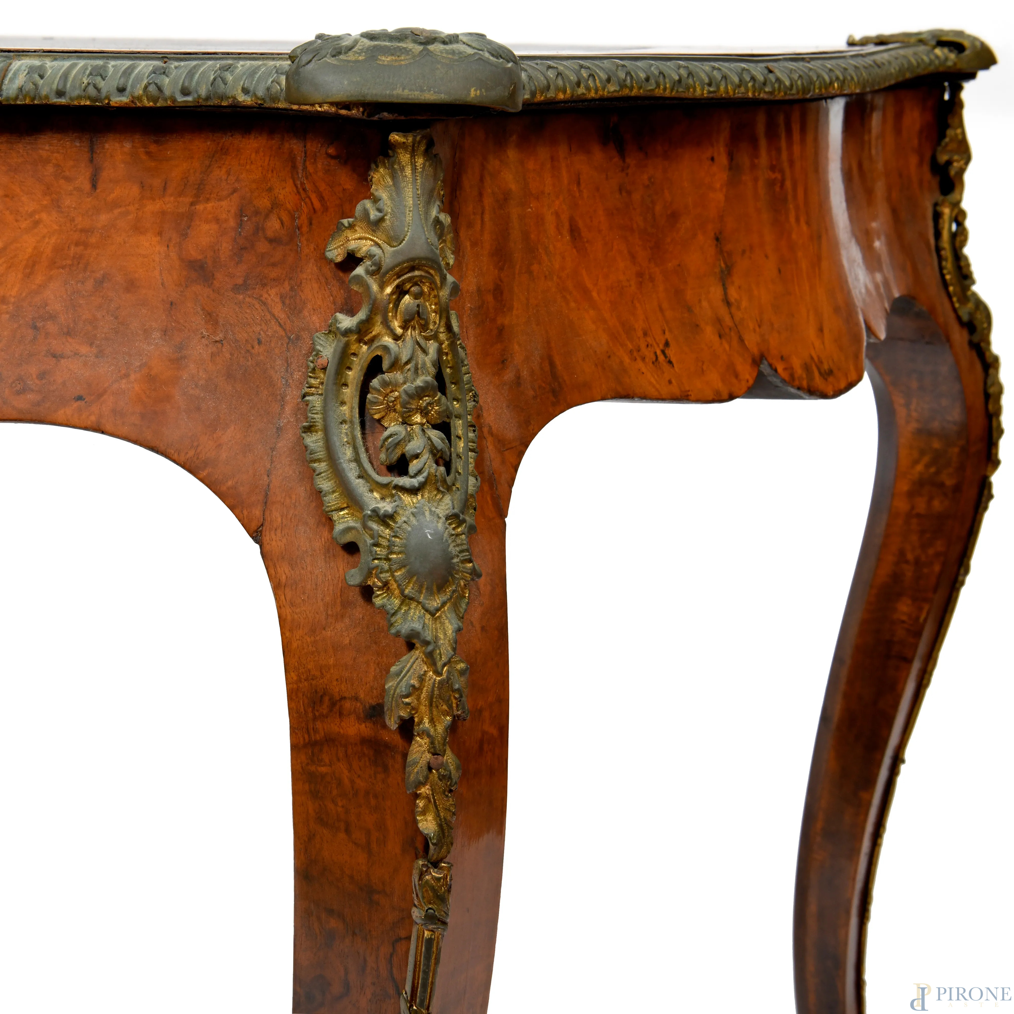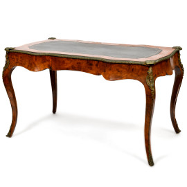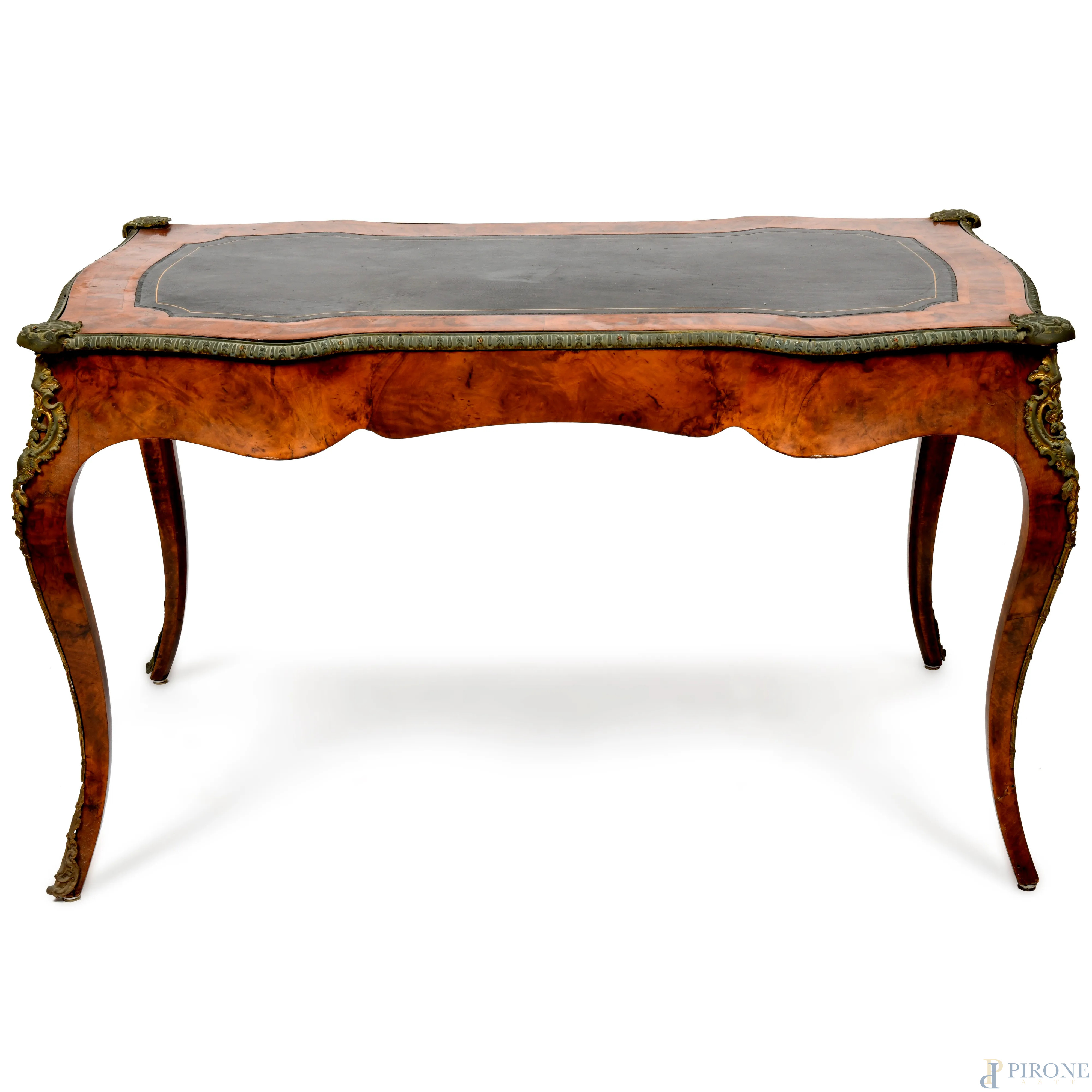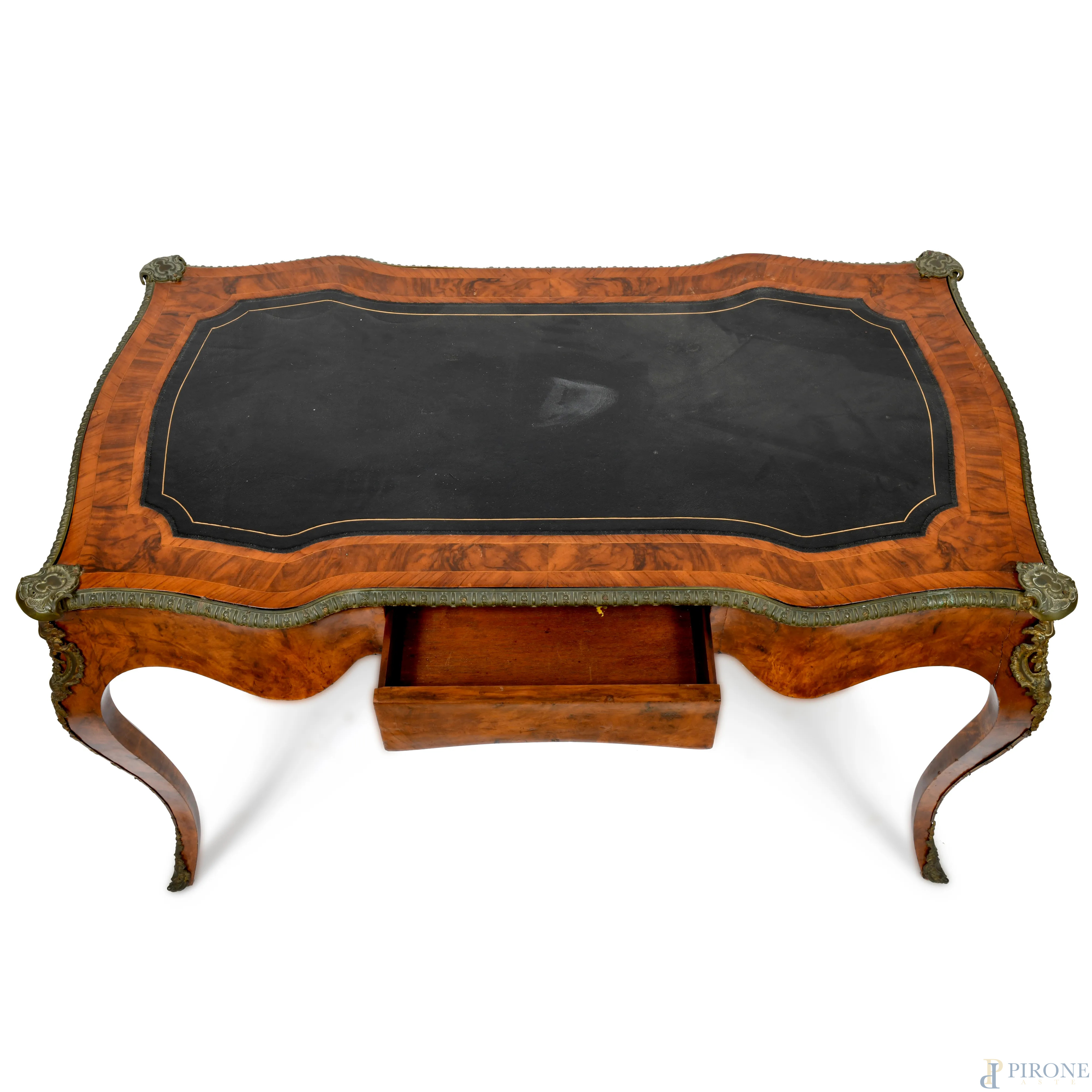 Scrittoio in legno impiallacciato in varie essenze. Gambe mosse e inserti in bronzo. Piano in cuoio nero con decori oro. XX secolo, cm 72x122x71,(segni di scalfiture, graffi, sollevamenti impiallacciatura)