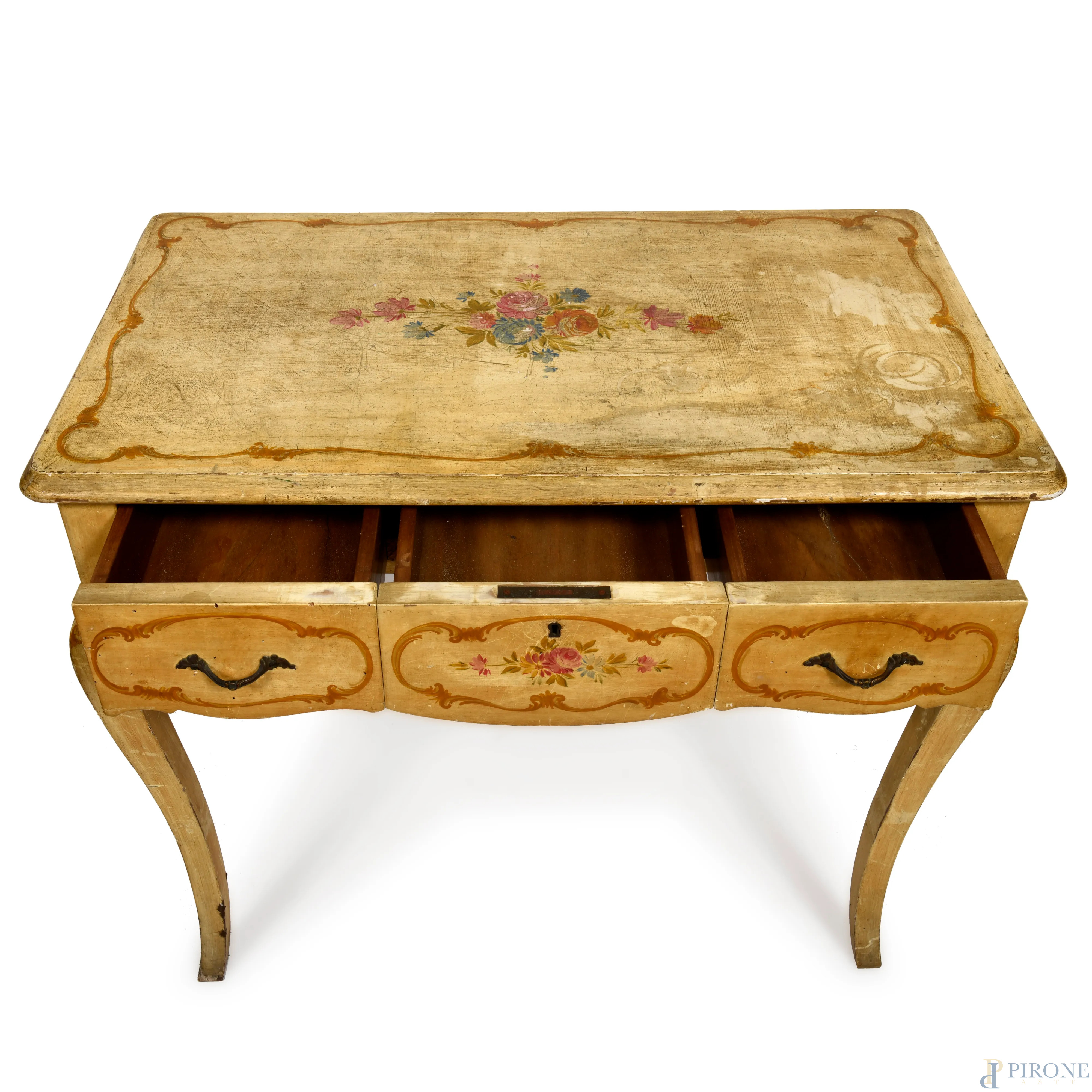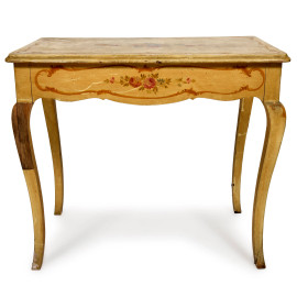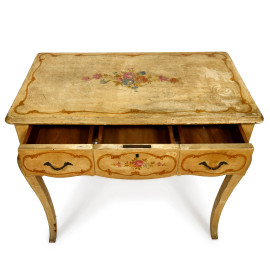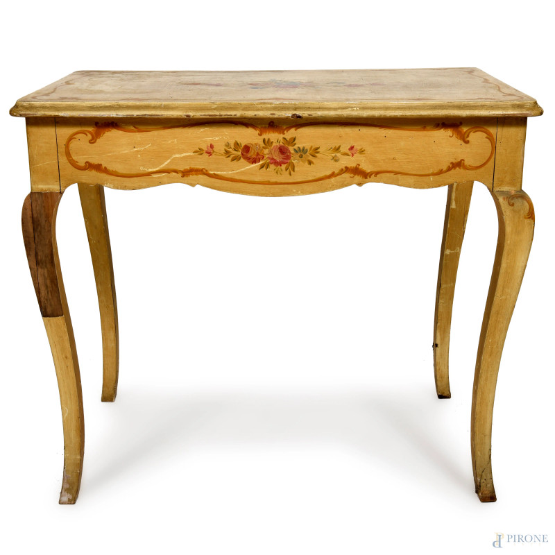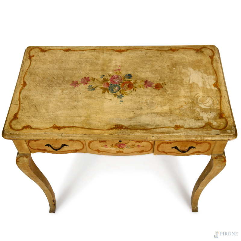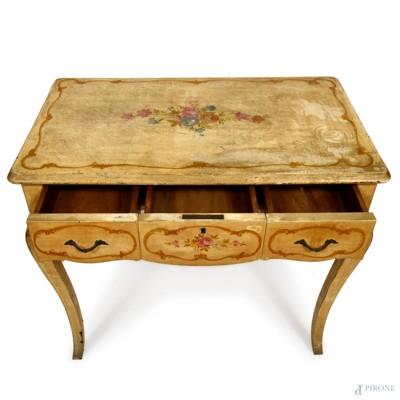 Scrittoio in legno laccato e decorato a motivi floreali, con tre cassetti e gambe mosse, XX secolo, cm 76x87x50, (segni di usura, cadute colore, scalfiture, fessurazioni)
