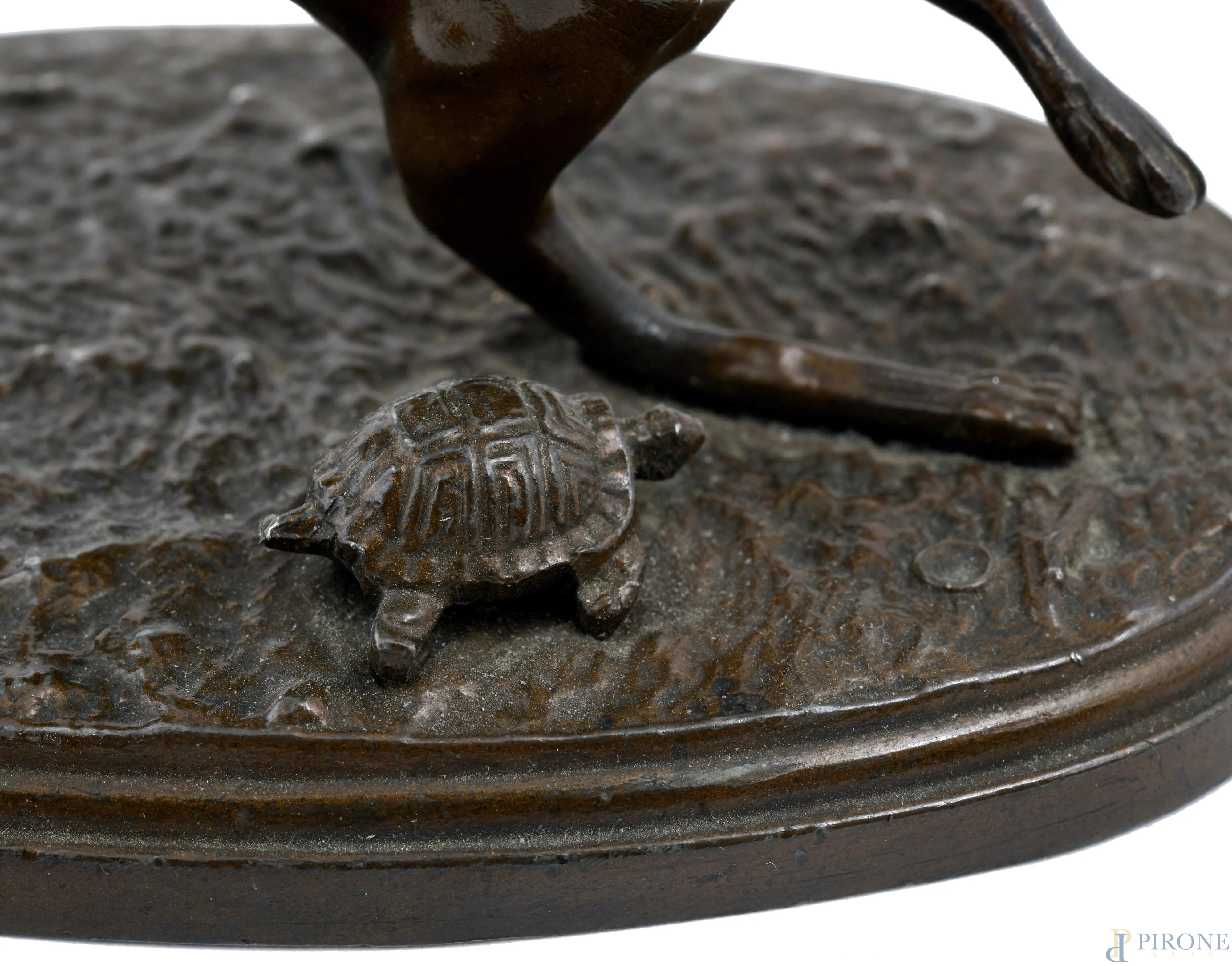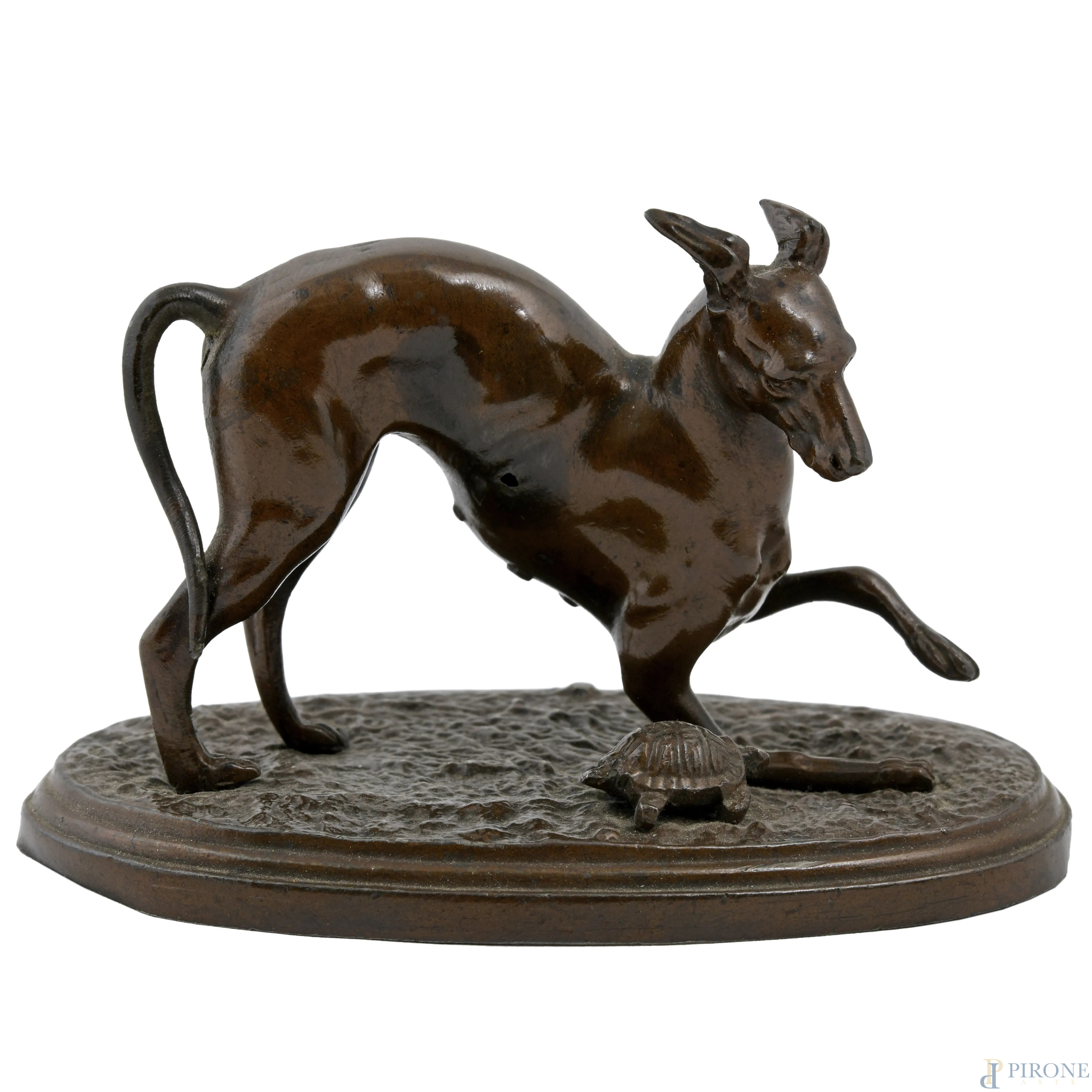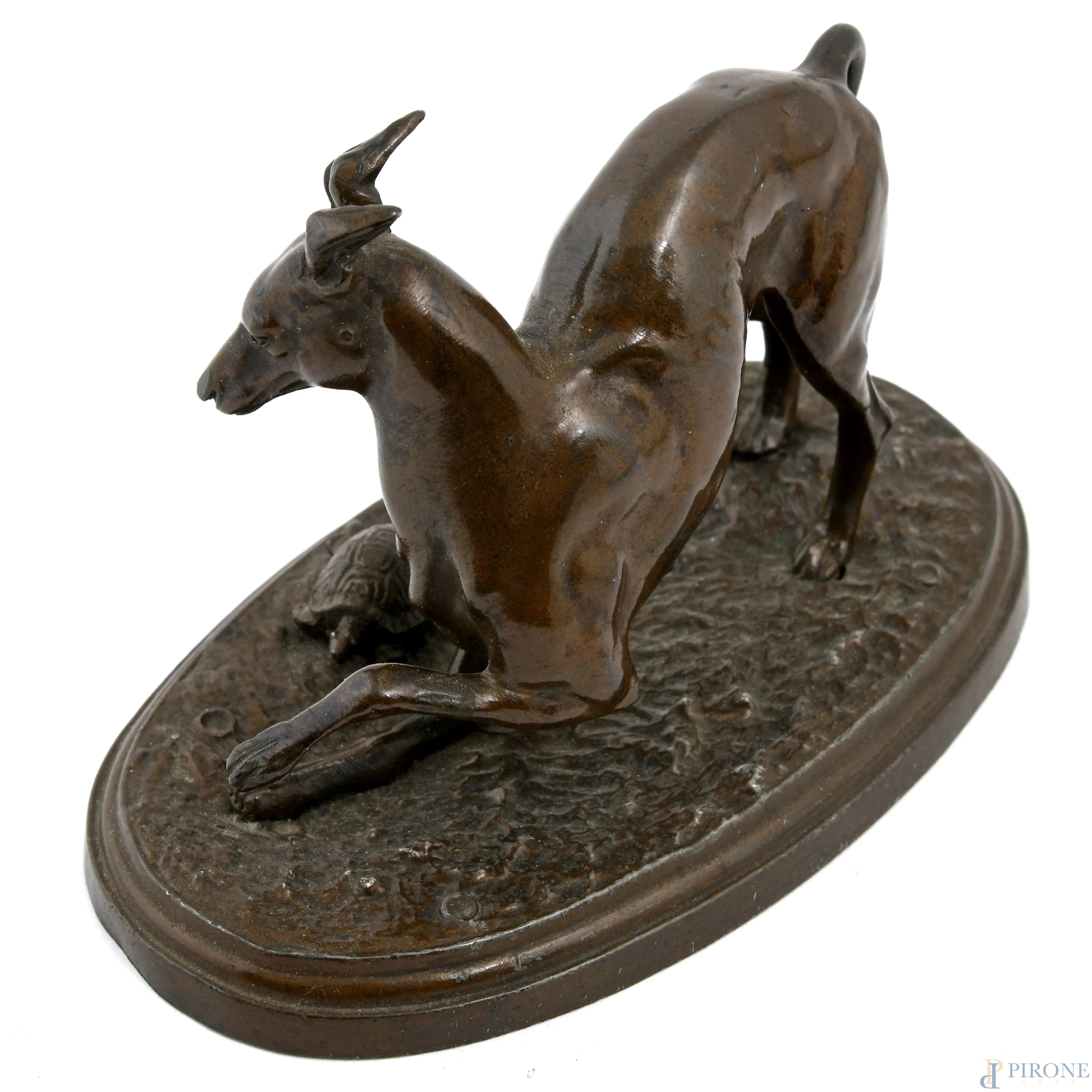 Scultura in bronzo patinato raffigurante levriero con tartaruga, XX secolo, cm 7,5x13x7,5