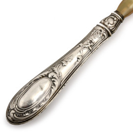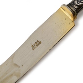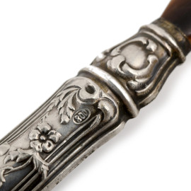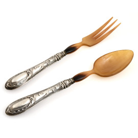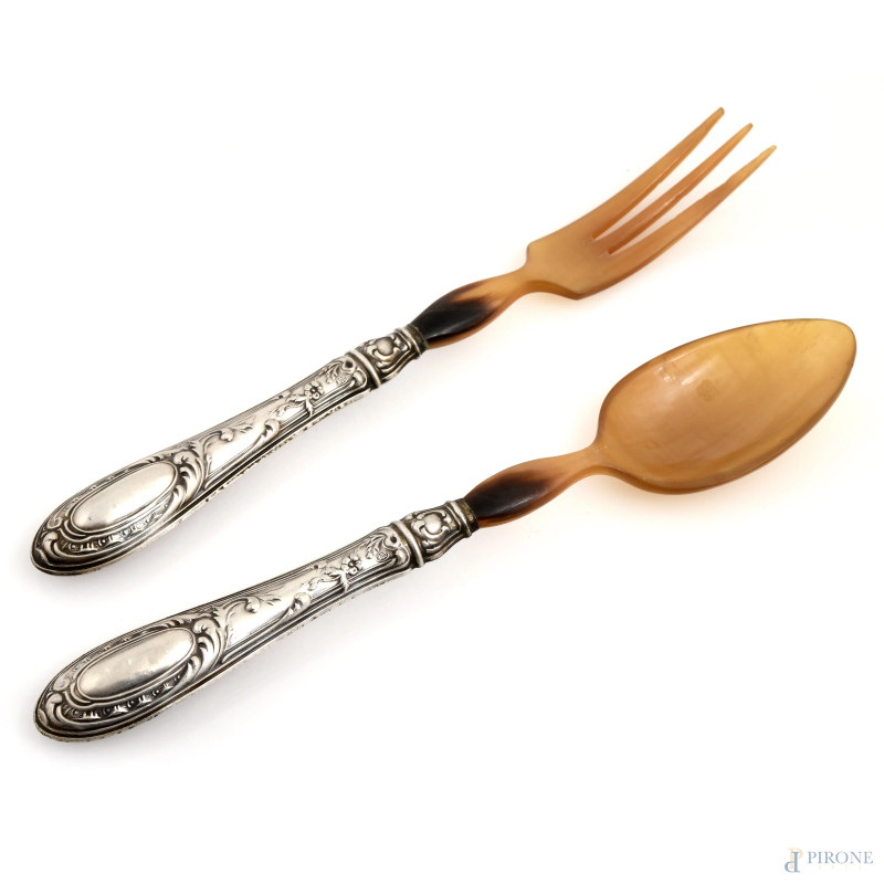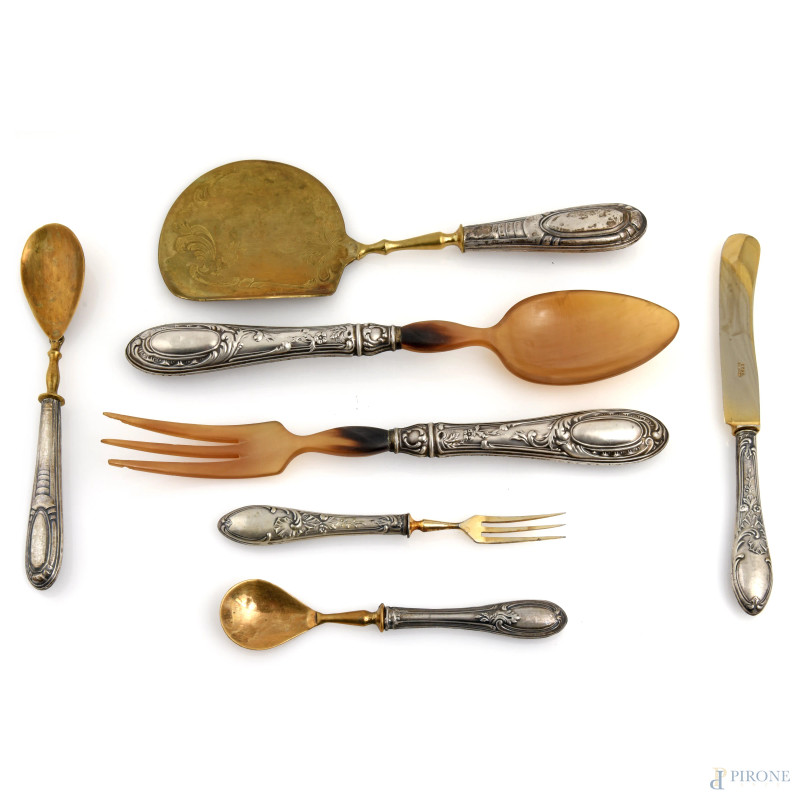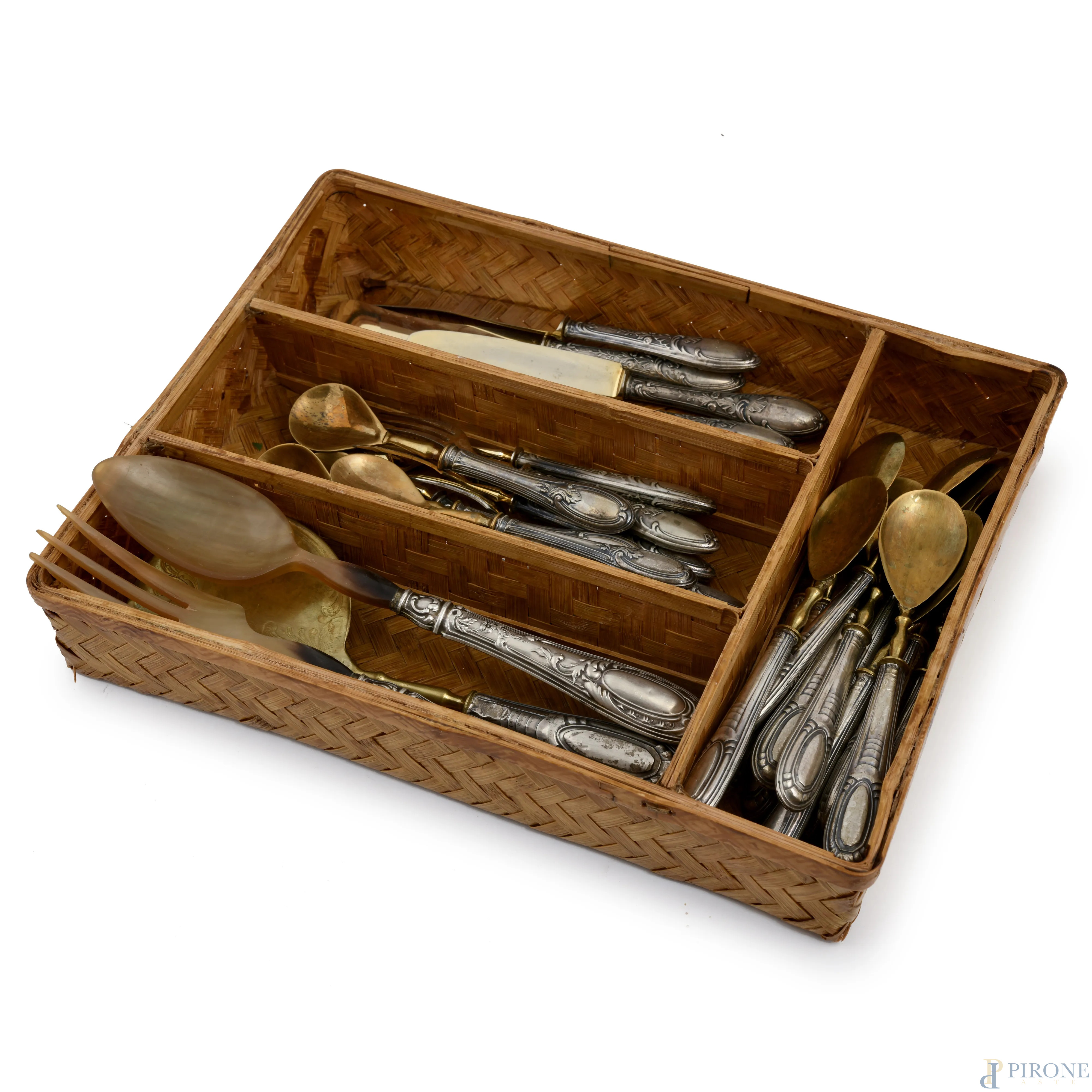 Servizio di posate con manici rivestiti in argento 800, peso lordo totale gr 990, lunghezza massima cm 25, (segni di usura del tempo)