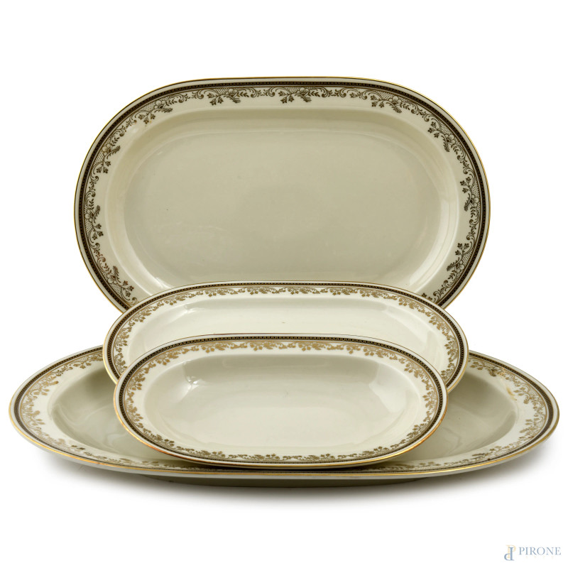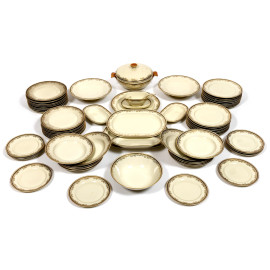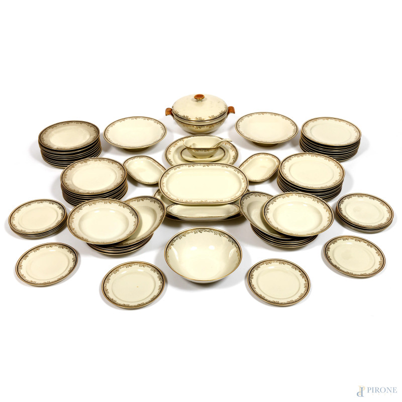 12 piatti fondi; 35 piatti piani; 12 piattini da dolce; 1 zuppiera con coperchio; 1 ciotola; 1 salsiera con mestolo; 5 fiamminghe da portata di varie misure; 2 alzate; 1 piatto da portata