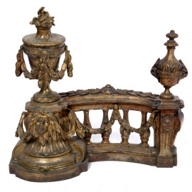 Set da camino in bronzo e bronzo dorato, XX secolo, misure massime lunghezza cm 60, XX secolo, (segni di usura)
