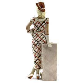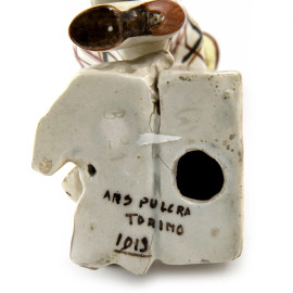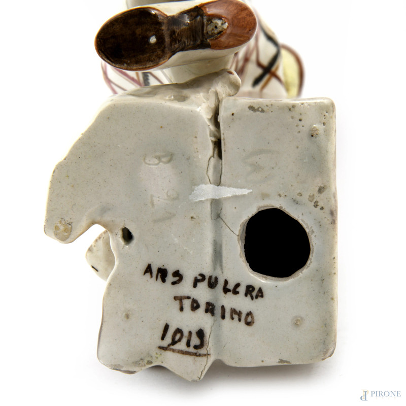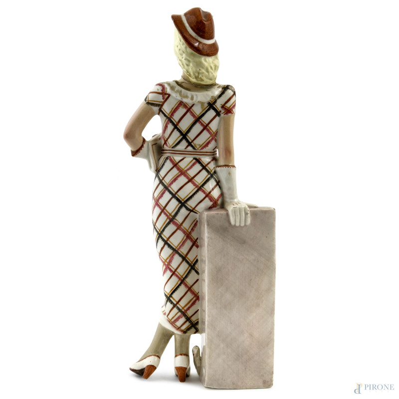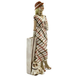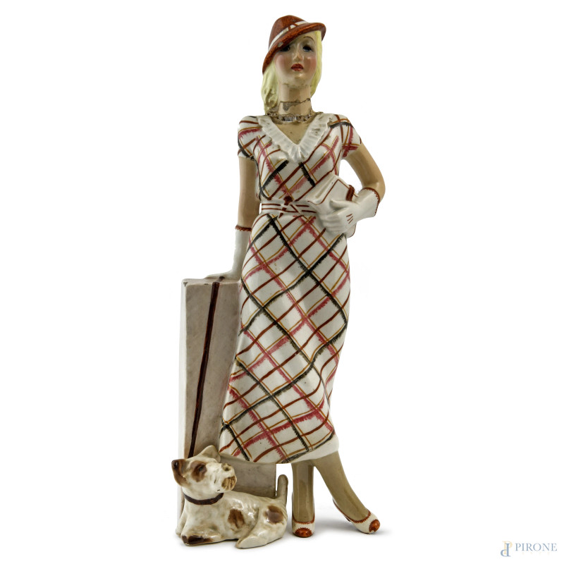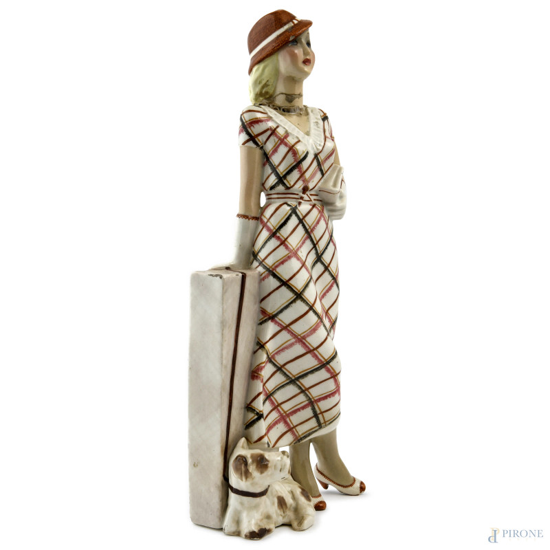 Signora con Terrier , scultura in ceramica policroma, XX secolo, altezza cm 37,5, (difetti, rotture, restauri)