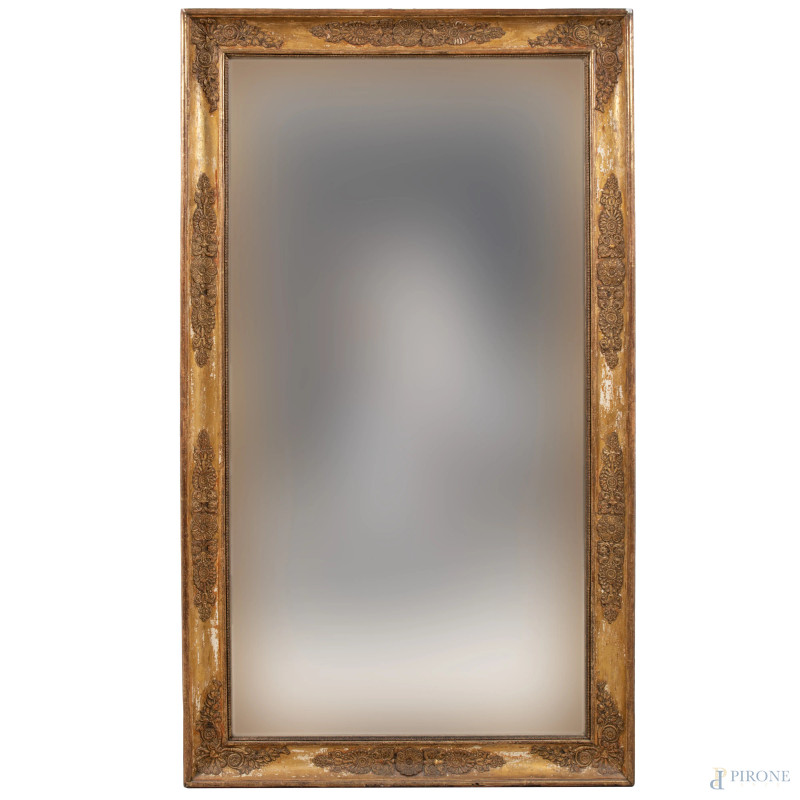 Specchiera in legno dorato e intagliato, XX secolo, cm 153x87