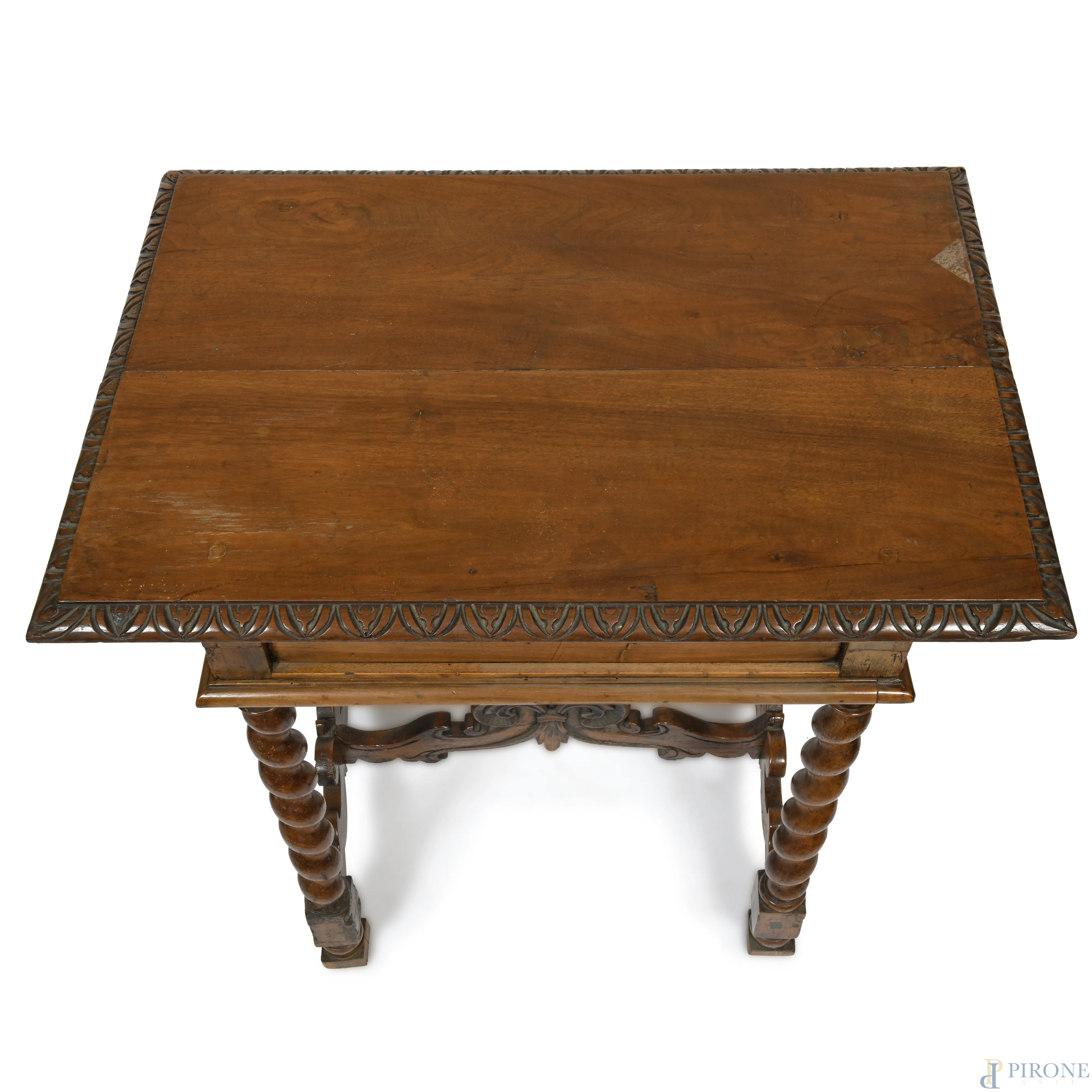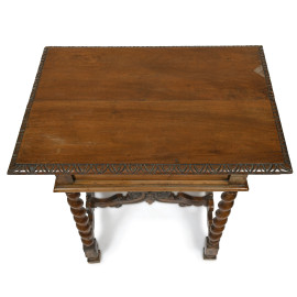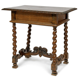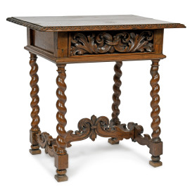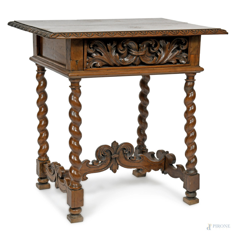 Tavolinetto in noce a un cassetto riccamente intagliato a volute vegetali, con gambe tortili raccordate, XX secolo, cm 83x83x58, (segni di usura, scalfiture, rotture)